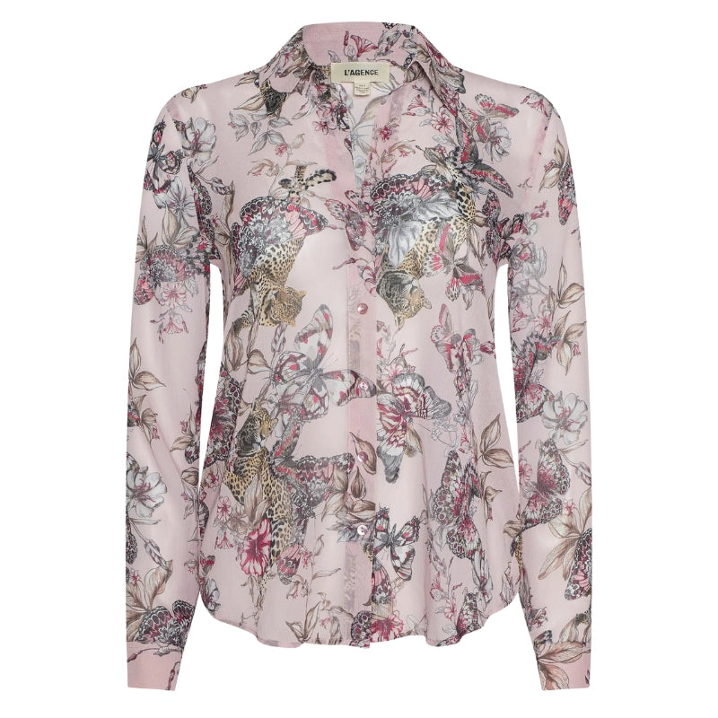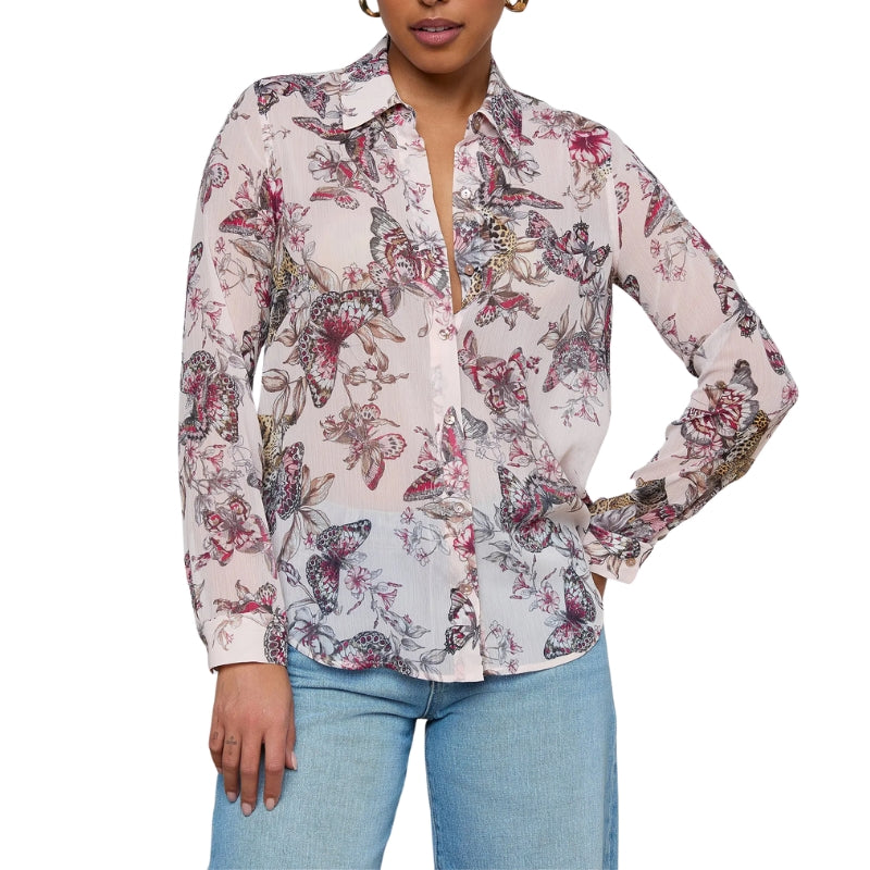 Our relaxed fit long sleeve button-down is back with a butterfly jungle print, equal parts romantic and wild. Crafted from a sheer, lightweight poly chiffon with a subtle crinkle effect, the Laurent is perfect for packing, layering over day dresses, or pairing with your favorite jean.