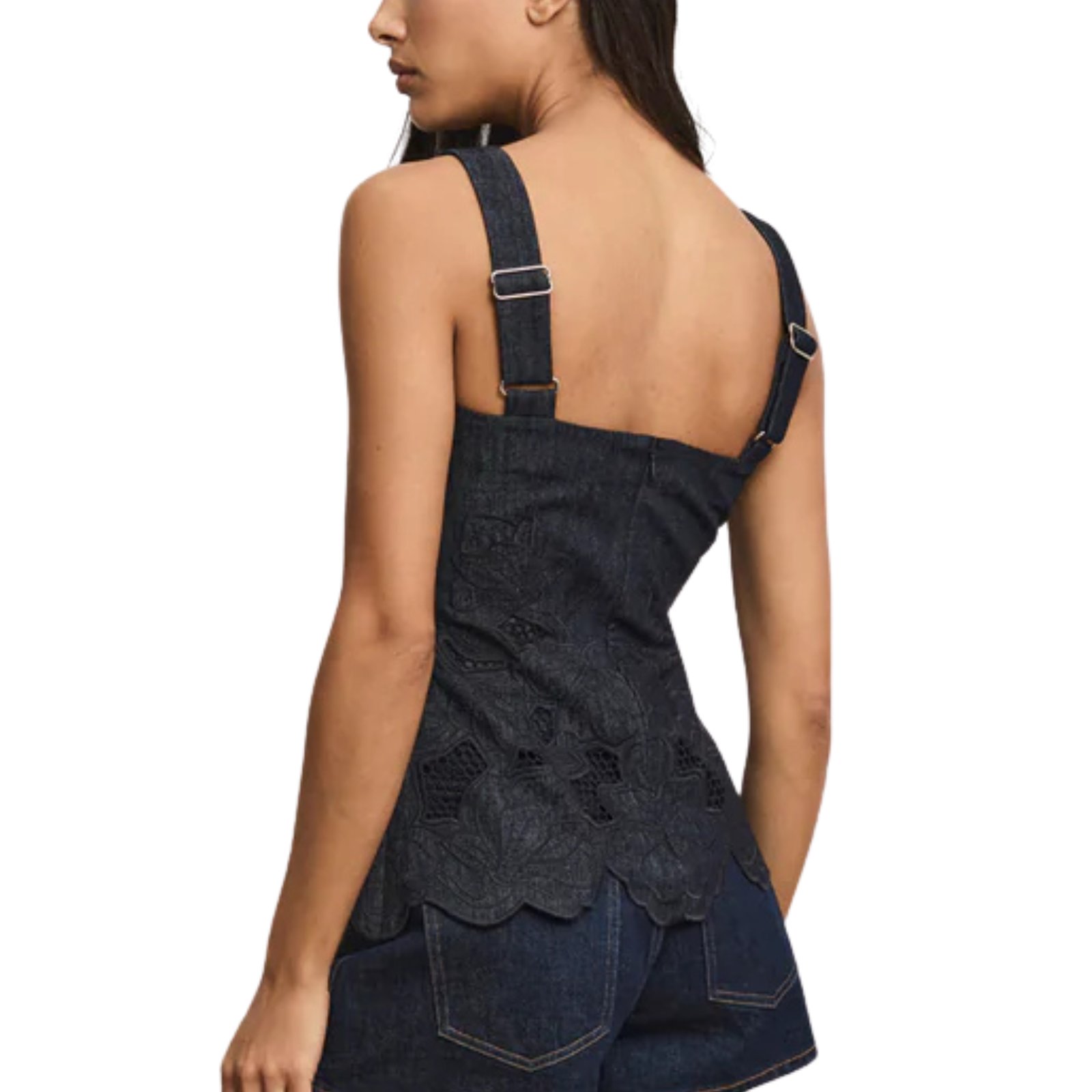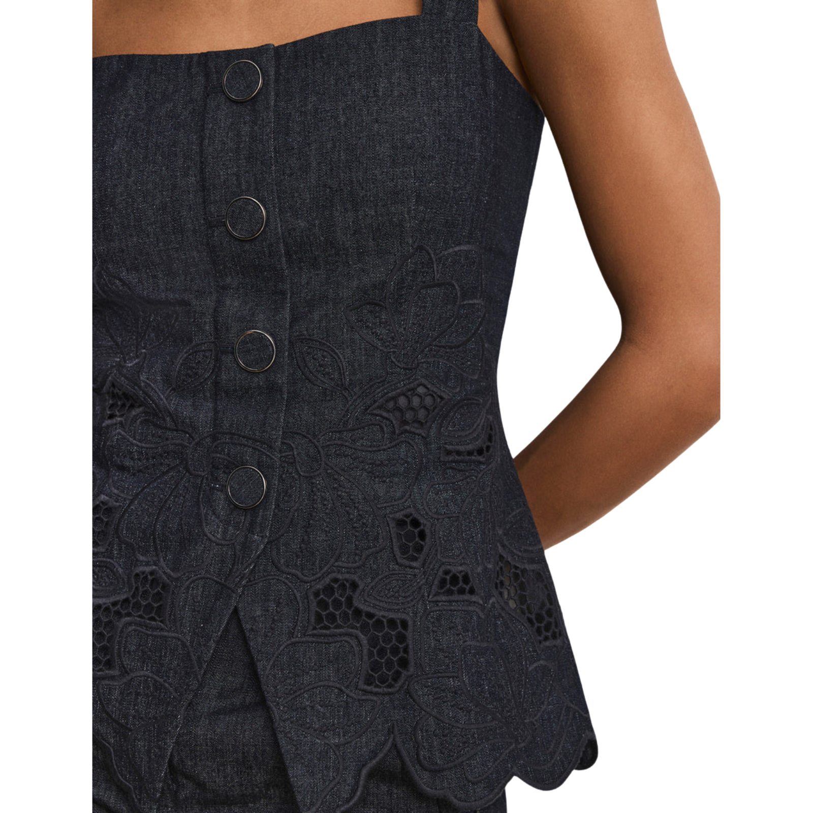 Expertly tailored from premium cotton chambray, the Mirielle top features eyelet panels and a feminine petal-scalloped hem. Designed with a square neckline and adjustable straps, it’s finished with decorative self-covered buttons down the front, a split hem, and a back zipper for easy on-and-off wear. Perfect for elevating the everyday, pair this with the matching Osborne pant.