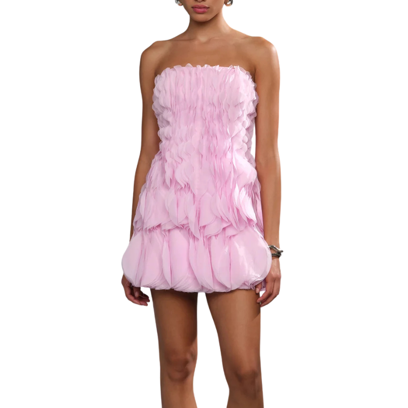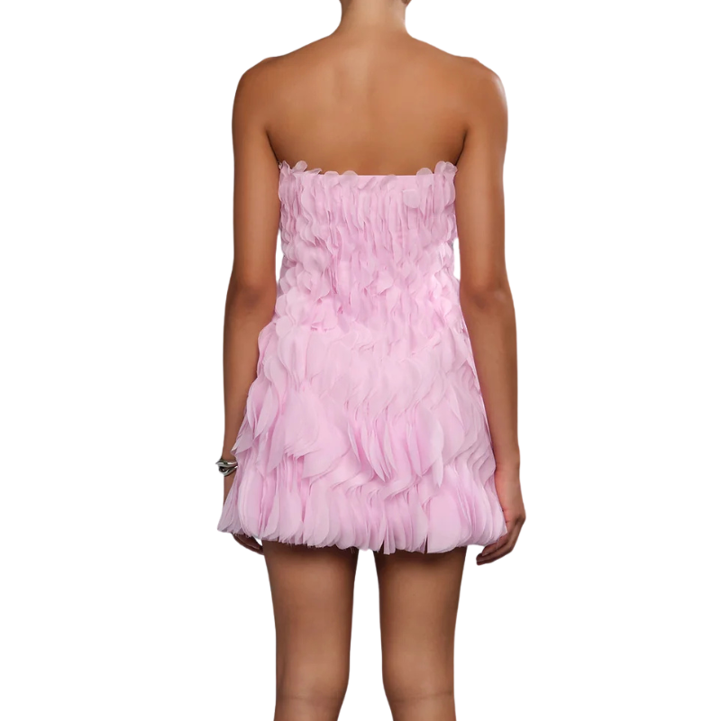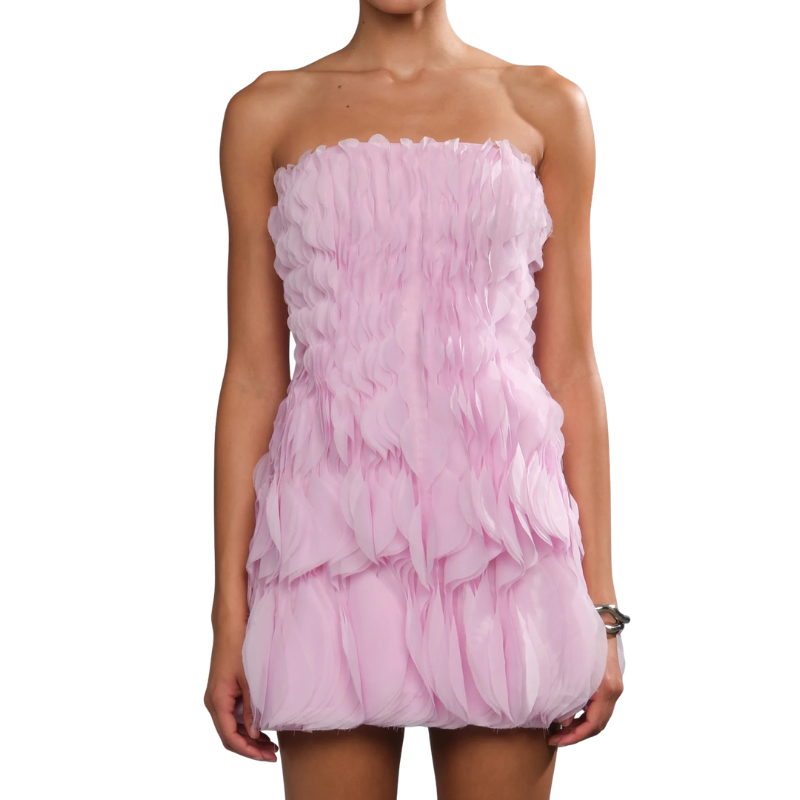 True mini layered in 3D laser-cut chiffon ruffles that build soft, petal-like texture throughout. Light, airy, and unapologetically femme, it’s the kind of piece that feels special the moment you put it on.
