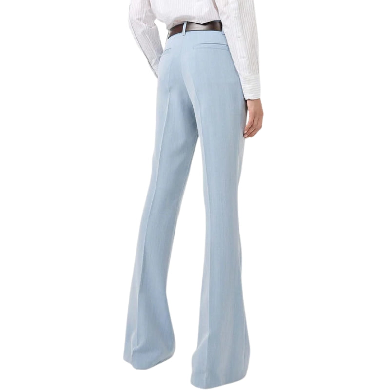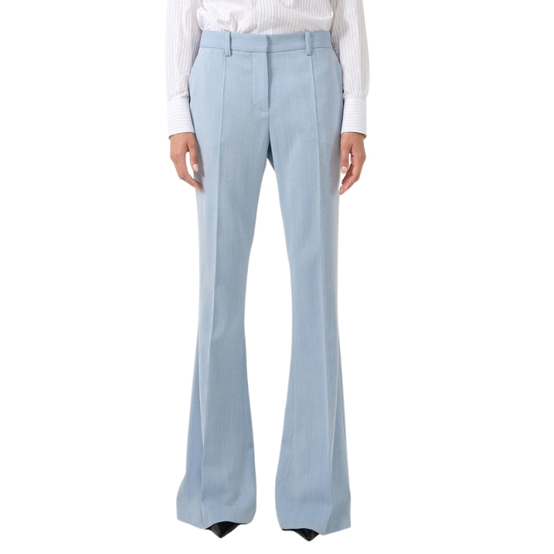 Tailored in a sky-blue crepe with elegant herringbone motifs, these trousers ensure a sartorial and feminine allure for all your events and ceremonies of the season. Their bootcut fit elegantly flaring over the tip of a heeled sandal and their marked crease traversing the leg accentuate its clean and sharp lines.