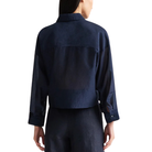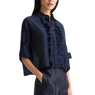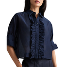 • Features a cropped, boxy silhouette with a ruffled front placket for soft texture and dimension.