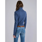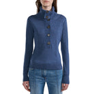 This merino knit sweater, with its chunky winter sweater-inspired volume, offers a lighter reinterpretation with a ribbed collar and placket for an elegant textural effect. This versatile model, buttoned from the chest to the top of the collar, can be worn as a turtleneck or with its collar open thanks to its two buttons. Refined laddering on the front and back adds to the femininity of this women's sweater, available in black or denim blue merino wool.