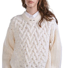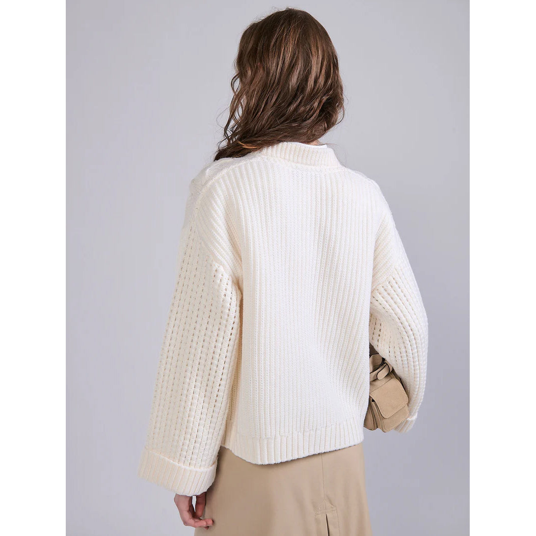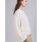 The epicenter of a feminine and elegant winter outfit, this ivory merino wool sweater revisits the timeless cable-knit sweater in an ultra-contemporary version. To achieve this unique textural effect, Barbara Bui's workshops have opted for several knitting stitches, a testament to their expertise. Wide sleeves, ribbing and oversized twists make this sweater as comfortable as it is sculptural. At the collar, this sweater is accessorized with Barbara Bui's silver metal piercing, the House's signature.