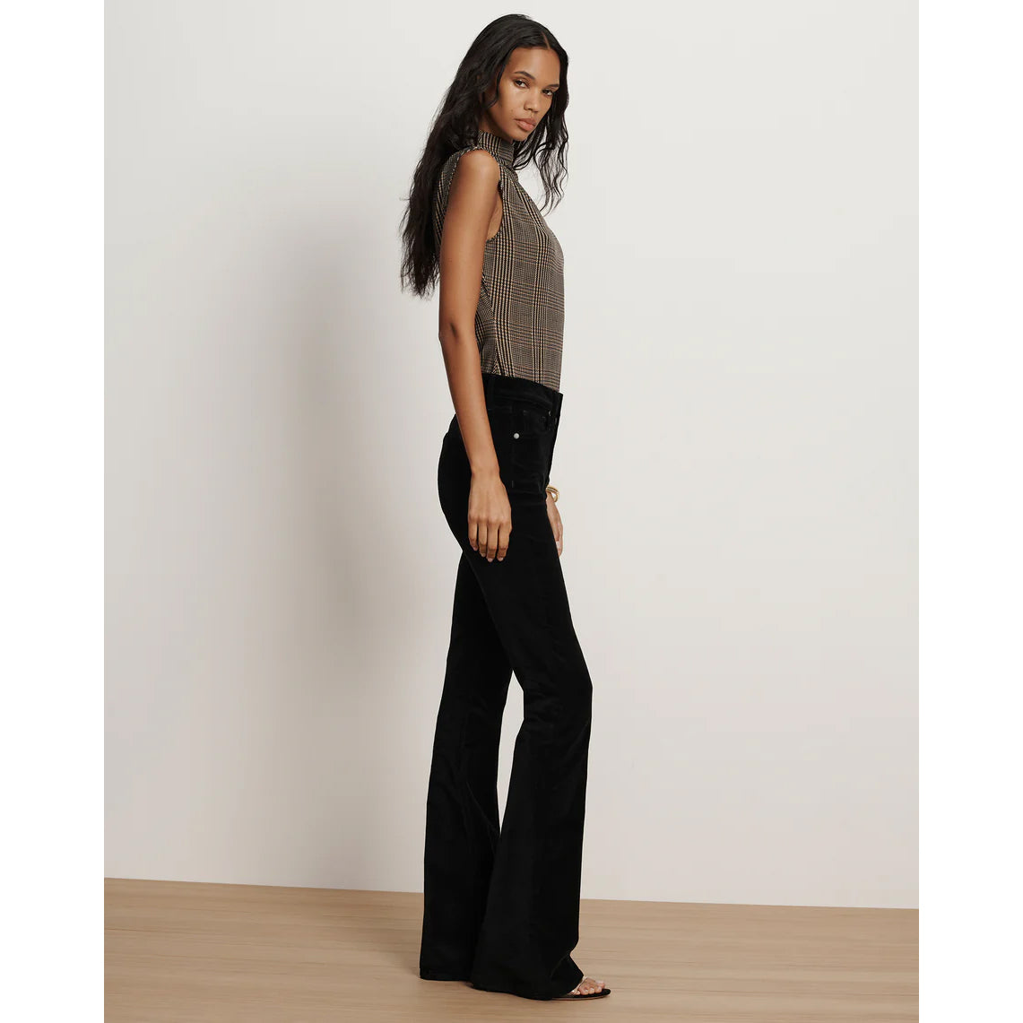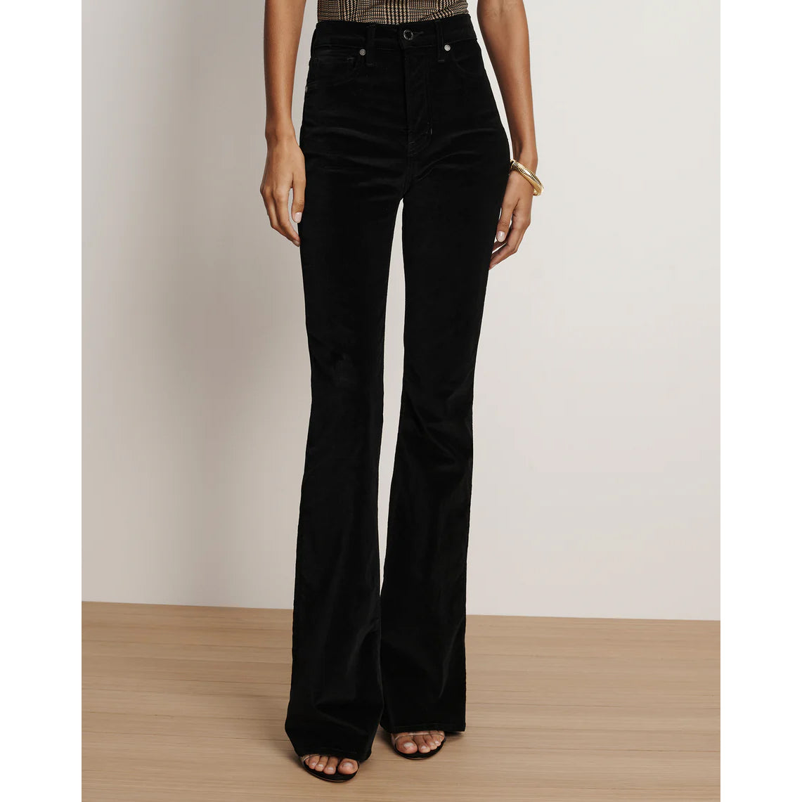 The best-selling Beverly—now in sleek stretch black velvet. It features the same high-rise waist and subtle flare you know and love, fitted through the hips and thighs for a flattering, legs-for-days effect. Tuck in any of our tops and add sky-high heels for an elongating, head-turning look.