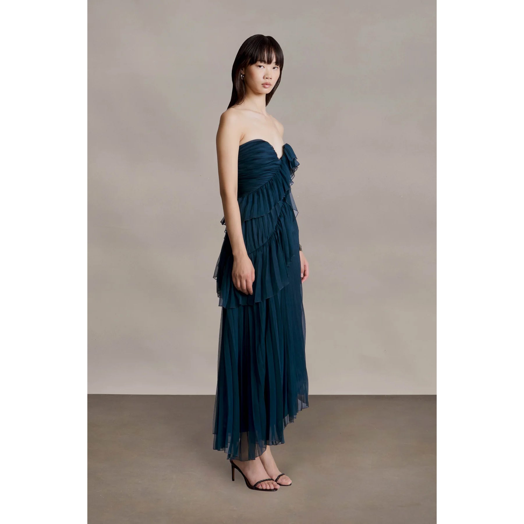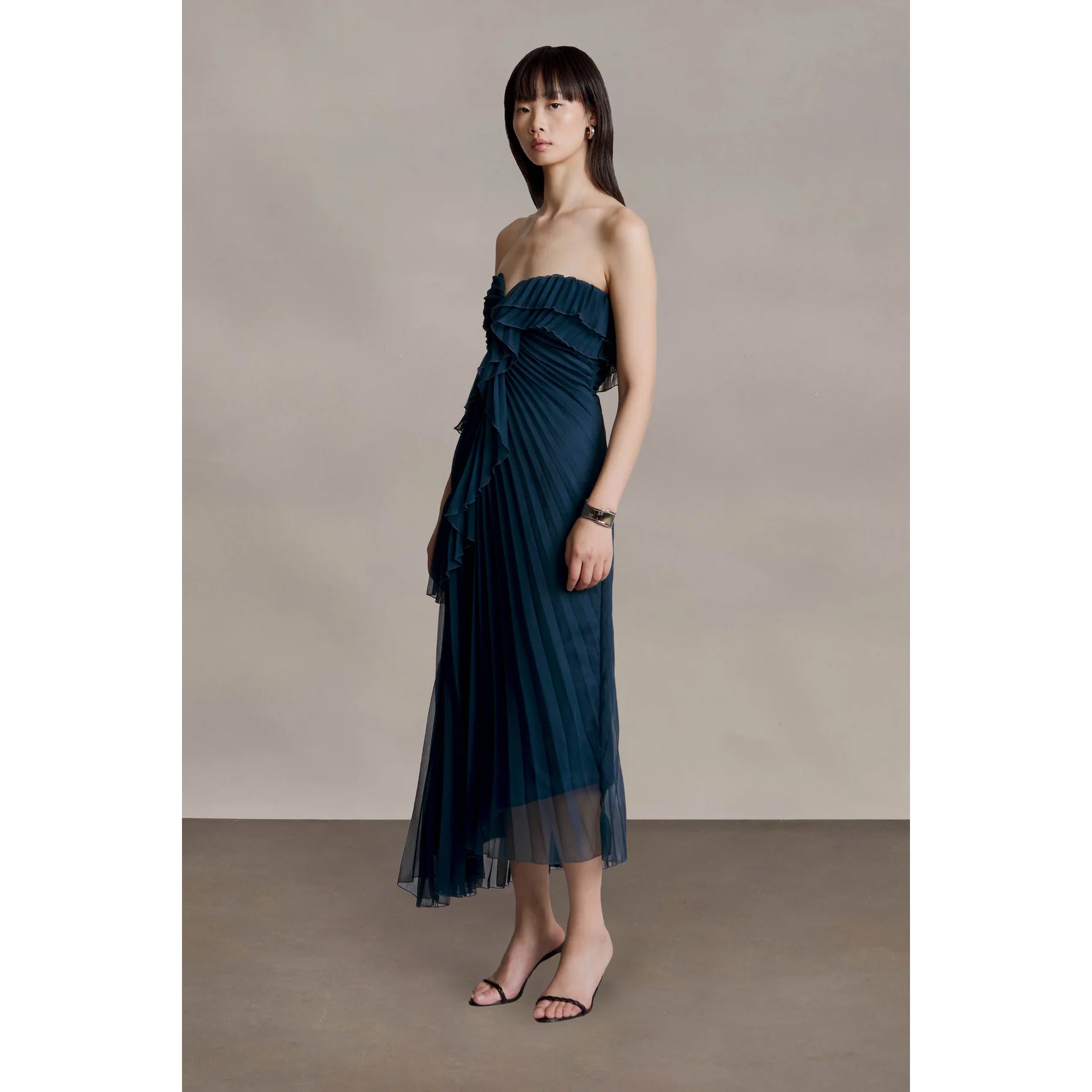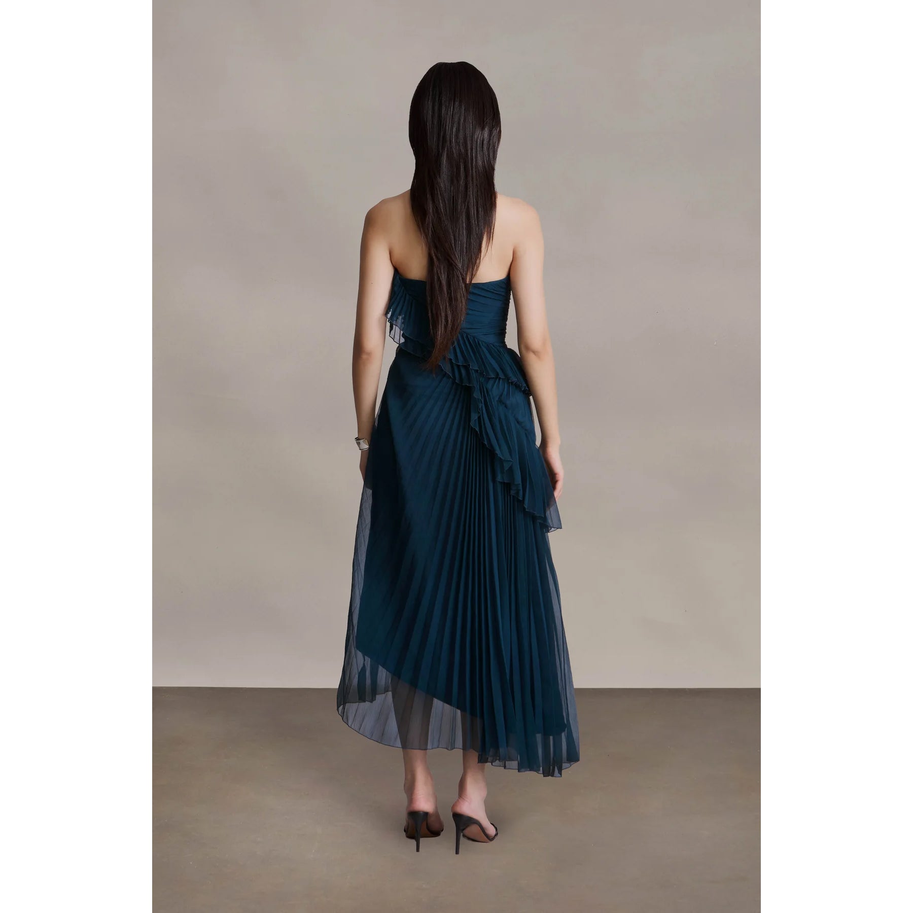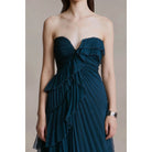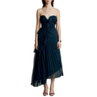 Crafted from airy chiffon, this strapless midi features a ruched sweetheart bodice and a cascade of pleats trimmed with delicate pearl-stitched edges. Flowy, flirty, and ready for any RSVP that calls for a little charm.