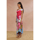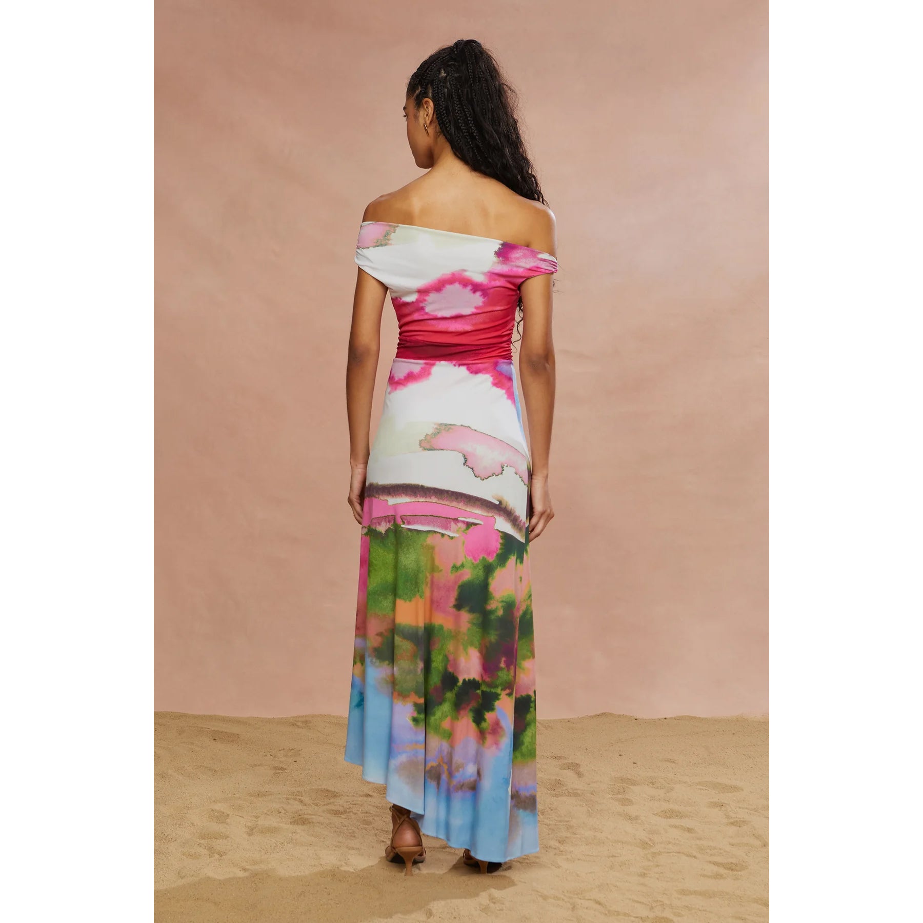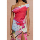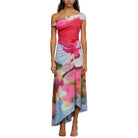 Printed in soft, stormy hues, this asymmetric jersey dress hugs in all the right places with side ruching and a draped off-shoulder neckline. Easy, dreamy, and ready for whatever the night brings.
