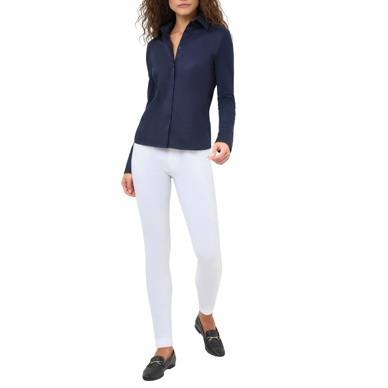 Meet the perfect elevated take on the classic button-up white shirt. This stylish women's button-up shirt features a modern slim fit silhouette and flattering designer seaming. A timeless button front-closure and bold menswear-inspired collar add a sophisticated feel to this must-have piece. Crafted using Anatomie's signature wrinkle-resistant fabrics, this essential women's top is perfect for slipping on with any look, from casual and cool to polished and professional.