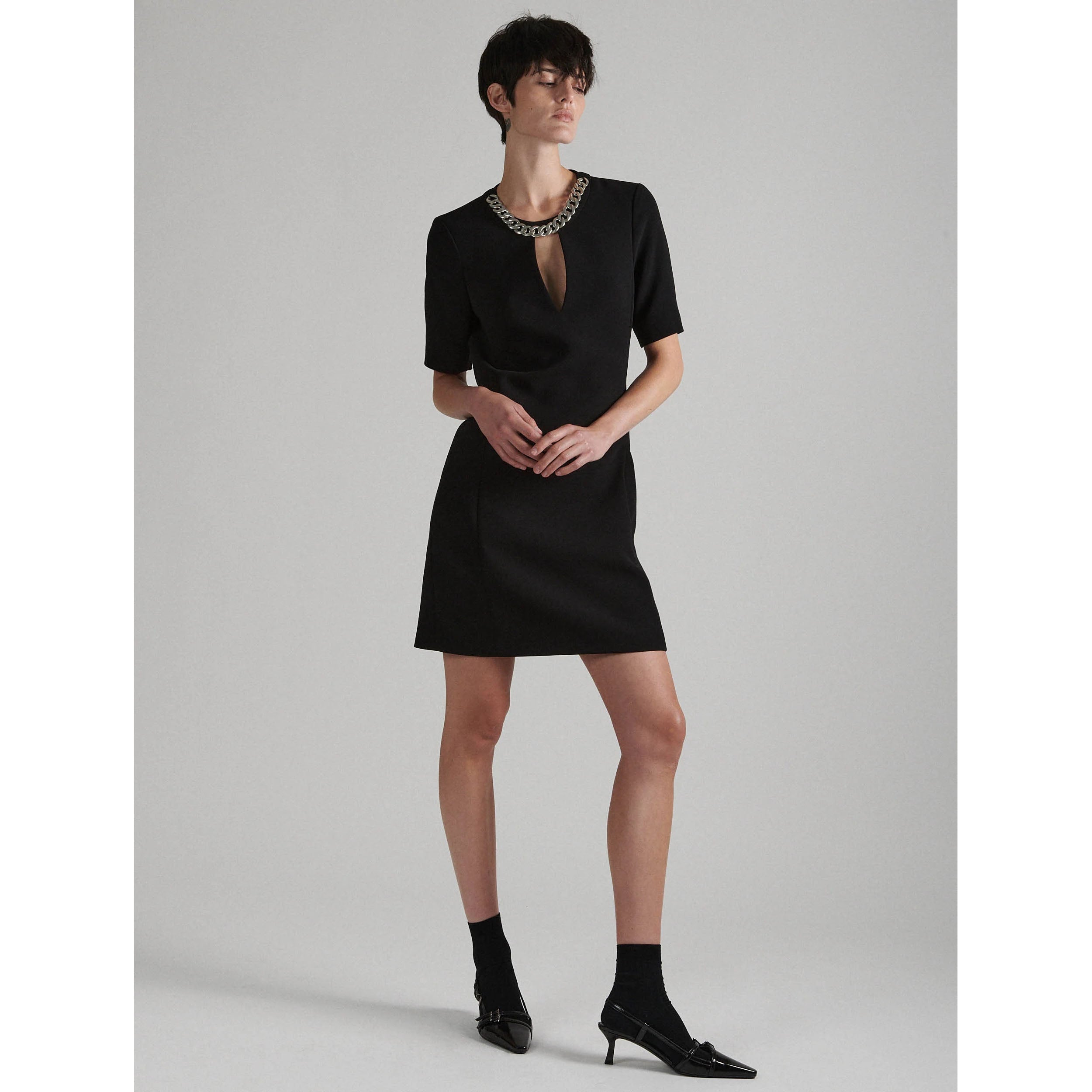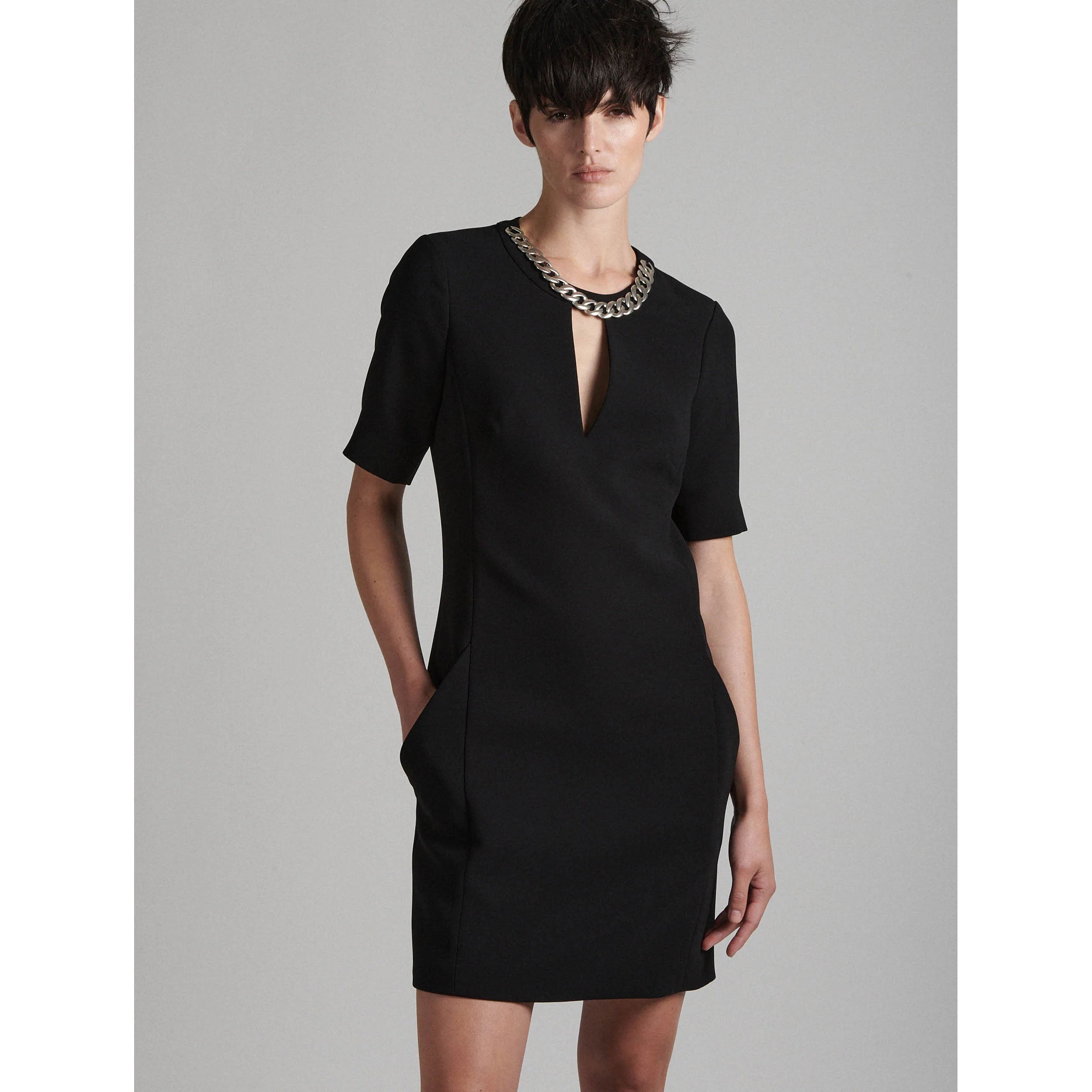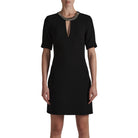 This elegant short-sleeved dress has a straight cut that stops above the knee. A jeweled collar with a gourmets-mesh bib necklace accessorizes this dress, revealing a drop neckline. Crafted in a comfortable crepe with a perfect fall, this timeless dress is ideal for all occasions.