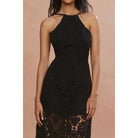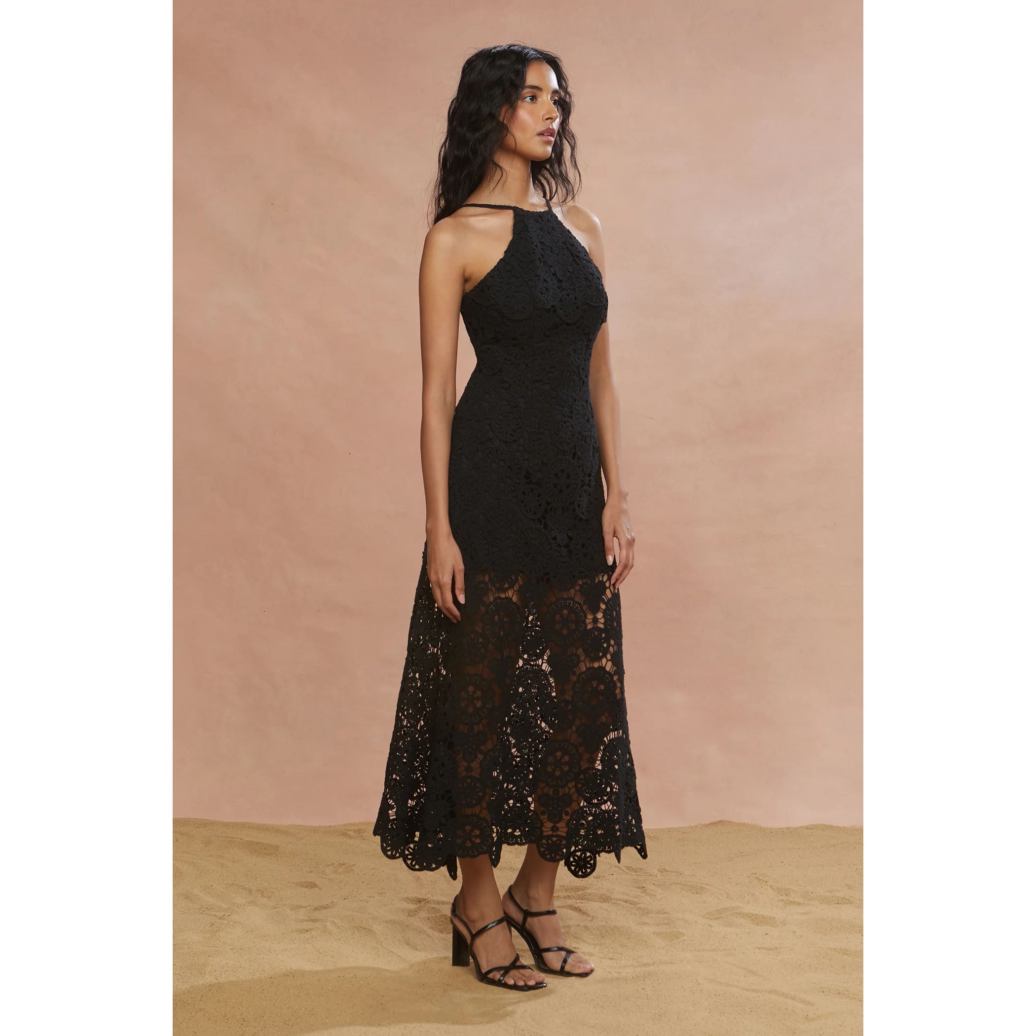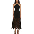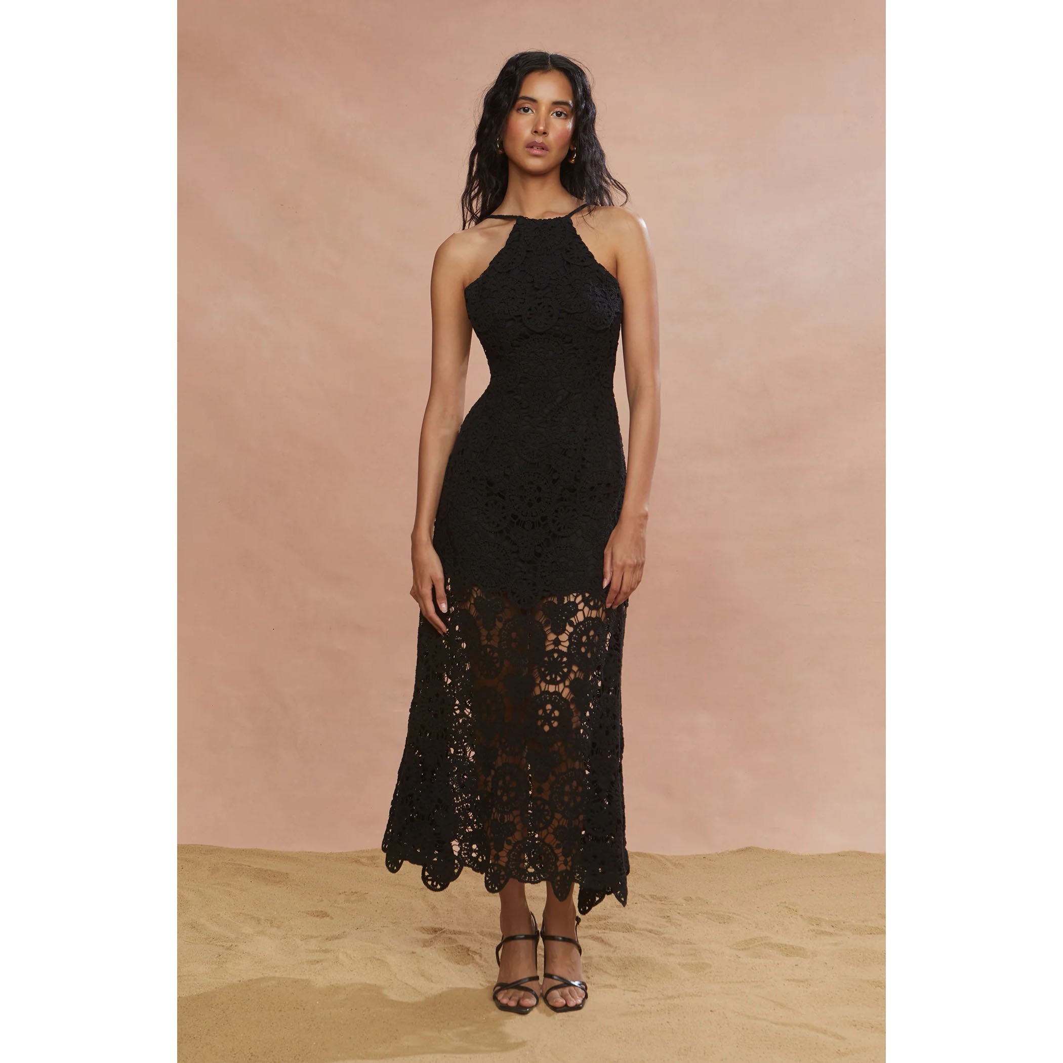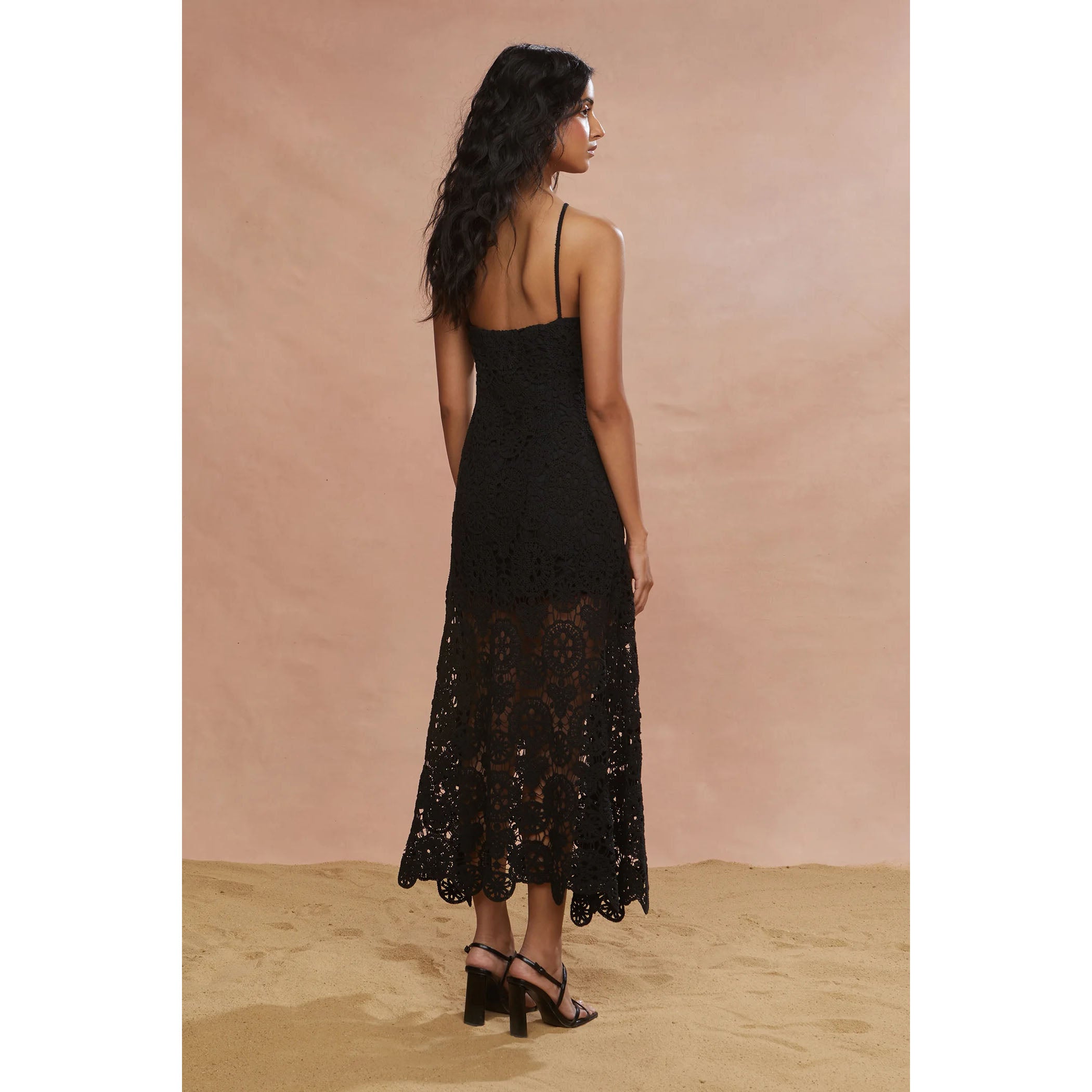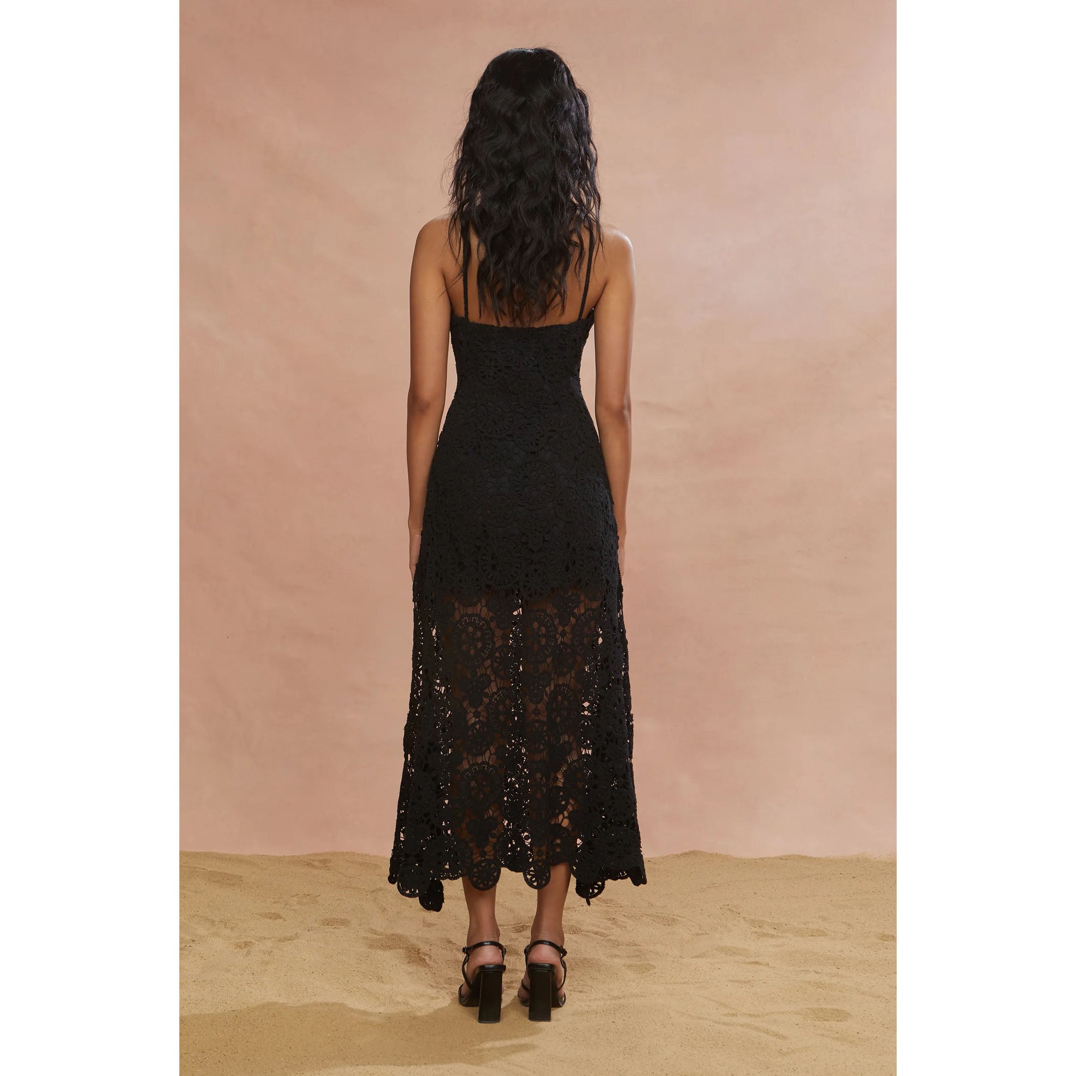 This halter dress is crafted from salvaged-to-salvaged lace crochet with placed straps and a peek-through scalloped hem. A cheeky take on black-tie, perfect for beachside weddings or rooftop dinners.