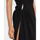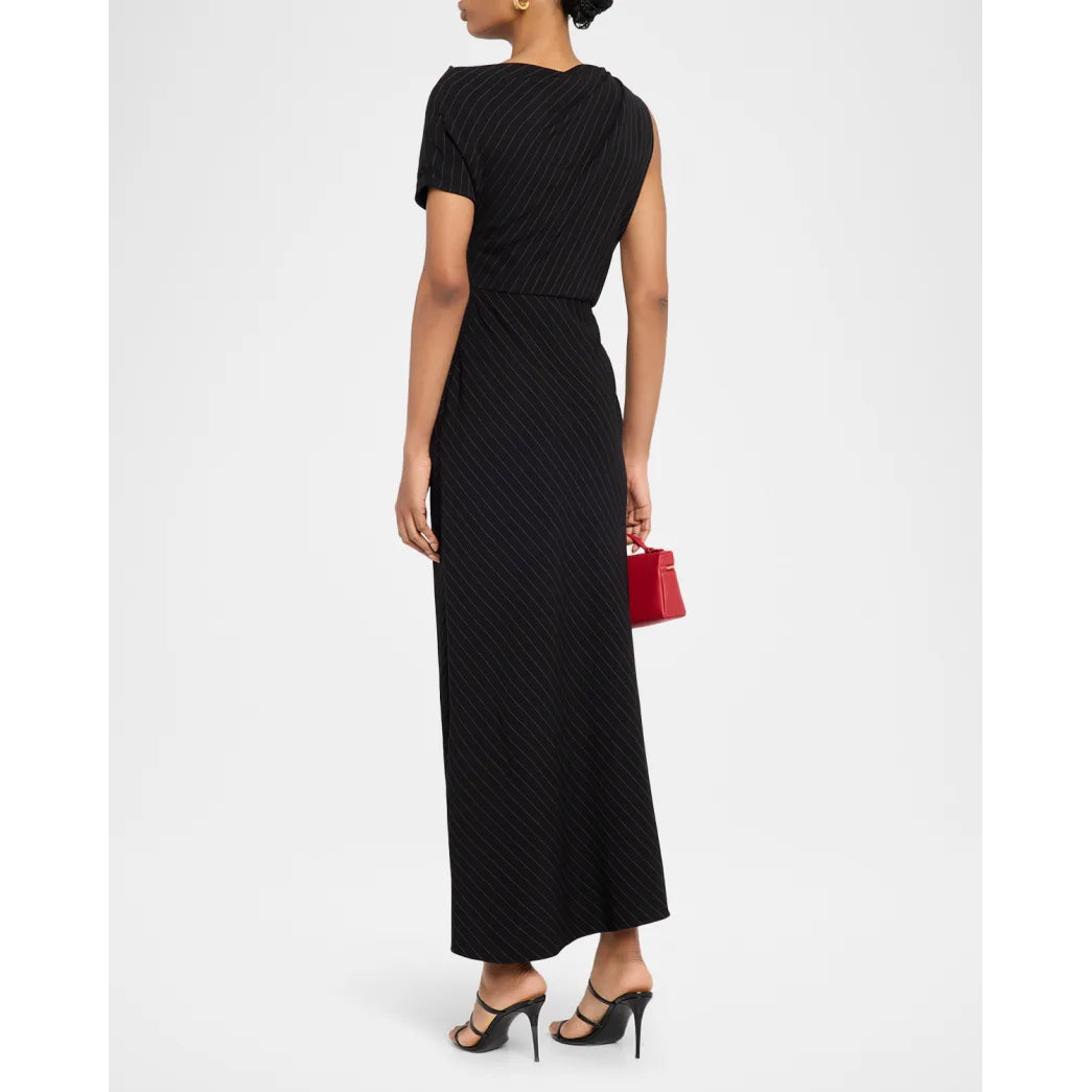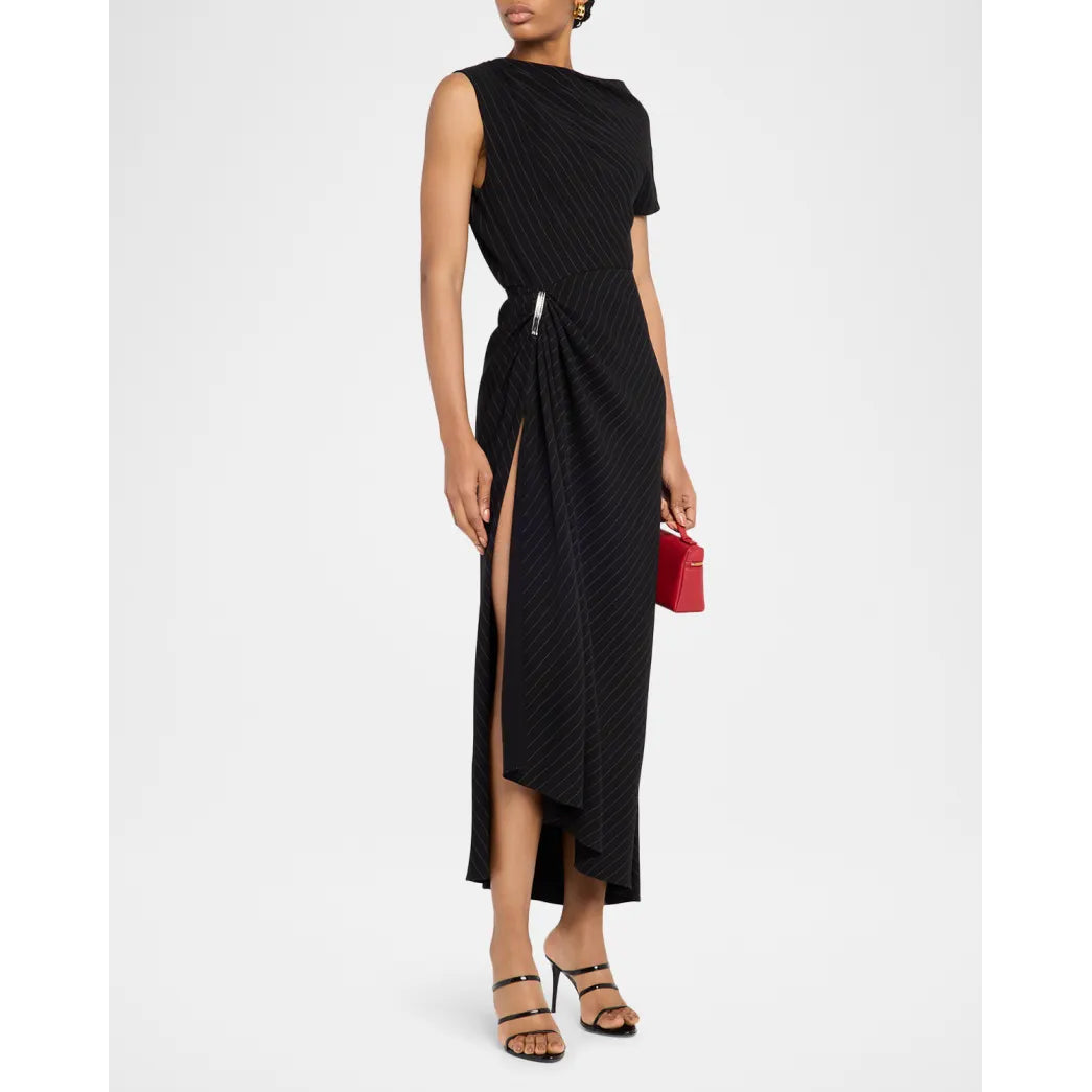 The Lowery Dress by Brandon Maxwell is a modern take on sophisticated tailoring, crafted with striking pinstripes and finished with signature draping and silver-tone hardware. Featuring a high neckline, asymmetric sleeves, and a dramatic thigh-high slit, this piece exudes power and elegance. Designed with a draped silhouette and side zip closure, it blends structured detail with feminine ease.