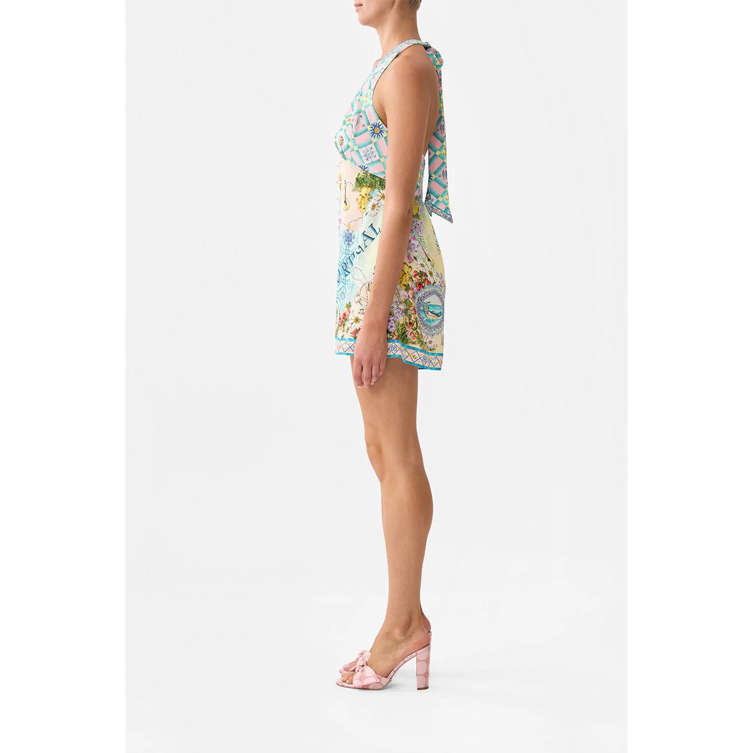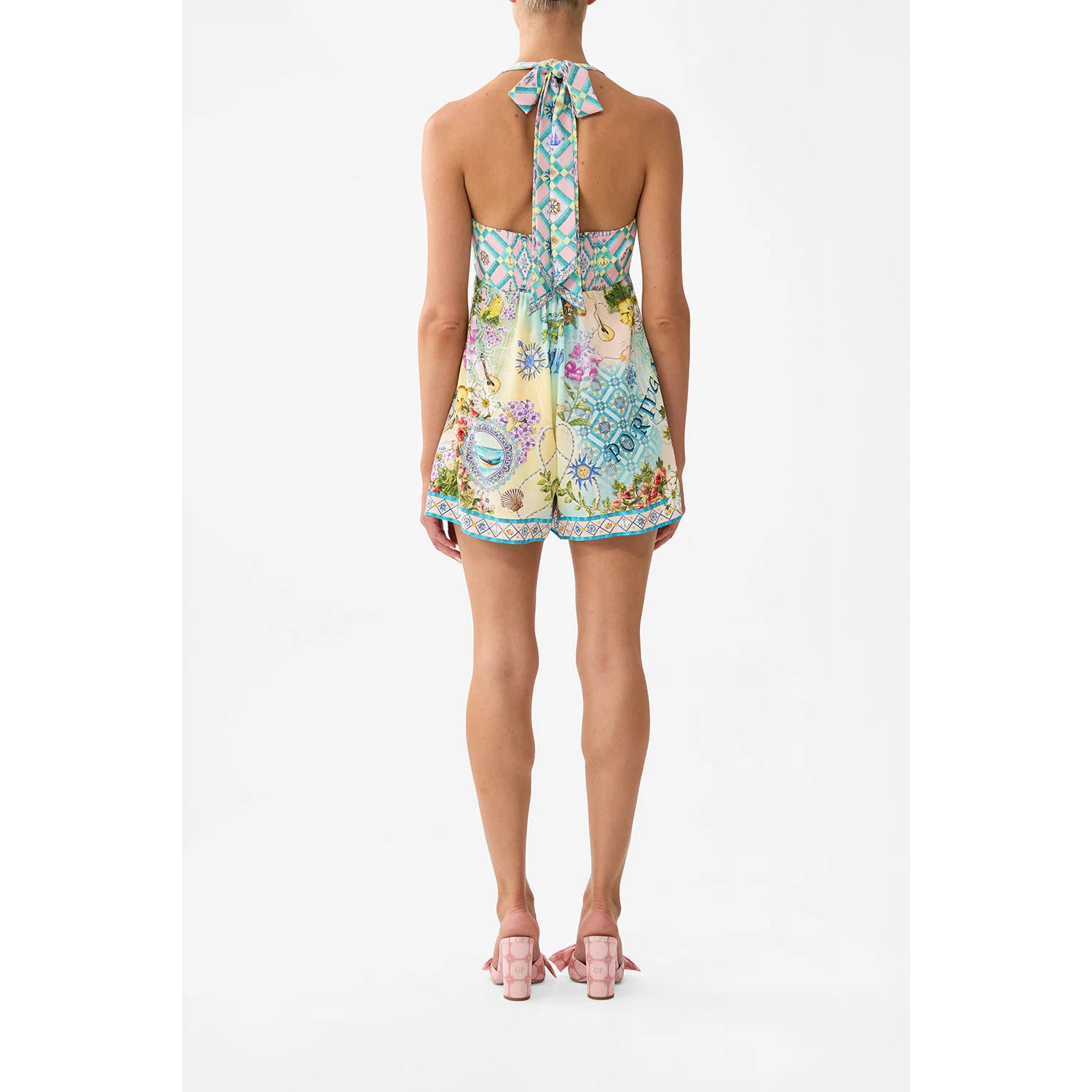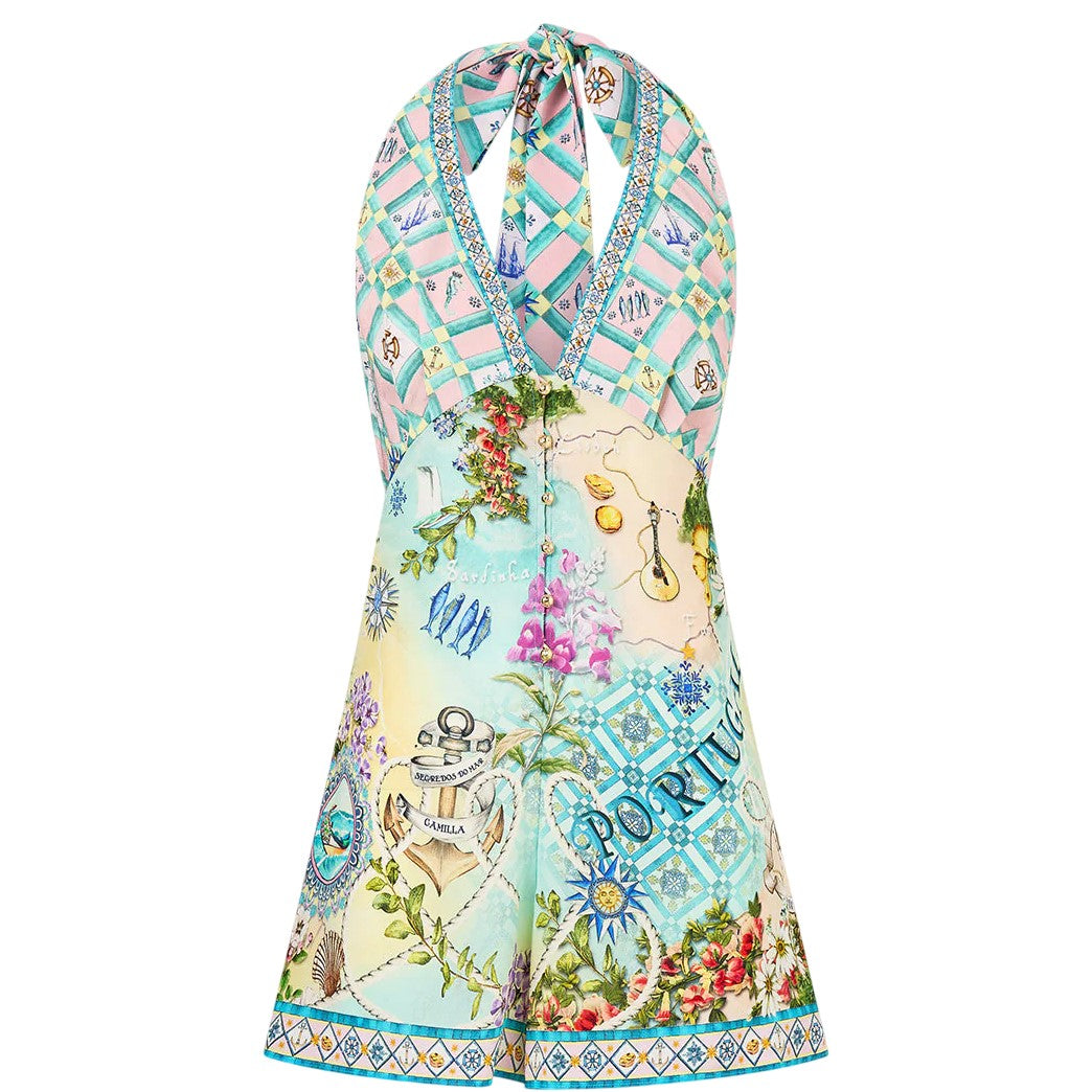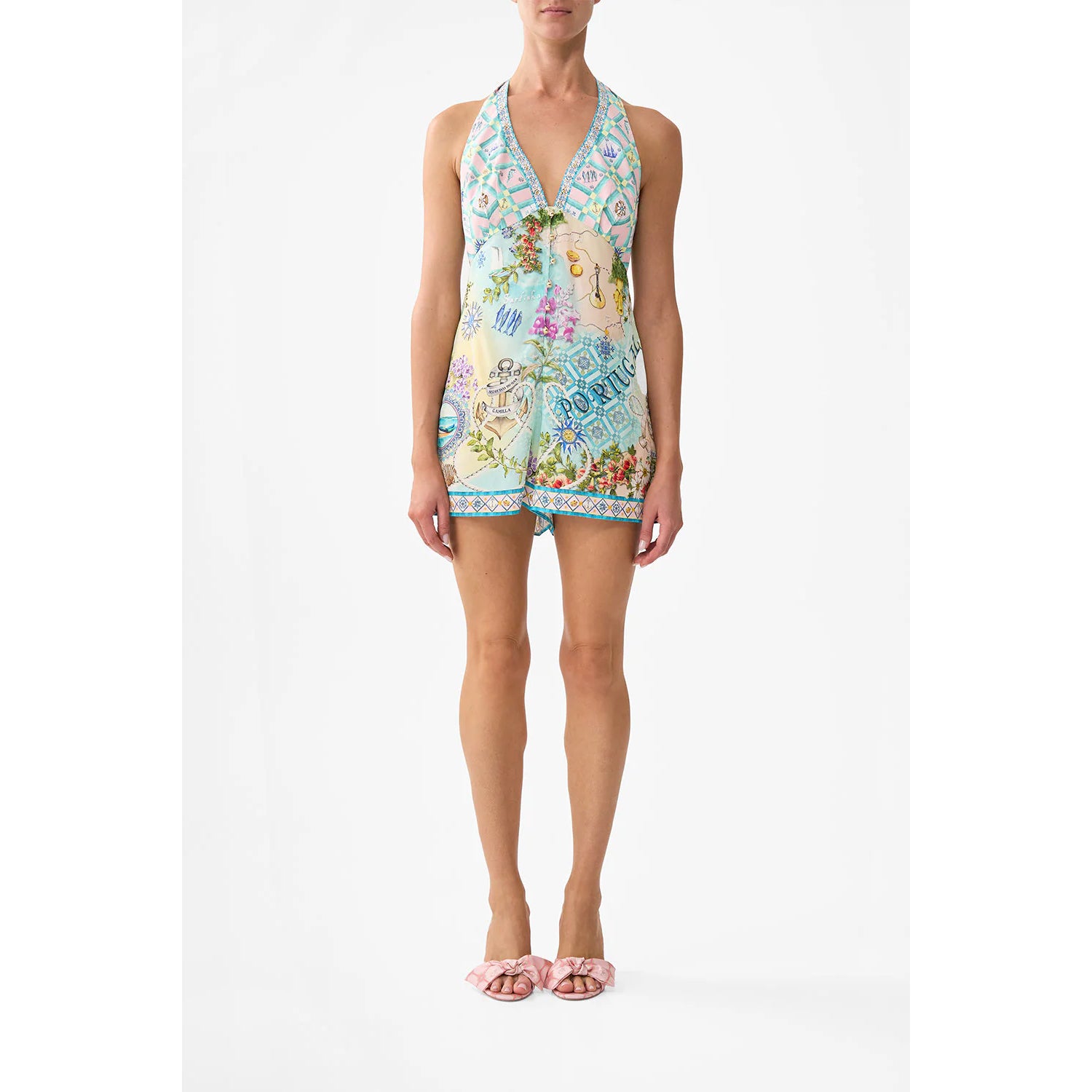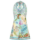 Designed in Australia, the Just Coasting Button Front Halter Playsuit radiates a kaleidoscope of pastel dreams, sunlit charm and coastal treasures inspired by boundless seaside reveries. Lovingly handcrafted, this stunning silk halter neck playsuit features an open back, the button-up front and crystal embellishments add playful opulence.