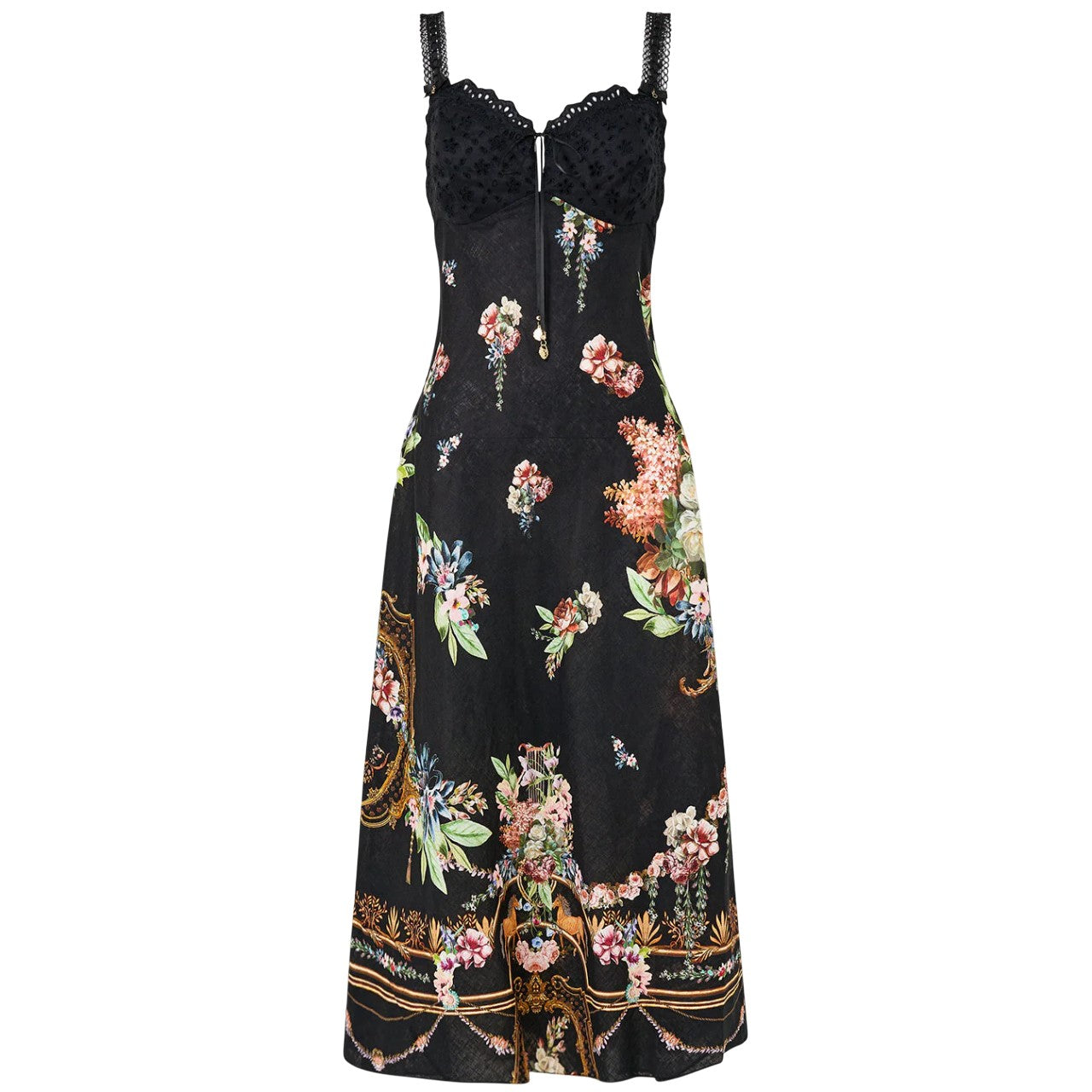 Designed in Australia, the Noble Endeavours Embroidered Bodice Bias Dress embodies a white base fused with florals and golden arches, inspired by the arabesque opulence of the Palace of Queluz and its storied princess chambers. Lovingly handcrafted, this embroidered bodice bias dress features a slim fit with a bias-cut skirt. The embroidered bodice and crystal embellishments add luxurious detail, while the tie front with tassels offers a playful touch.