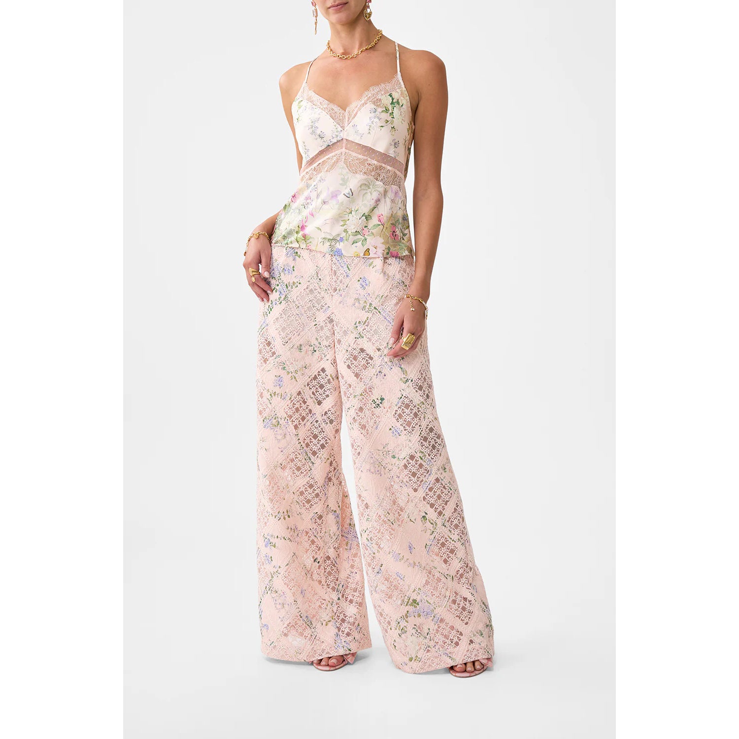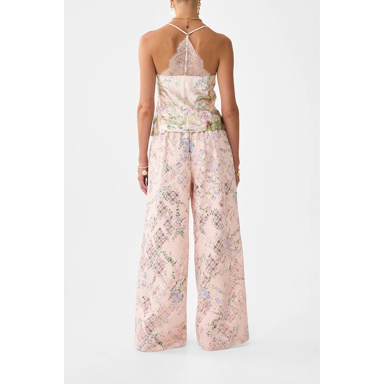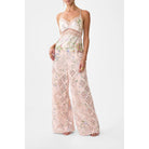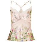 Designed in Australia, The Palacio Playground Lace Spliced Bias Cami draws from Portugal's Pink Palace, the Palacio De Estoi, celebrating a rococo façade, grand arches, and Versailles-style gardens. Lovingly handcrafted, this lace-spliced bias cami exudes delicate allure. A halter neckline and bias-cut silhouette are elevated by lace insert panels and crystal embellishments, creating a piece of understated luxury.