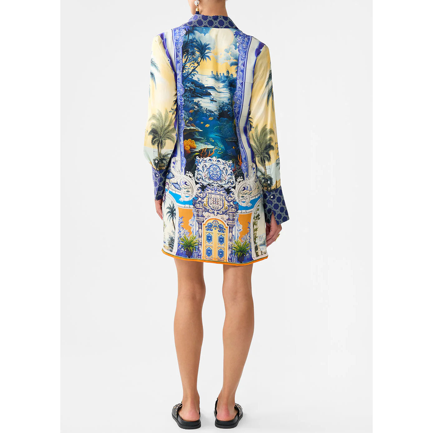 Designed in Australia, The Song Of Saint Anthony Mini Shirt Dress embarks on a fishing trip through Lisbon’s coastal charm, where hand-drawn creatures embody the spirit of the Saint Anthony Festival—oceanic and celebratory. Lovingly handcrafted, this CAMILLA silk midi dress showcases a sleek square neckline at the front that falls into a straight column silhouette that softly skims the body to a mid-calf hemline. The adjustable straps and centre-back invisible zip accentuate the sophisticated line whilst providing effortless wearability.