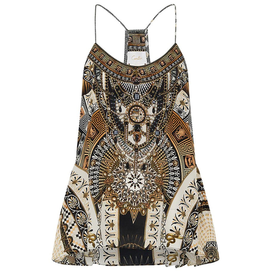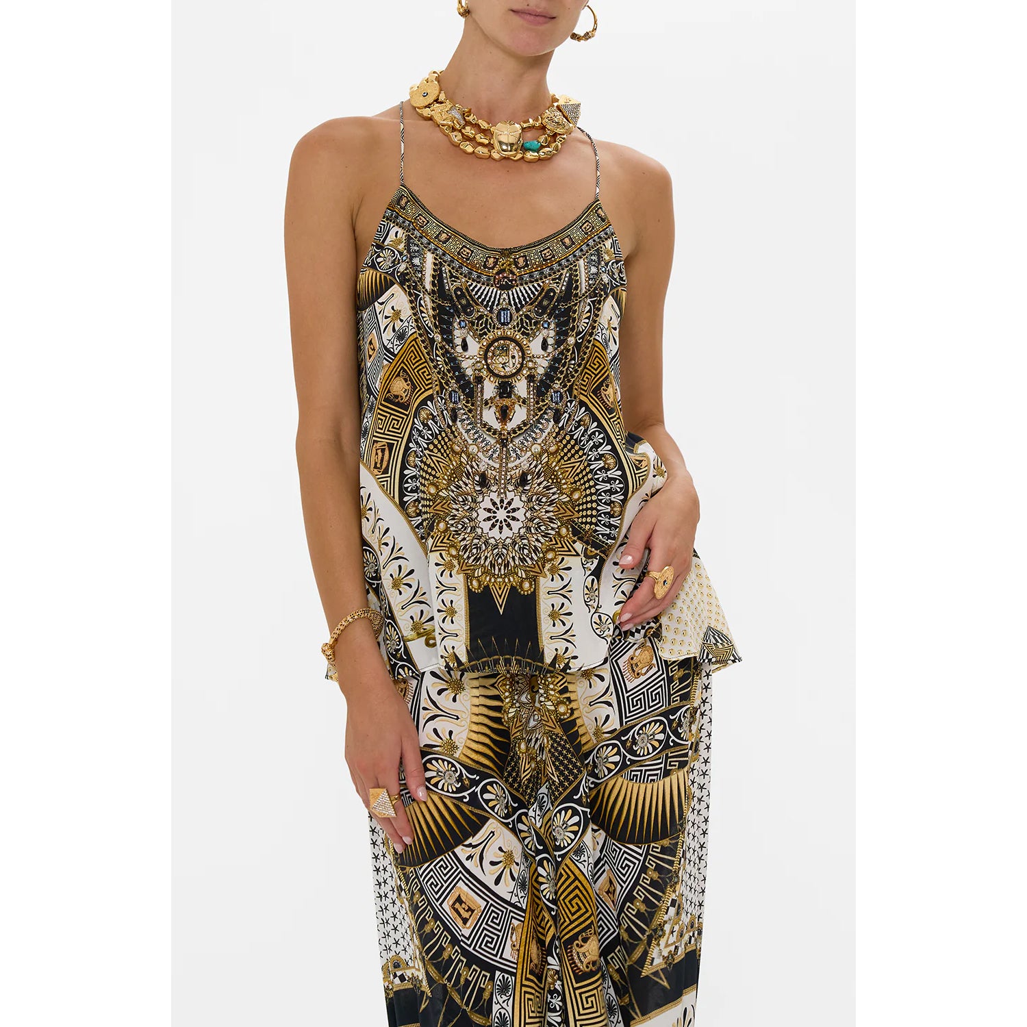 Designed in Australia, The Temples Of Dendara T Back Shoestring Top features borders and hieroglyphs, drawn from the sacred Temple of Dendara, enriched with bespoke CAMILLA motifs and divine representations of Hathor and her celestial consort, Horus. Lovingly handcrafted, this luxury CAMILLA silk top features fine shoestring straps that flow from a scoop neckline into a chic racerback neckline. With a relaxed a line fit throughout the body that’s falls to a hip level perfect for tucking into high waisted styles or worn out for effortless flow.
