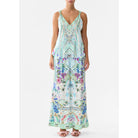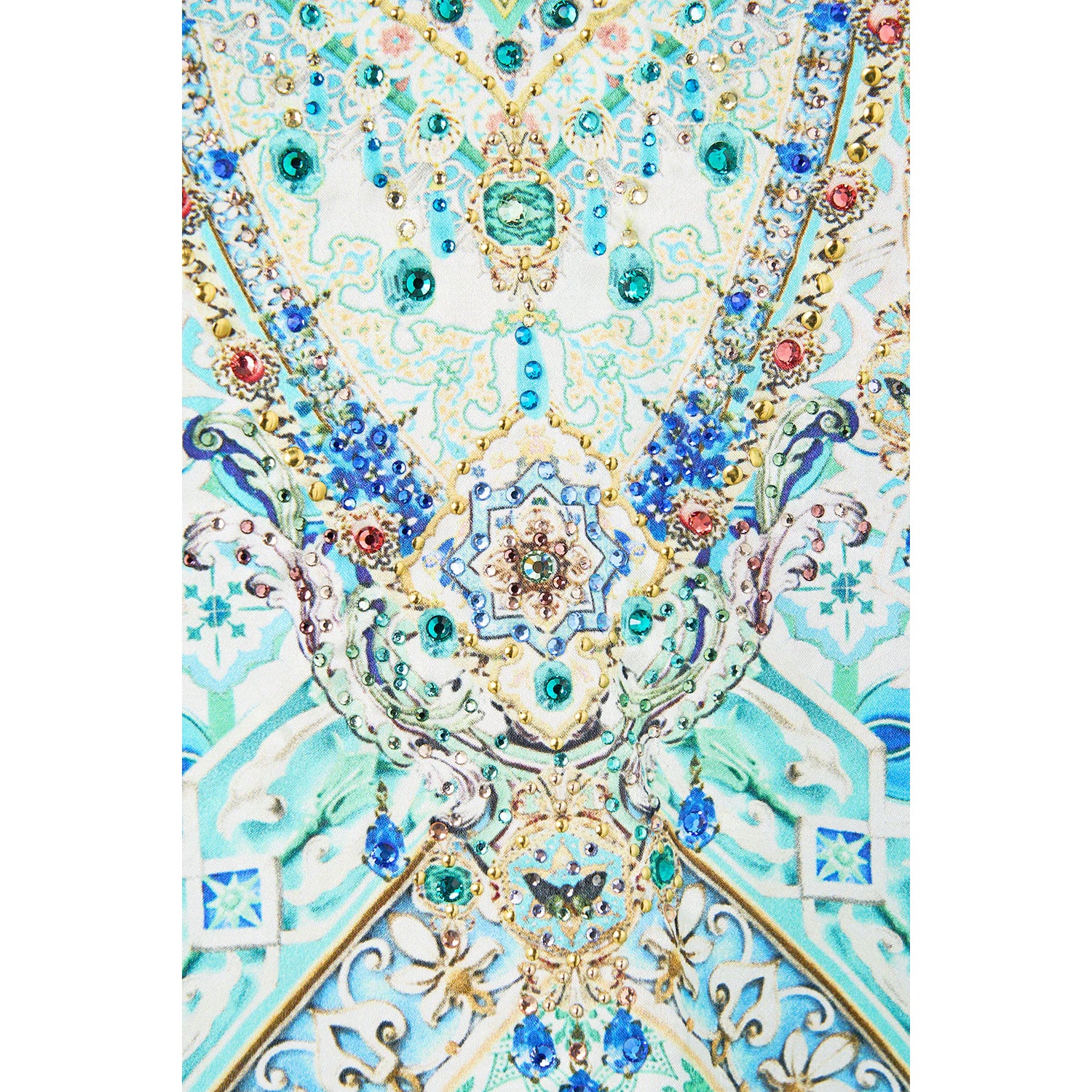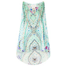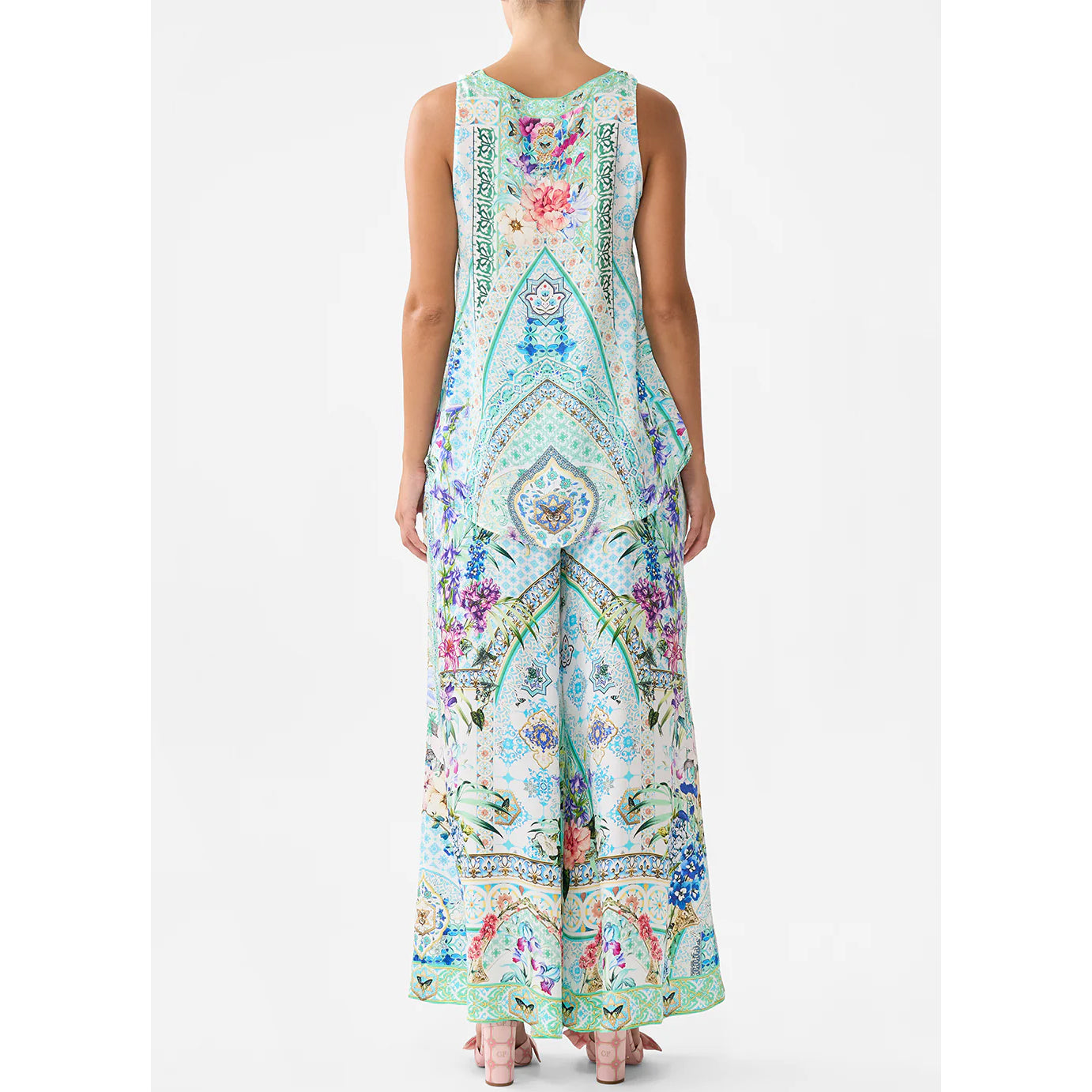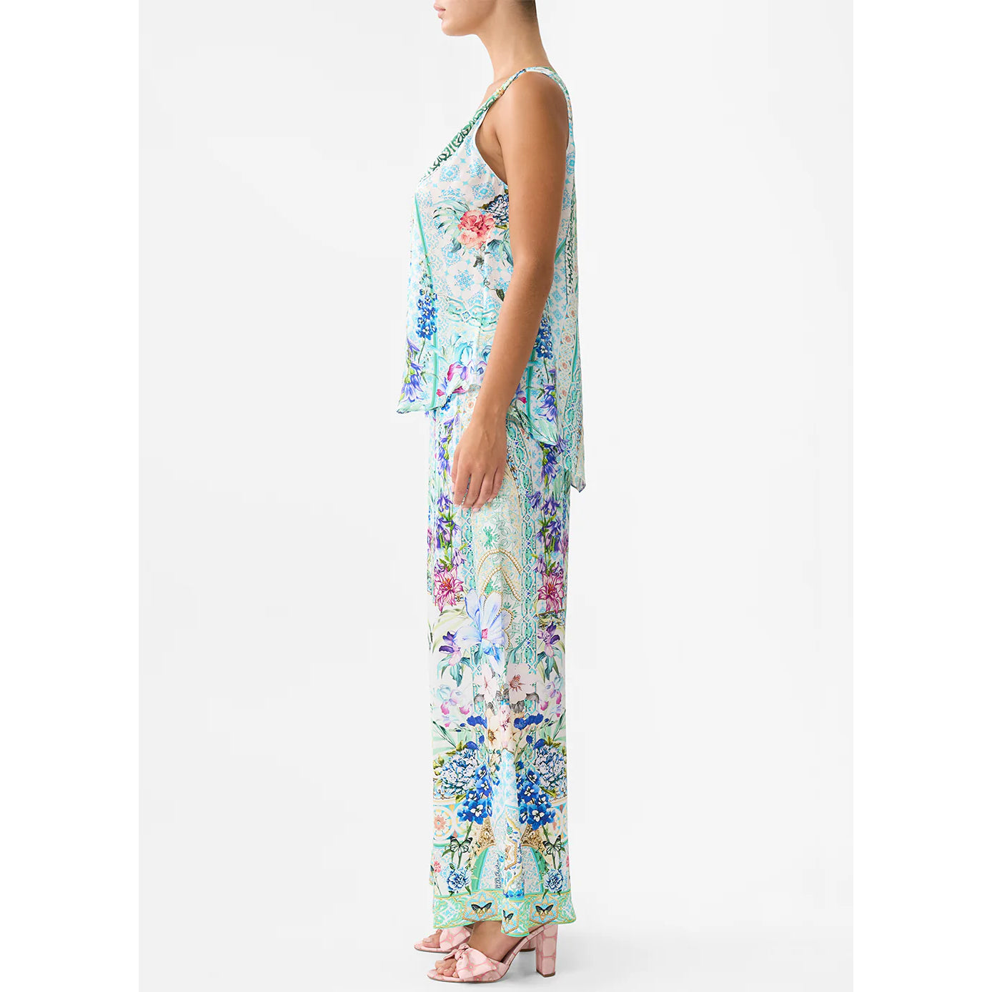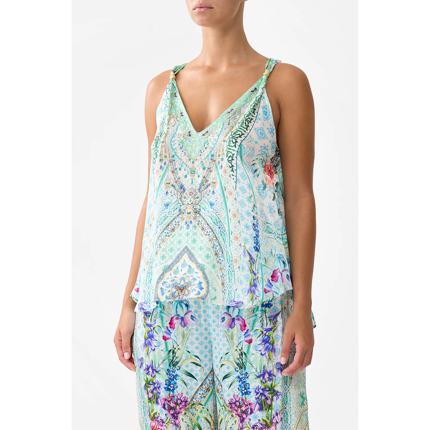 Designed in Australia, The Sunrise In Sintra Tank Top With Strap Bead Detail celebrates lush gardens and eclectic nineteenth-century architecture, where light blues and intricate tiles reflect exotic motifs, inviting you into botanical beauty. Lovingly handcrafted, this luxury CAMILLA printed silk top features a relaxed a line silhouette throughout the body that flow into a curved subtle high low hemline. The v neckline is adorned with bead hardware details that create a cinched in detail at the shoulder straps for a touch of elevated opulence.