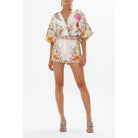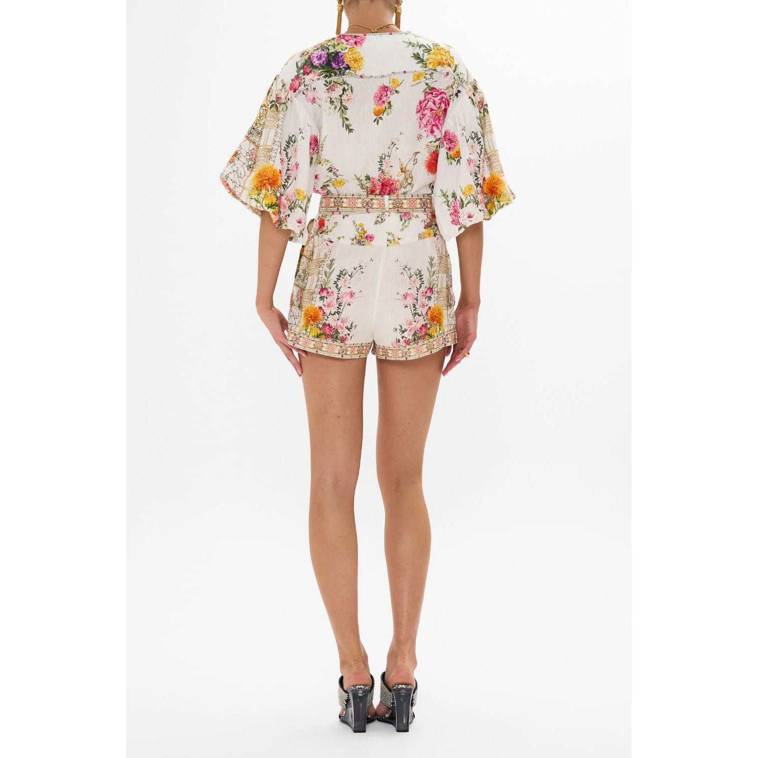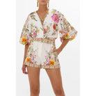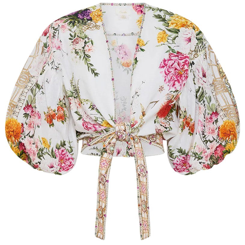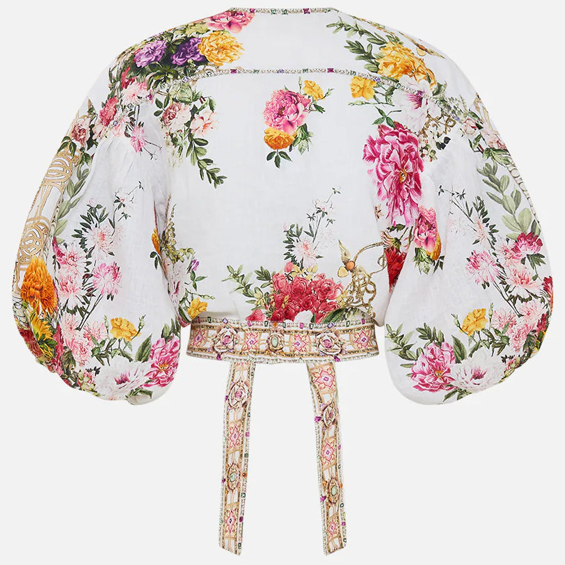 Designed in Australia, The Egyptian Rose Tie Front Puff Sleeve Top captures an enchanting oasis where lush florals entwine with majestic interiors amid a serene, pearlescent setting. Lovingly handcrafted, this CAMILLA top is adorned with a cropped length, it exudes sophistication. The blouse features a multiway tie, offering a uniquely artistic flair while statement 1/2 length puff sleeves add a touch of drama creating a striking visual contrast.