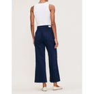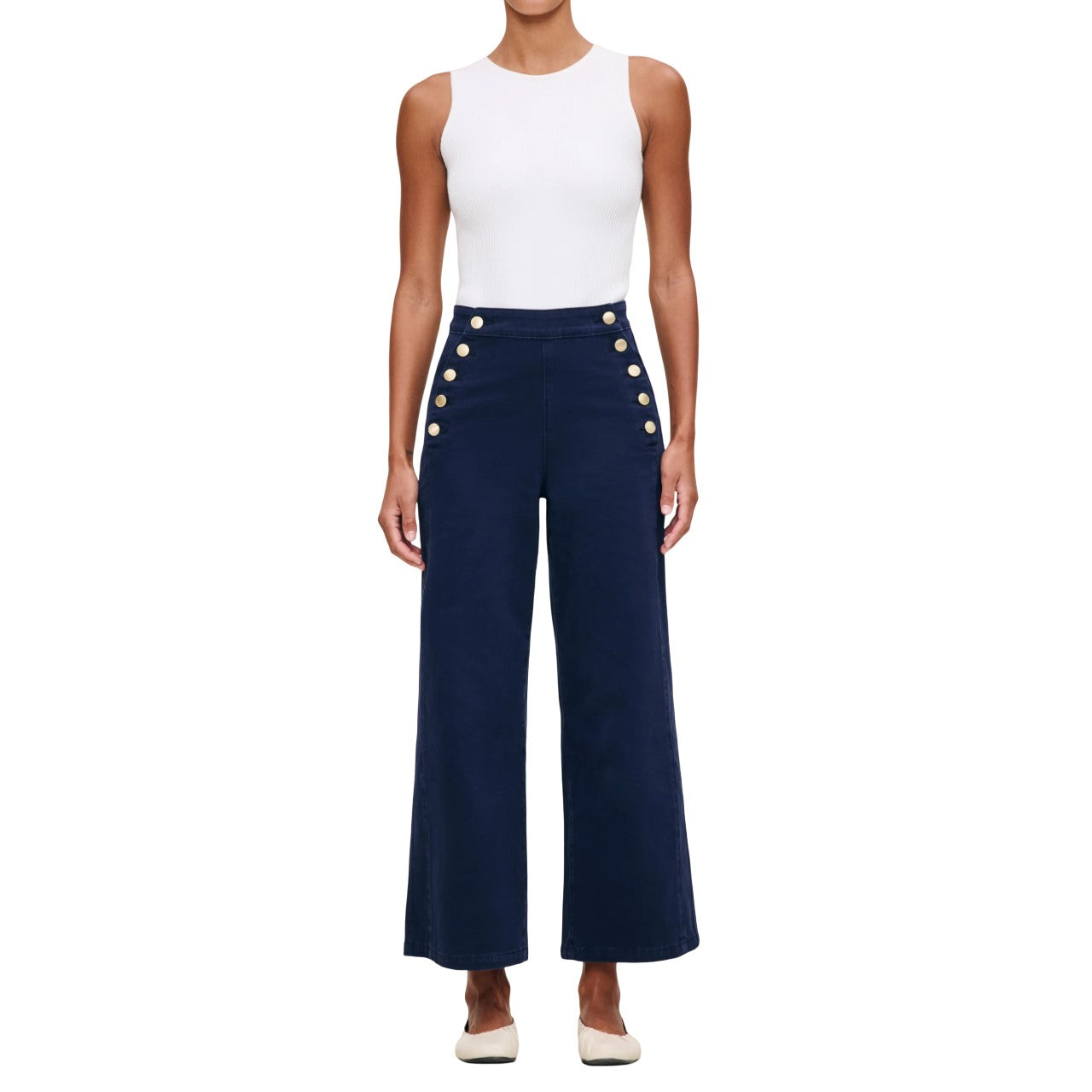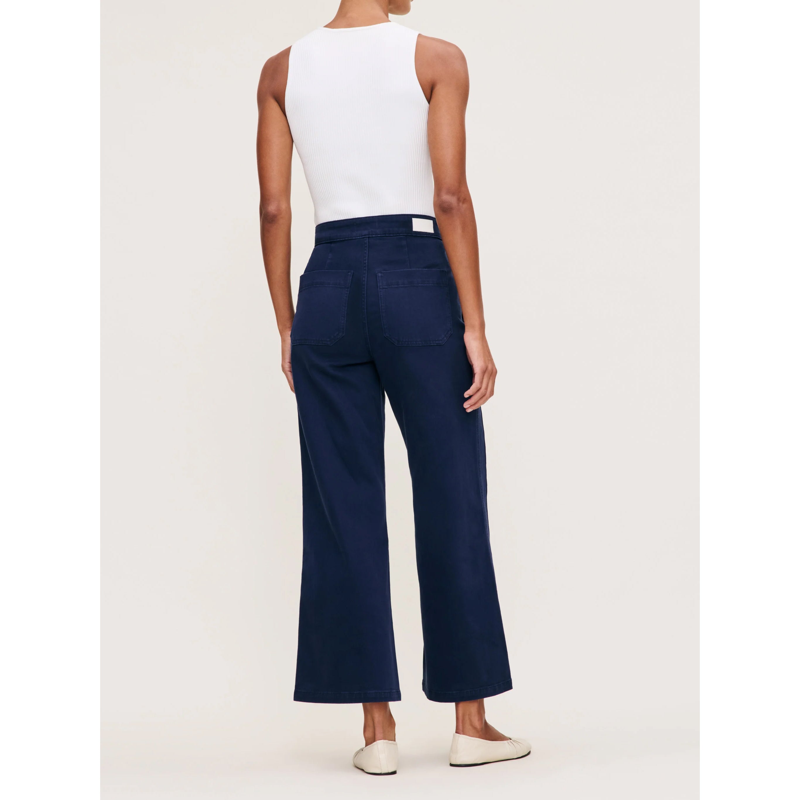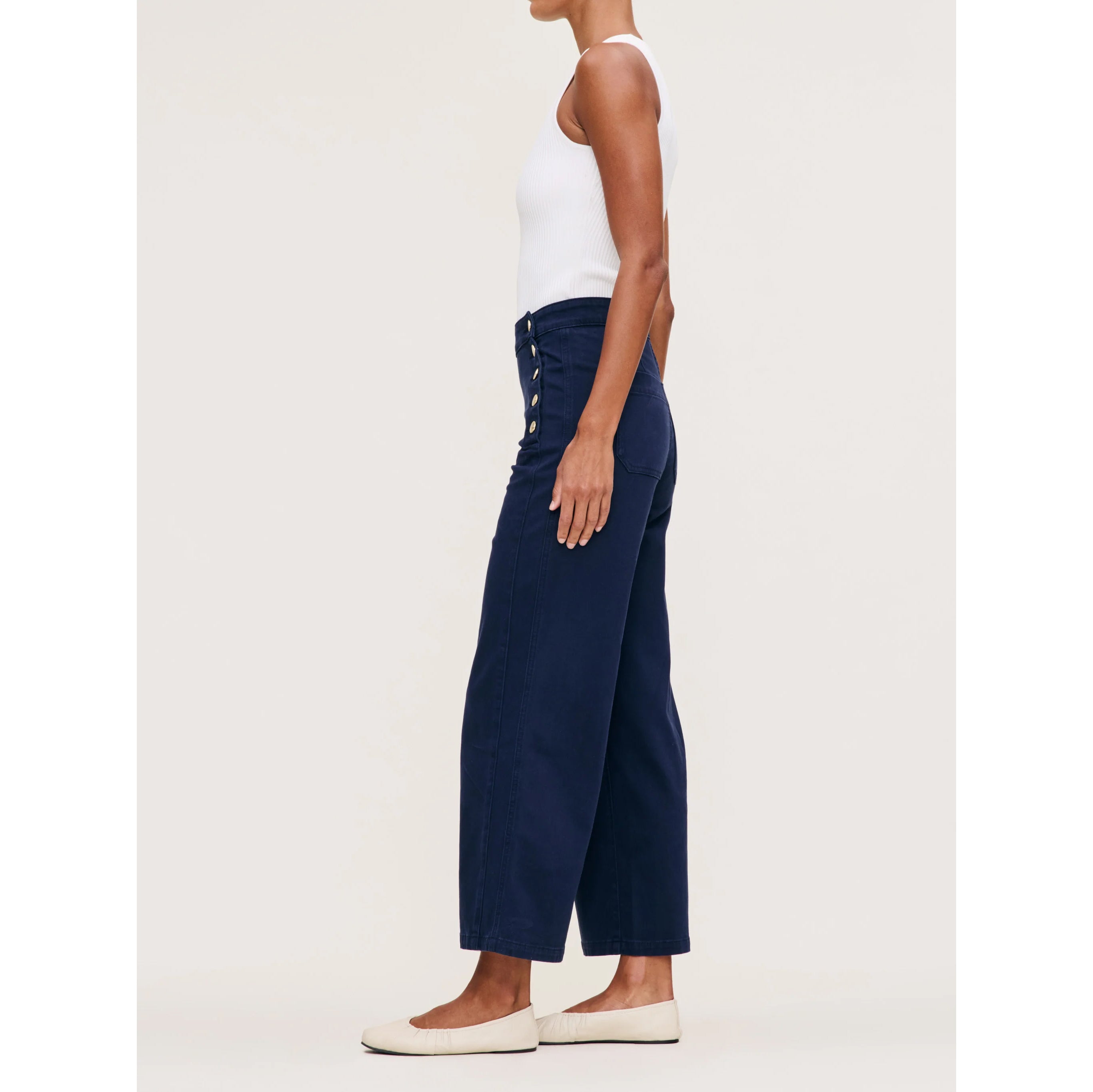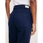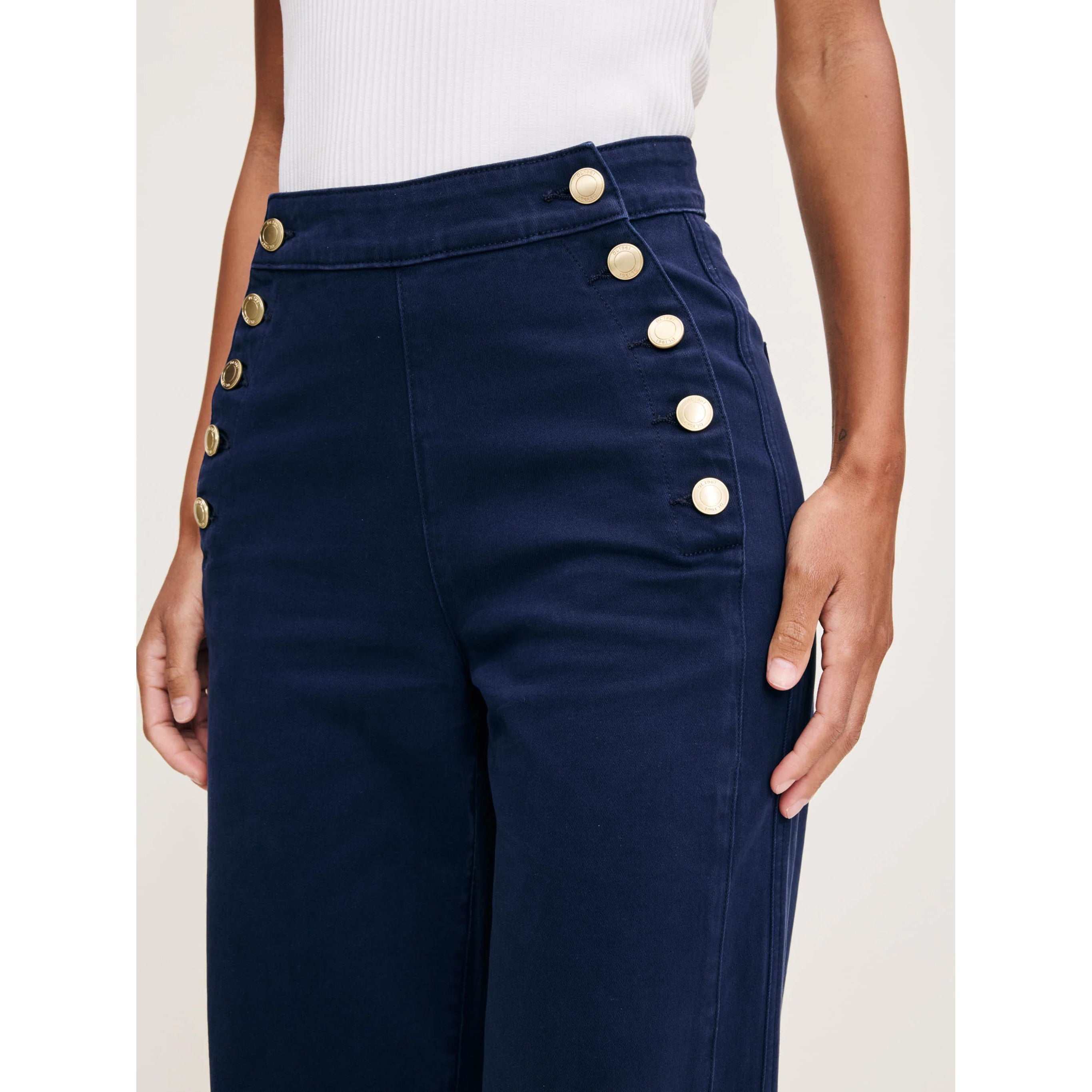 Hepburn is a high-rise style that is fitted through the waist and seat, tapering outward from the thigh for a wide leg that hits above the ankle. Bright Navy is a vivid, deep blue twill. It features gold hardware, tonal stitching, a clean hem and an ecru back patch.