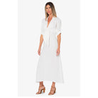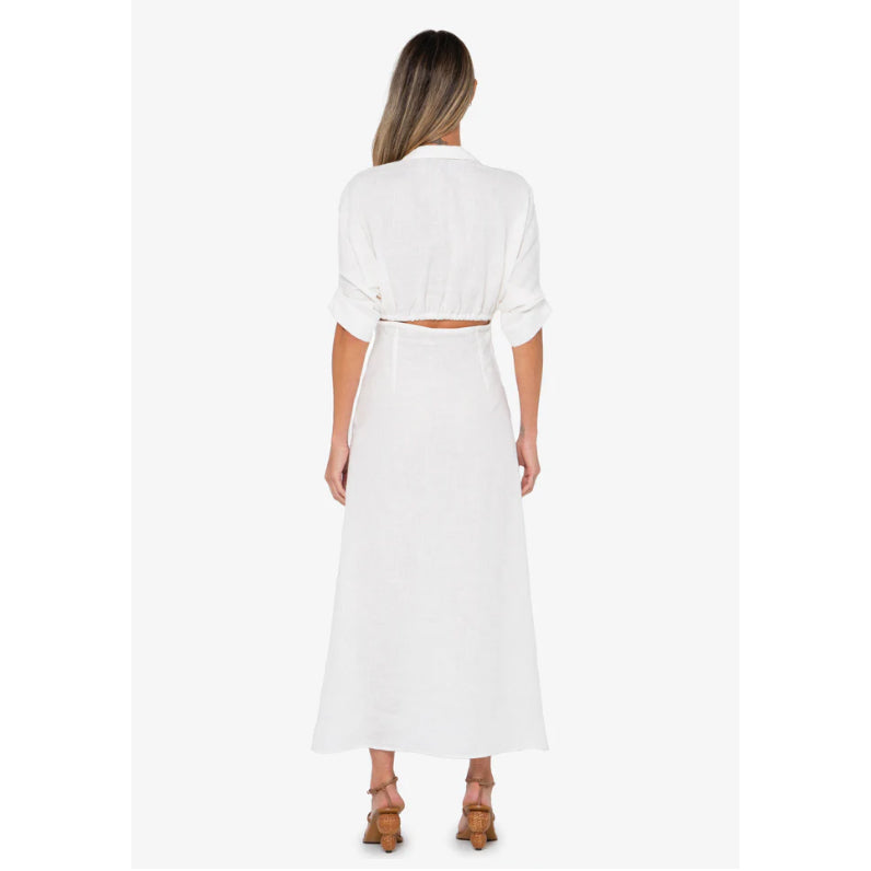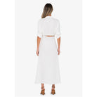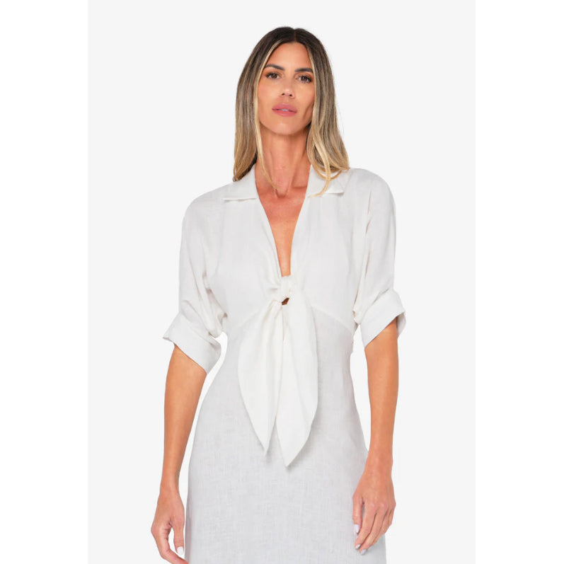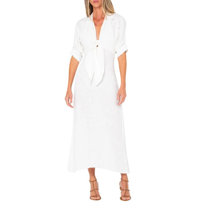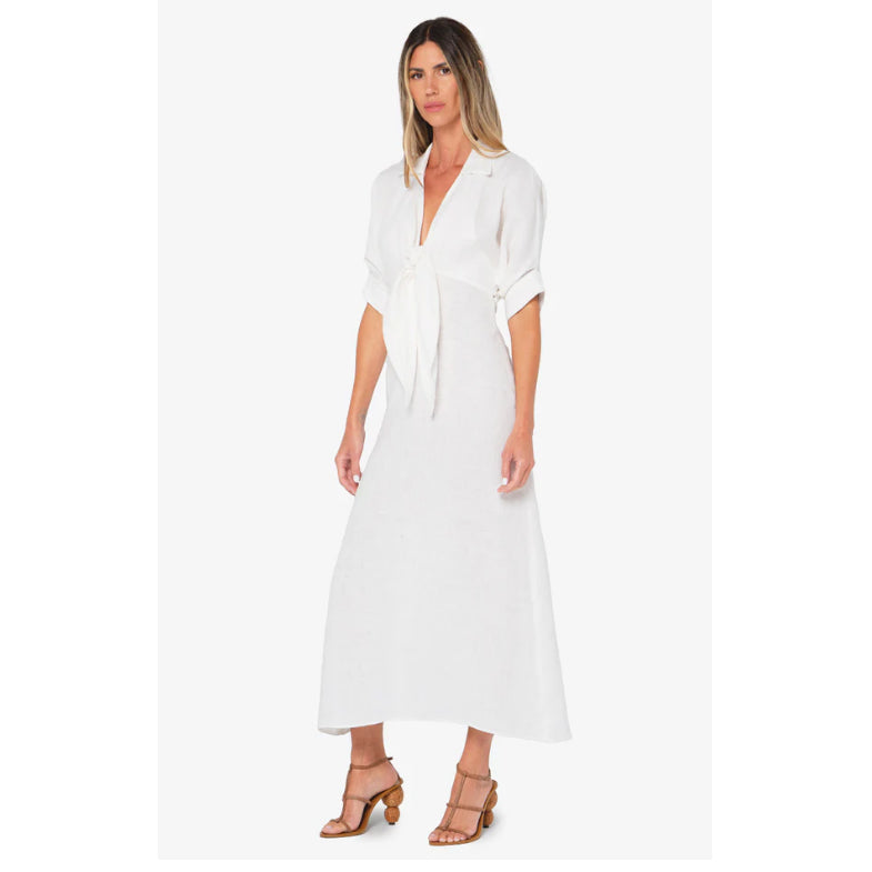 The Chiara Dress 2.0 is a crisp, elevated take on everyday ease. It features a knotted front tie, waist cutouts, and a flattering elastic back panel. With its collared neckline and cuffed sleeves, this dress blends effortless polish with breezy sophistication.