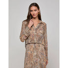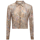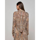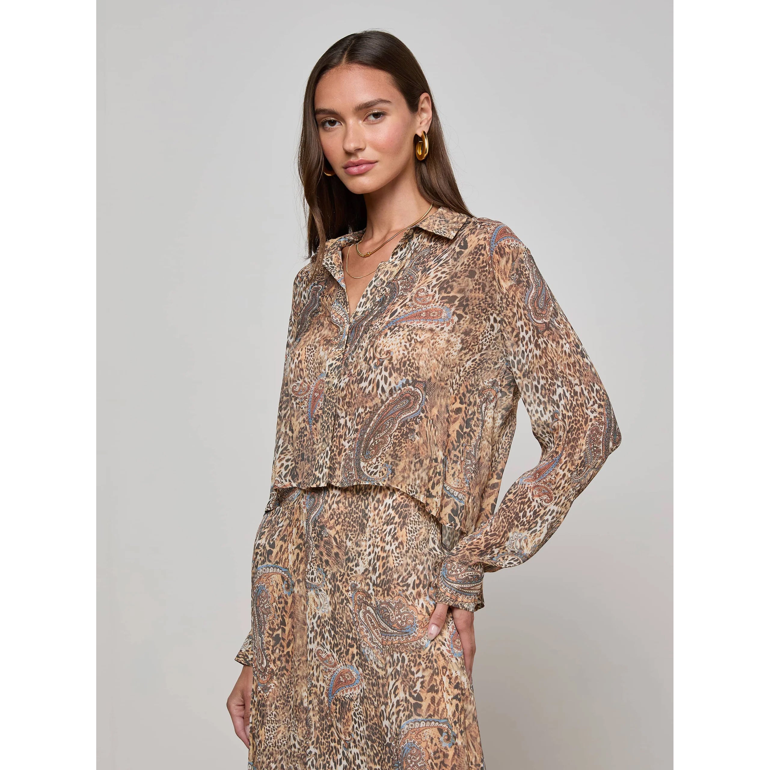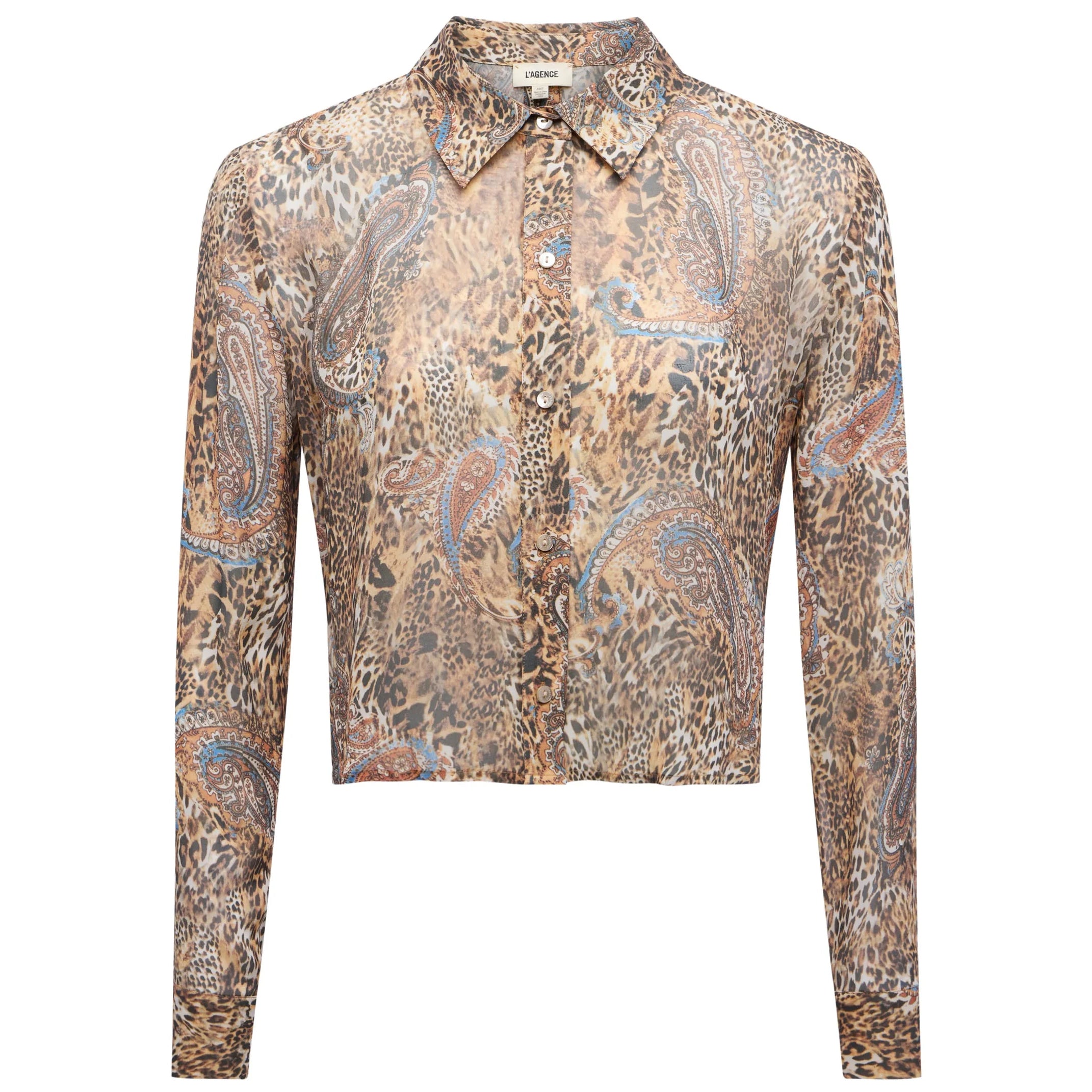 The Cosette shirt by L'AGENCE features a relaxed fit inspired by menswear styles and an asymmetrical hem. Now available in a layered leopard and paisley print, this style pairs beautifully with dark denim.