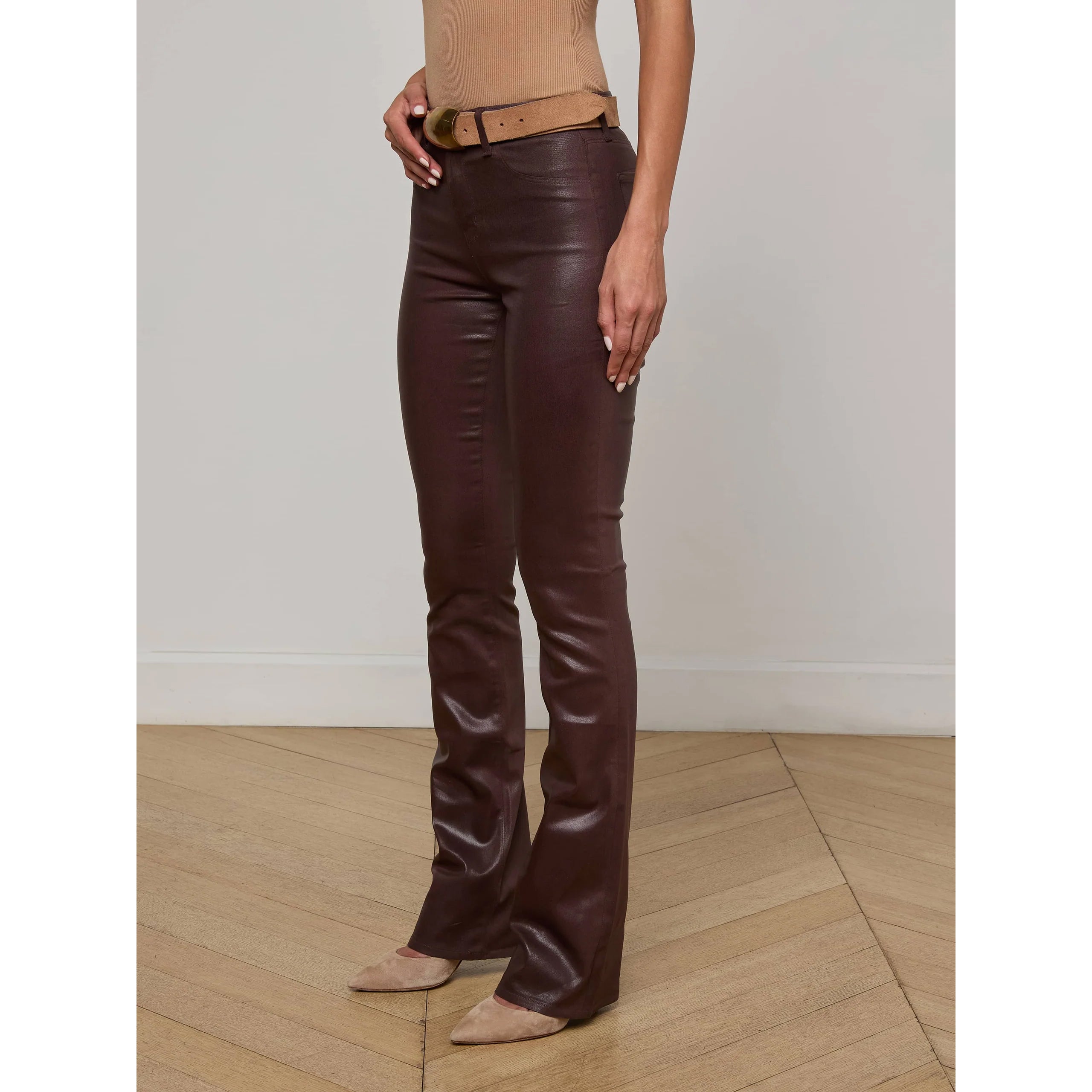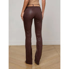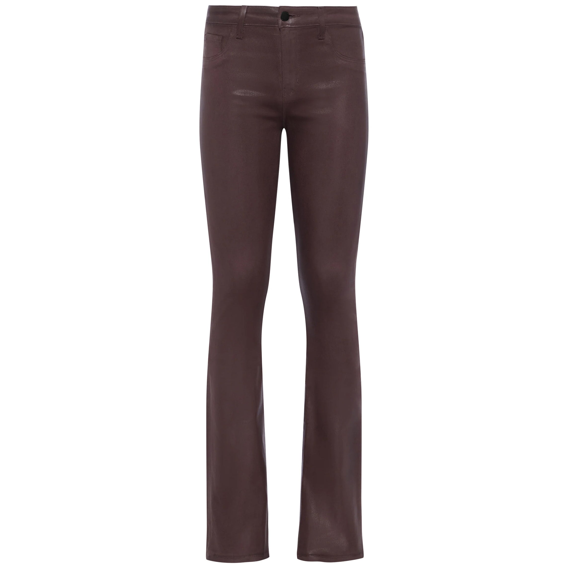 A sleek, slim bootcut jean, fitted through the hips and knee. A contoured waistband securely hugs the natural waist without gaping. The Selma in L'AGENCE's leather alternative coated denim is now back in chocolate brown.