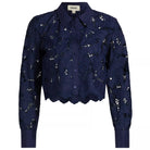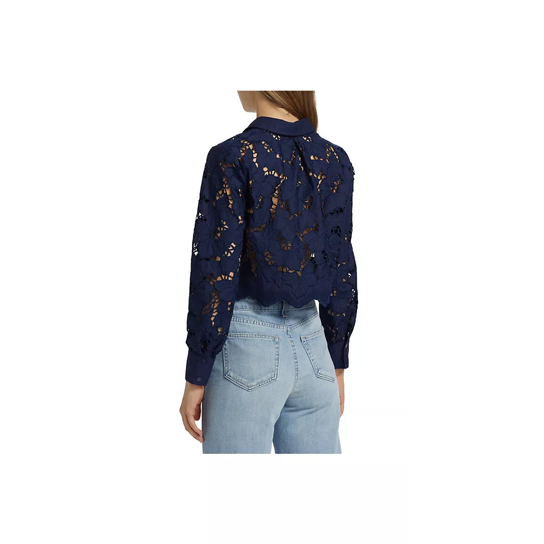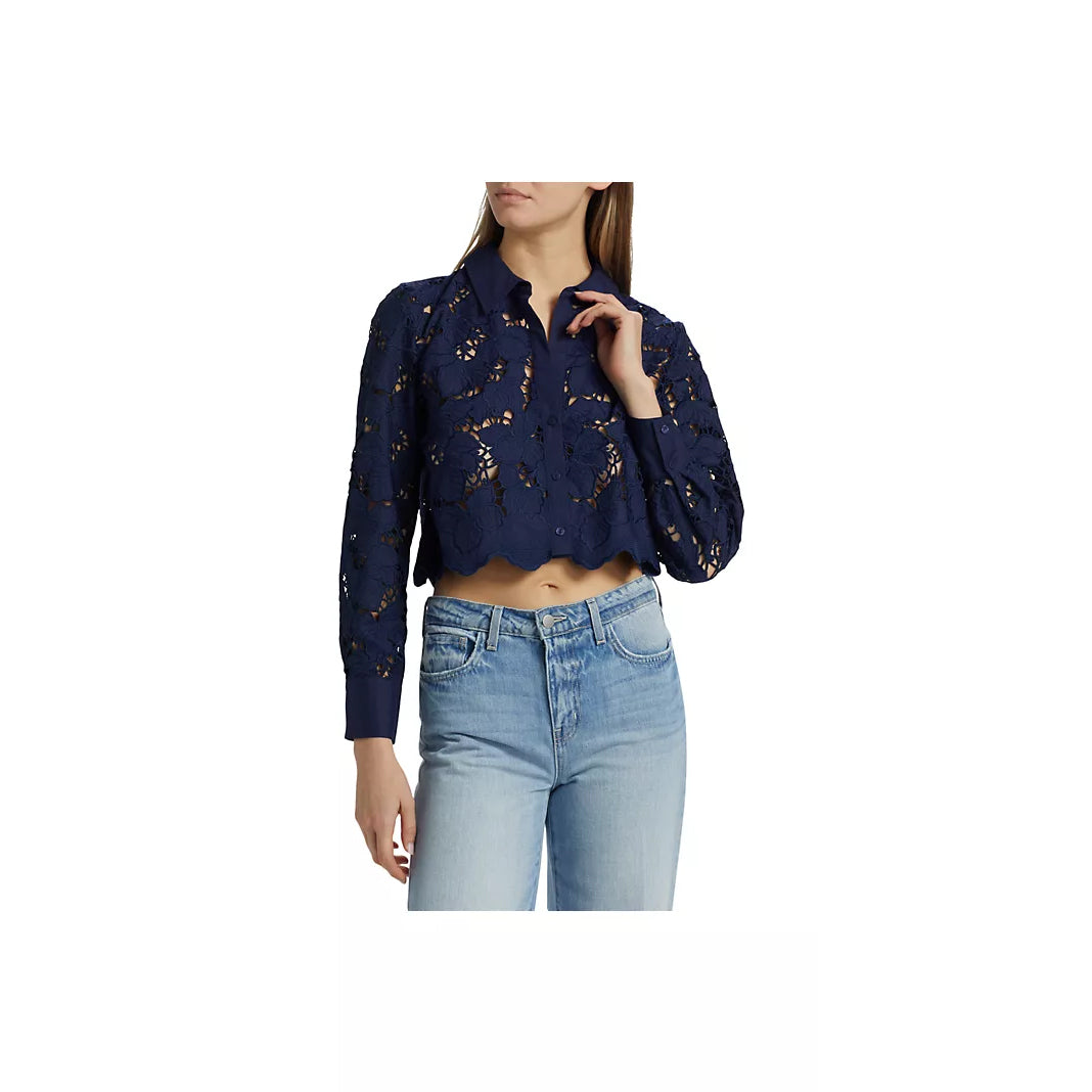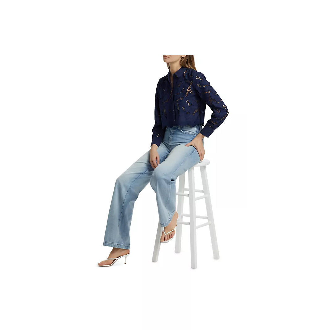 L'AGENCE's Seychelle crop blouse is crafted of cotton eyelet. Finished with a wavy hem, this floral-embroidered style features a point collar and long sleeves.