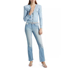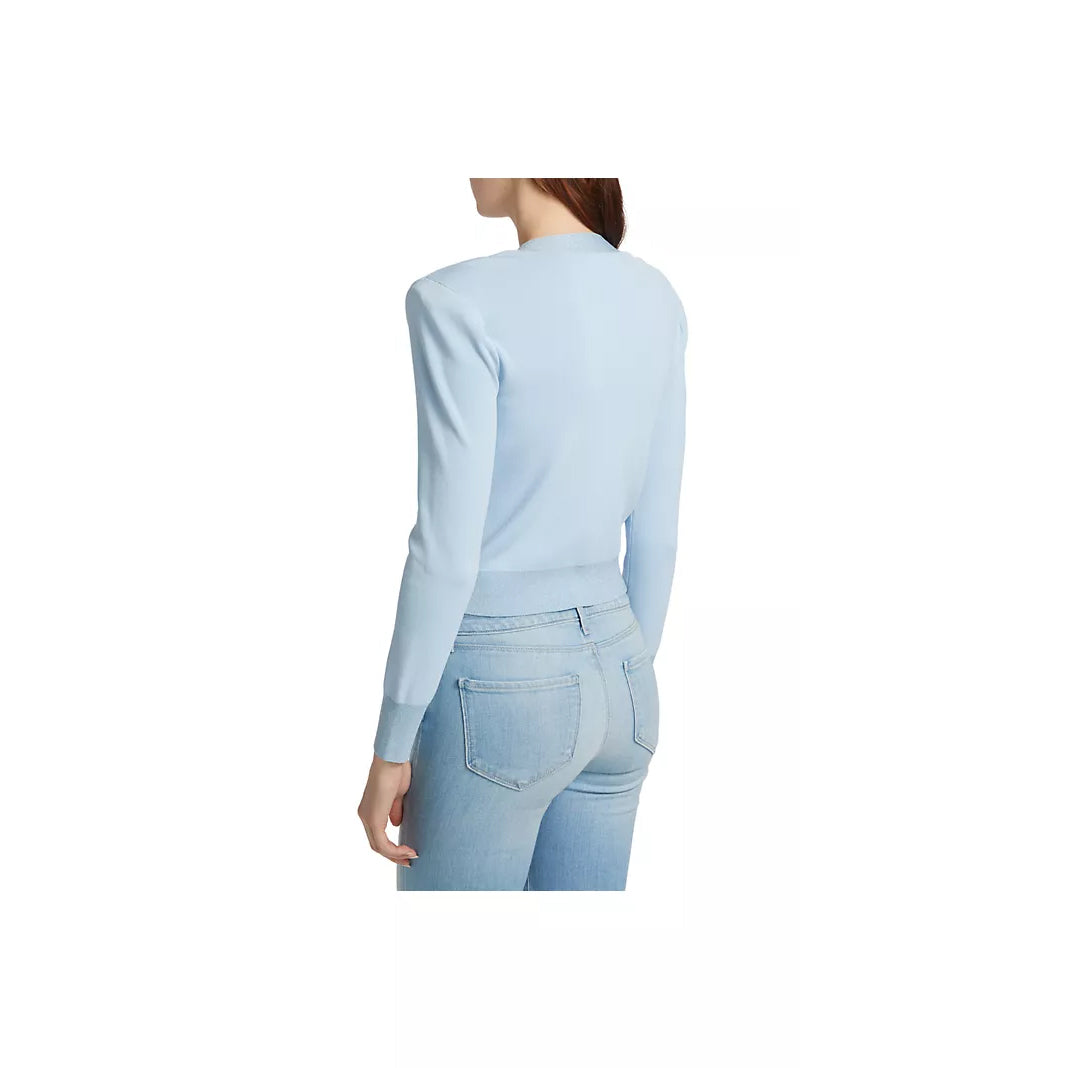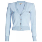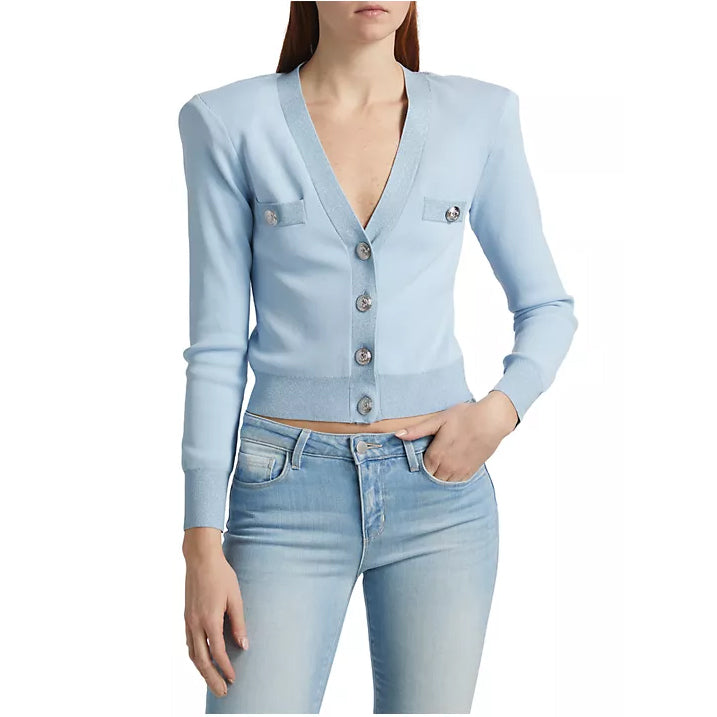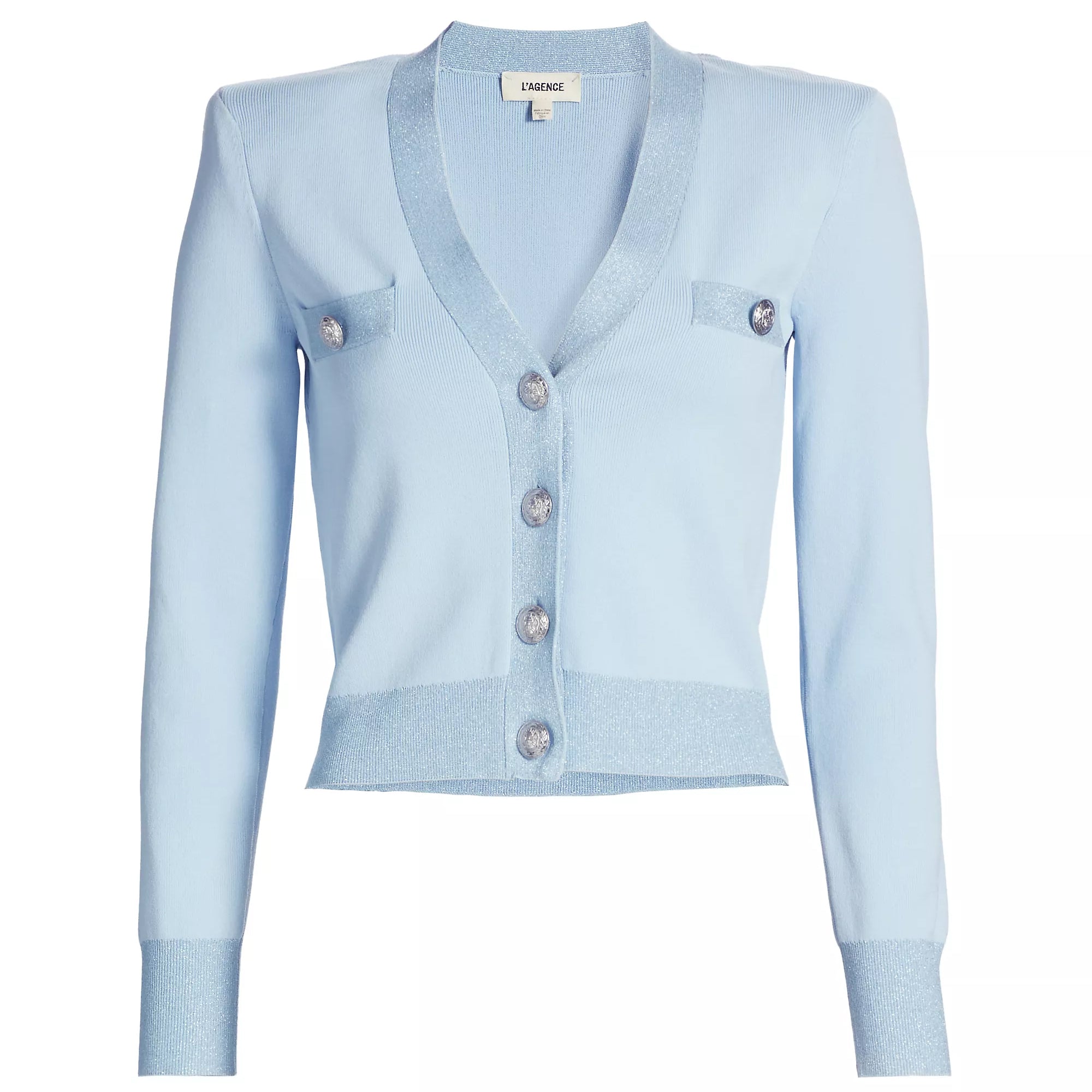 L'AGENCE's fitted Taya knit crop cardigan features a V-neck, long sleeves, and chest welt pockets.