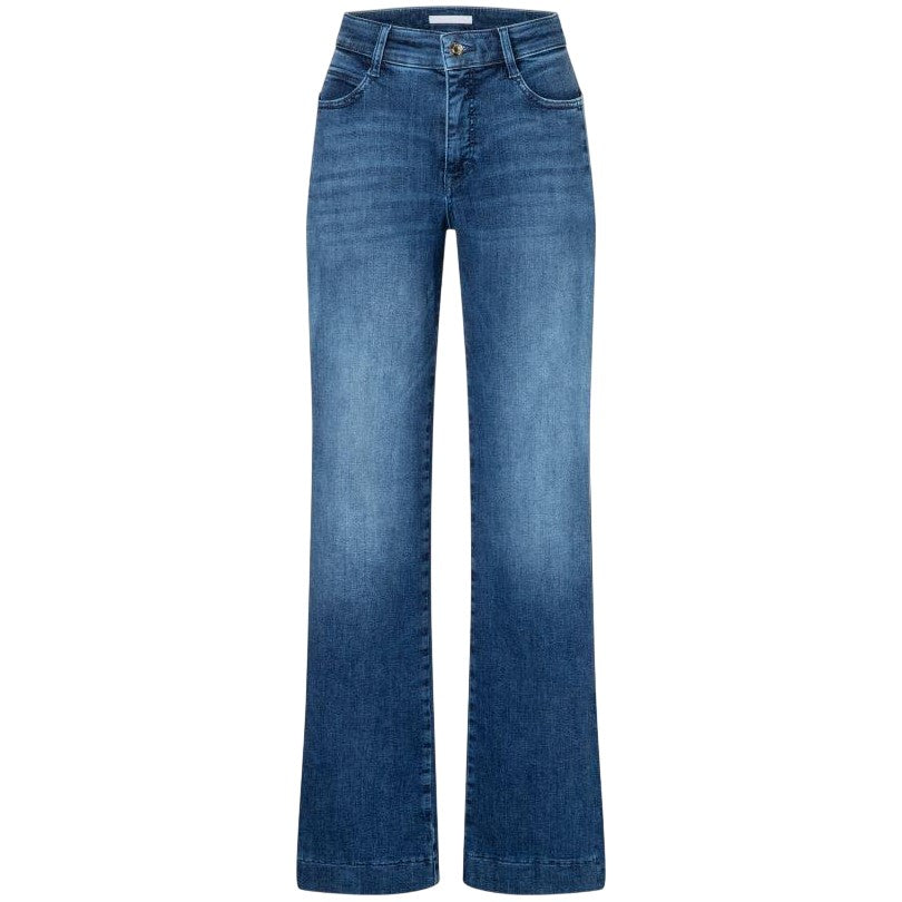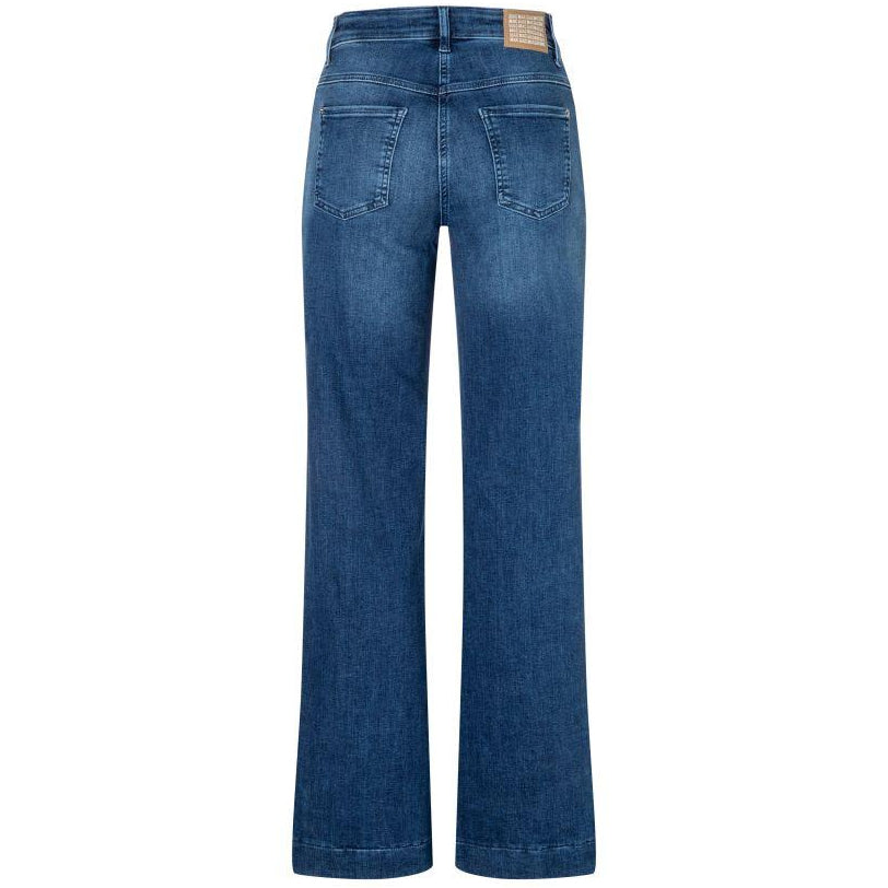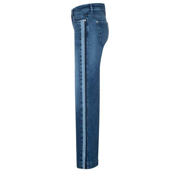 A modern take on the vintage jean. This wide-leg silhouette features a structured, straight fit and mid-rise waist for ultimate comfort and shape. Finished with sleek double galon trim along the leg, soft stretch denim, and a worn-in authentic wash.