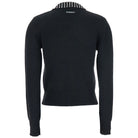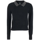 Slim-fitting, long-sleeved sweater with polo-style collar. The collar immediately catches the eye thanks to the rhinestone appliqués that embellish the design. The hem and cuffs are ribbed, while the tone-on-tone label with the PINKO lettering logo stands out on the lower front. The piece has undergone finishing tests to minimize the possible formation of pilling, ensuring greater fabric softness and durability.