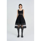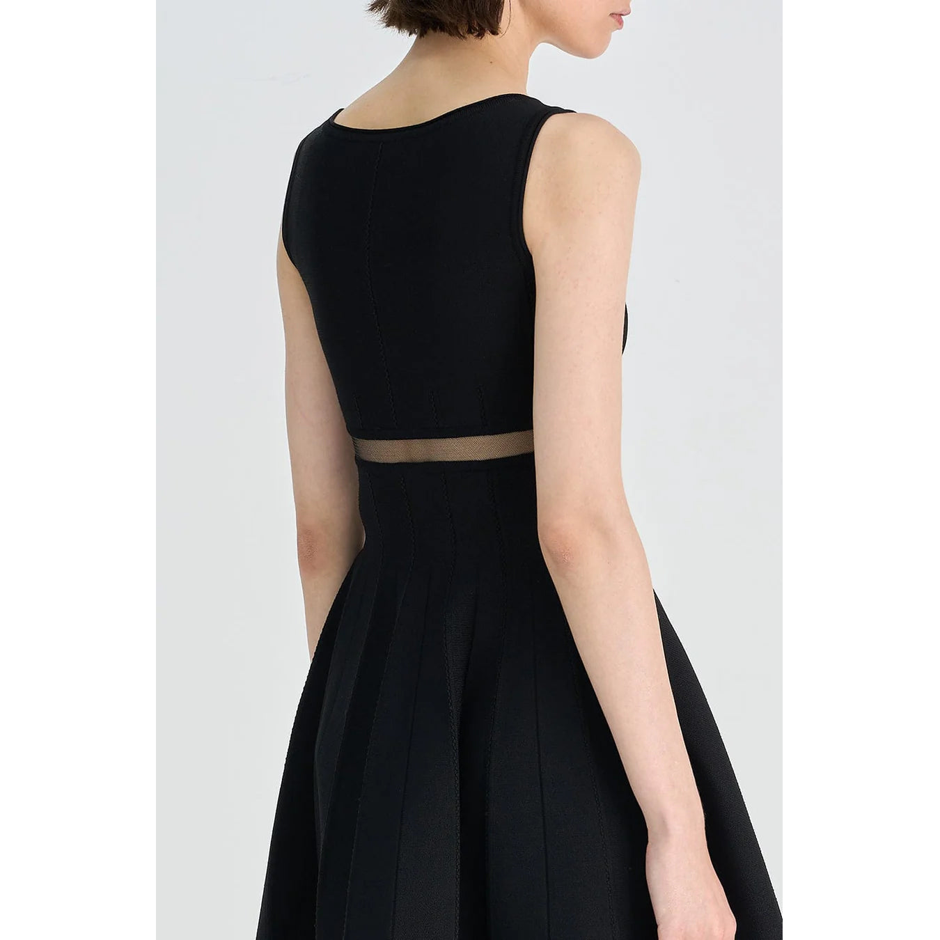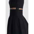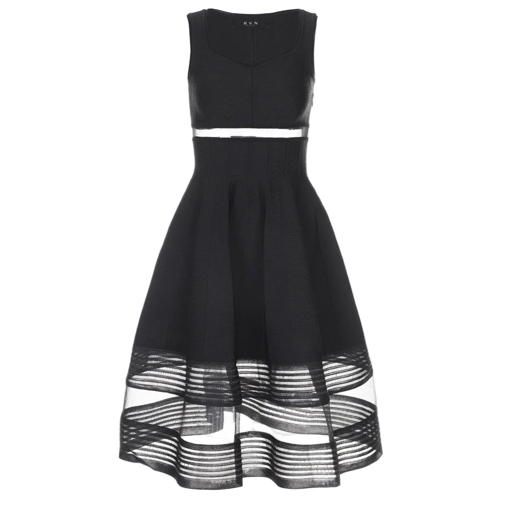 RVN's sheer hem flare dress is exquisitely crafted to enhance the female form. It's made from crepe viscose that's equally figure-hugging, smoothing and beautifully flare at the bottom, which is achieved with an intermix of technique and materials, while also showing hints of skin in every movement. Modeled on vintage bodices and with the application of 3D knitting, it creates the illusion of classic darts. The sweetheart neckline will elegantly frame any necklace.