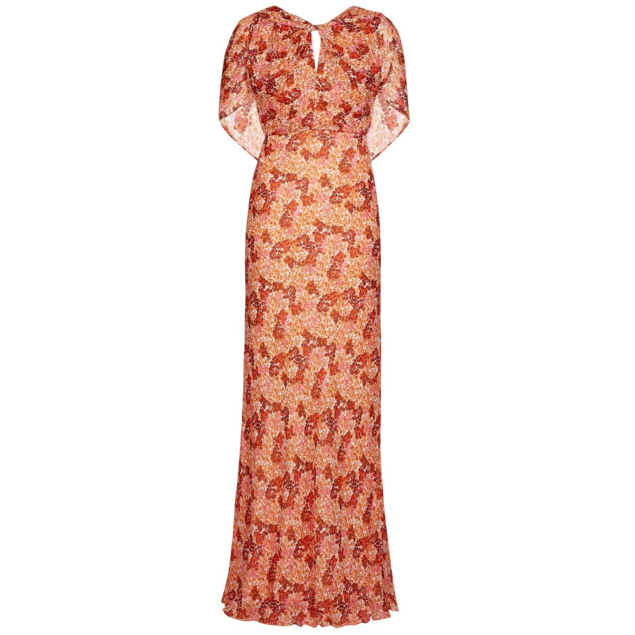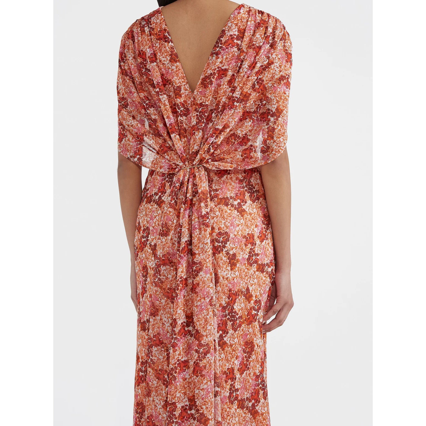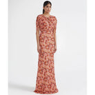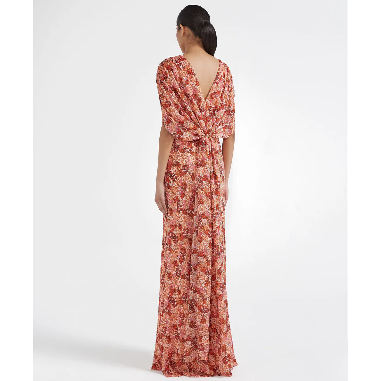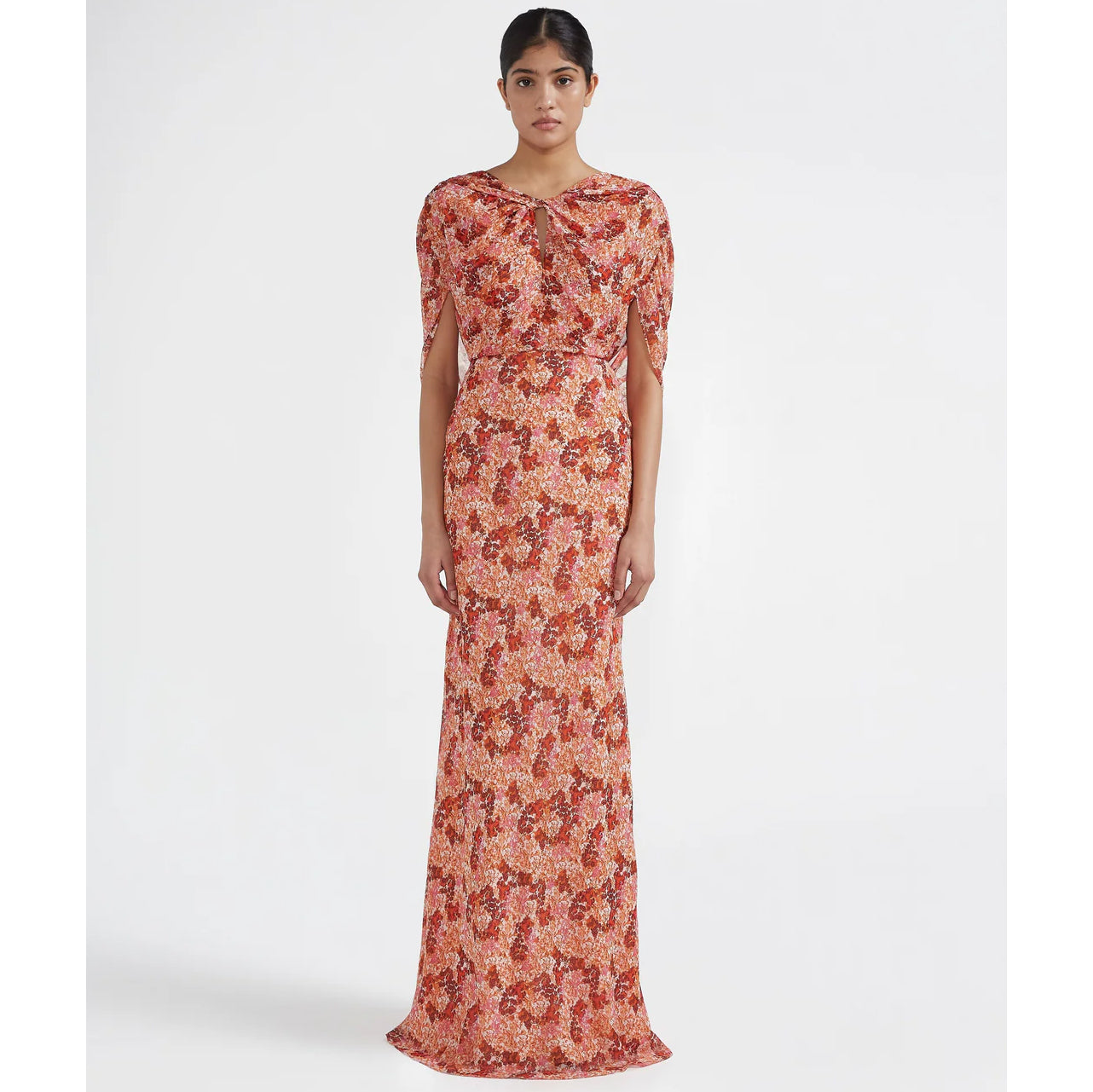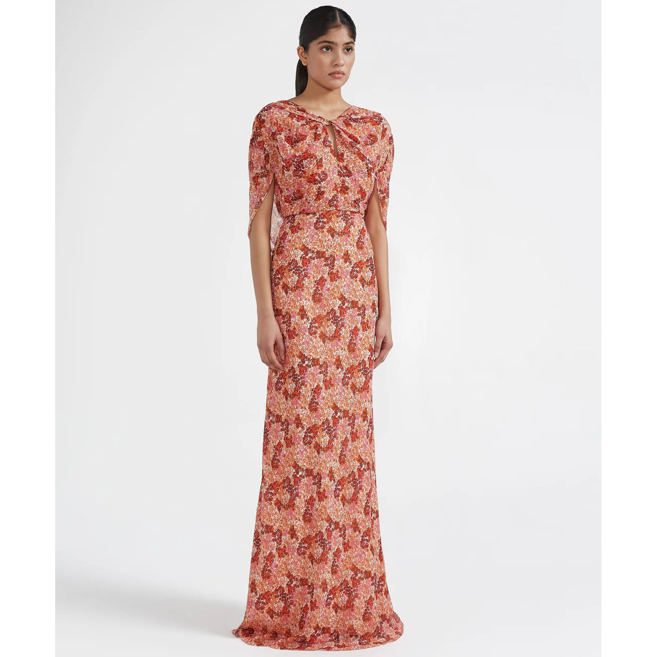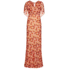 The Claudia Cape Dress is adorned with a floral silhouette in soft apricot and burnt umber hues. Featuring a delicate cape and a refined twist neckline, this design flows effortlessly for a timelessly sophisticated look. Dainty clusters of Chrysanthemums, Geraniums, and Florentina flowers intertwine beautifully, creating a tonal masterpiece.