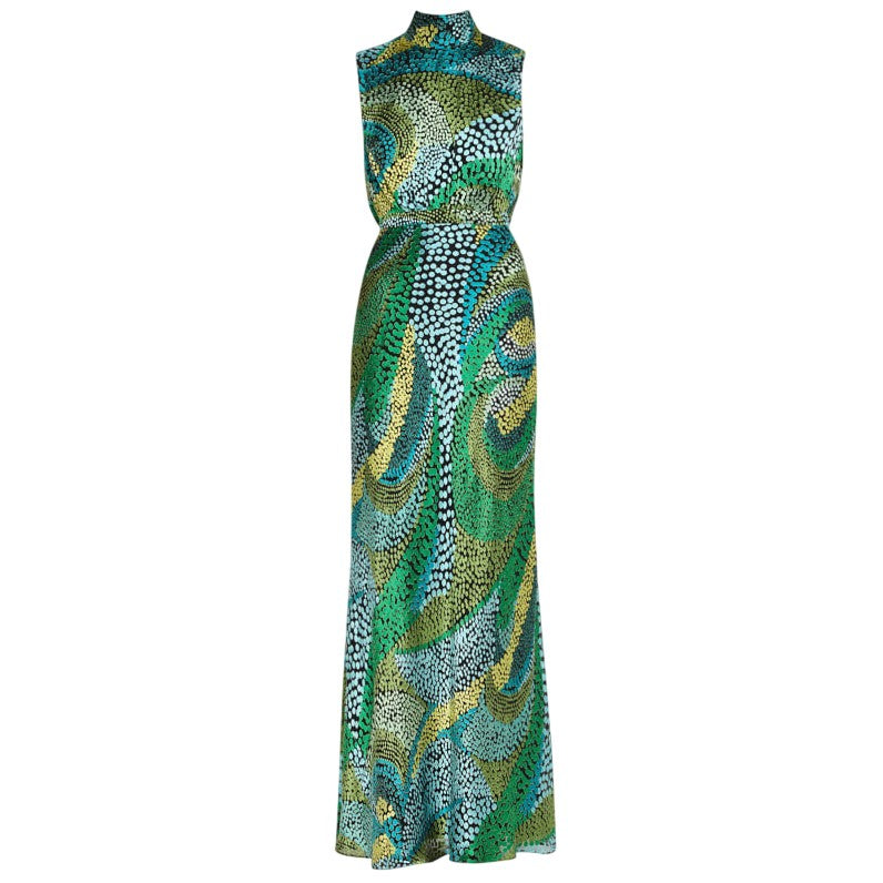 The Fleur Dress in Jungle is the ultimate statement piece for any evening affair. This stunning maxi dress features a bias cut in luxurious satin silk, designed to capture attention with every movement. Perfect for dancing the night away.