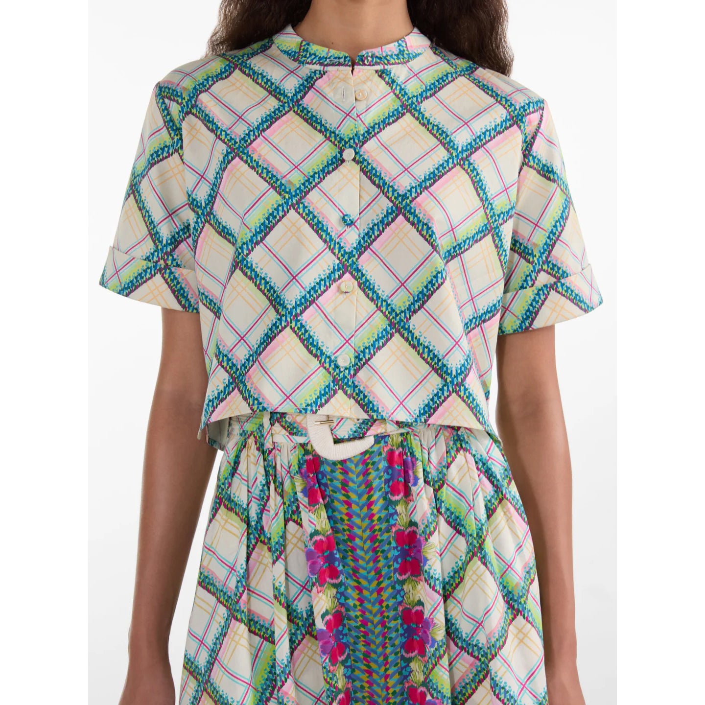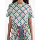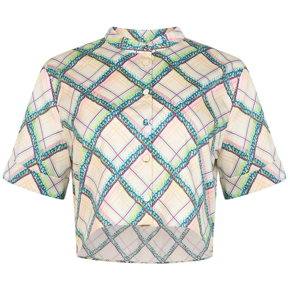 The Jude-B Shirt is a cropped, short-sleeved top designed for effortless transitional dressing. Featuring a clean mandarin collar and structured back yoke with a box pleat, it blends tailored detail with relaxed ease. The Compass Check print features soft pastel lines beneath bold, Ikat-inspired diagonals on a cream background. Pair it with the matching Judi Skirt for a contemporary, coordinated look that’s both polished and playful.