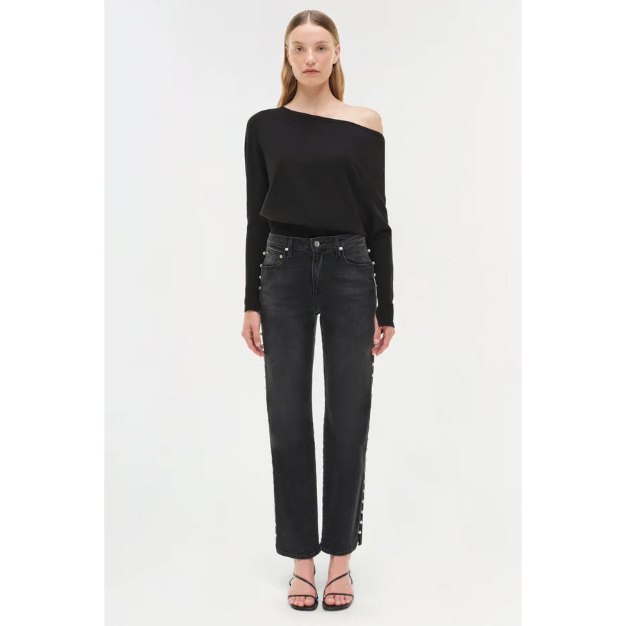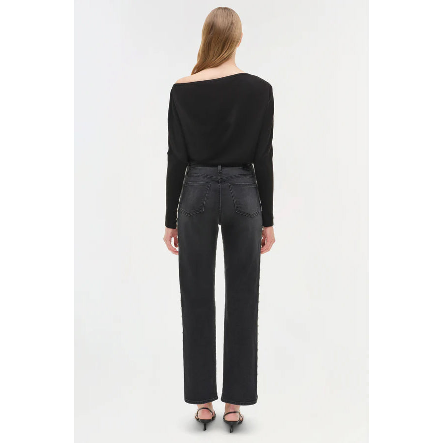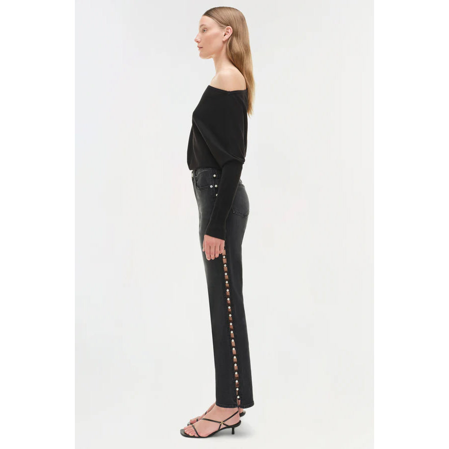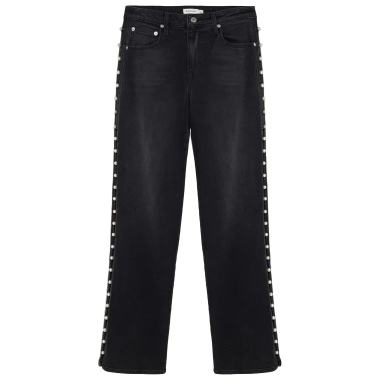 Elevate you everyday denim with the Amelia Straight Leg Pant. Designed with a timeless straight-leg silhouette, this jean combines a flattering high-rise fit with precision tailoring. Crafted in a pocket construction with pearl embellishments that cascade down the sides. it adds an elegant twist to classic black denim.