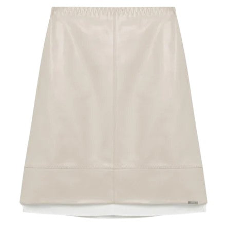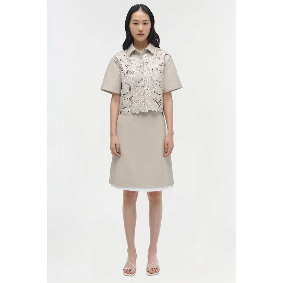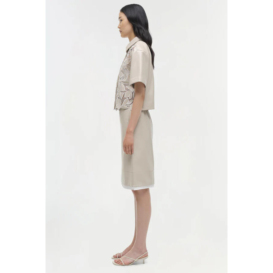 The Aubria Midi Skirt in Sand. This tailored cotton faille piece showcases a structured silhouette and refined finish.