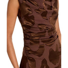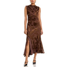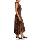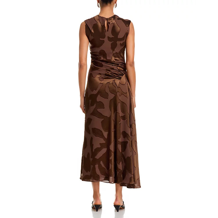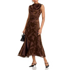 The Burke Dress in Cocoa. This sleeveless draped midi features an elegant draped design with a high neckline and a sophisticated pattern. Its sleeveless cut and fluid silhouette create a refined, timeless look.