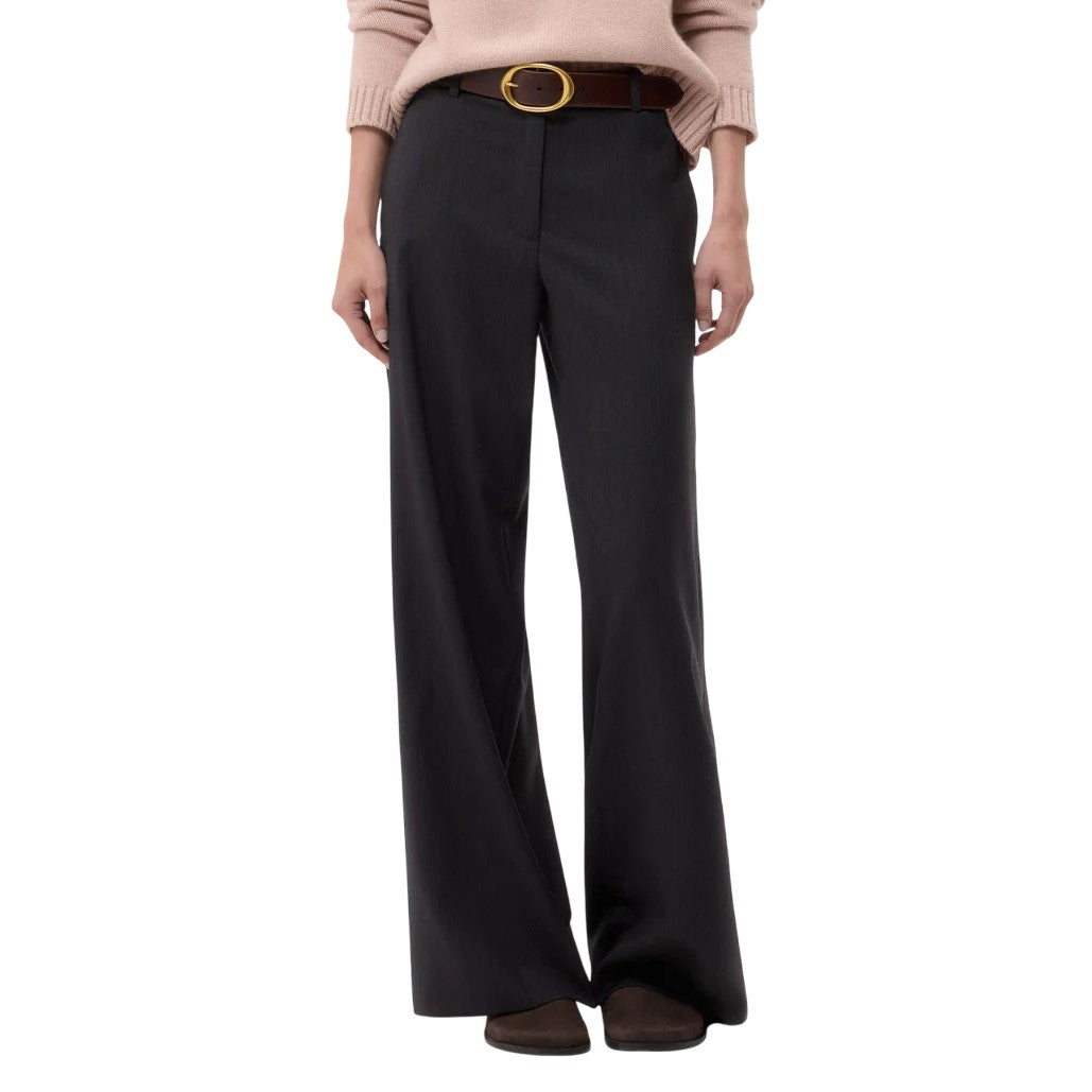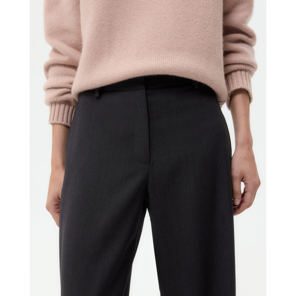 Mid-rise, flat front, straight leg suit trousers in stretch wool suiting. This fabric is a viscose/wool blend with a bit of stretch for comfort. The Downing is fitted at the hip and relaxed through the leg. Complete with side pockets, back welt pockets, concealed zip-fly and hook and eye closure.