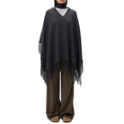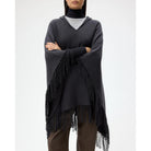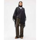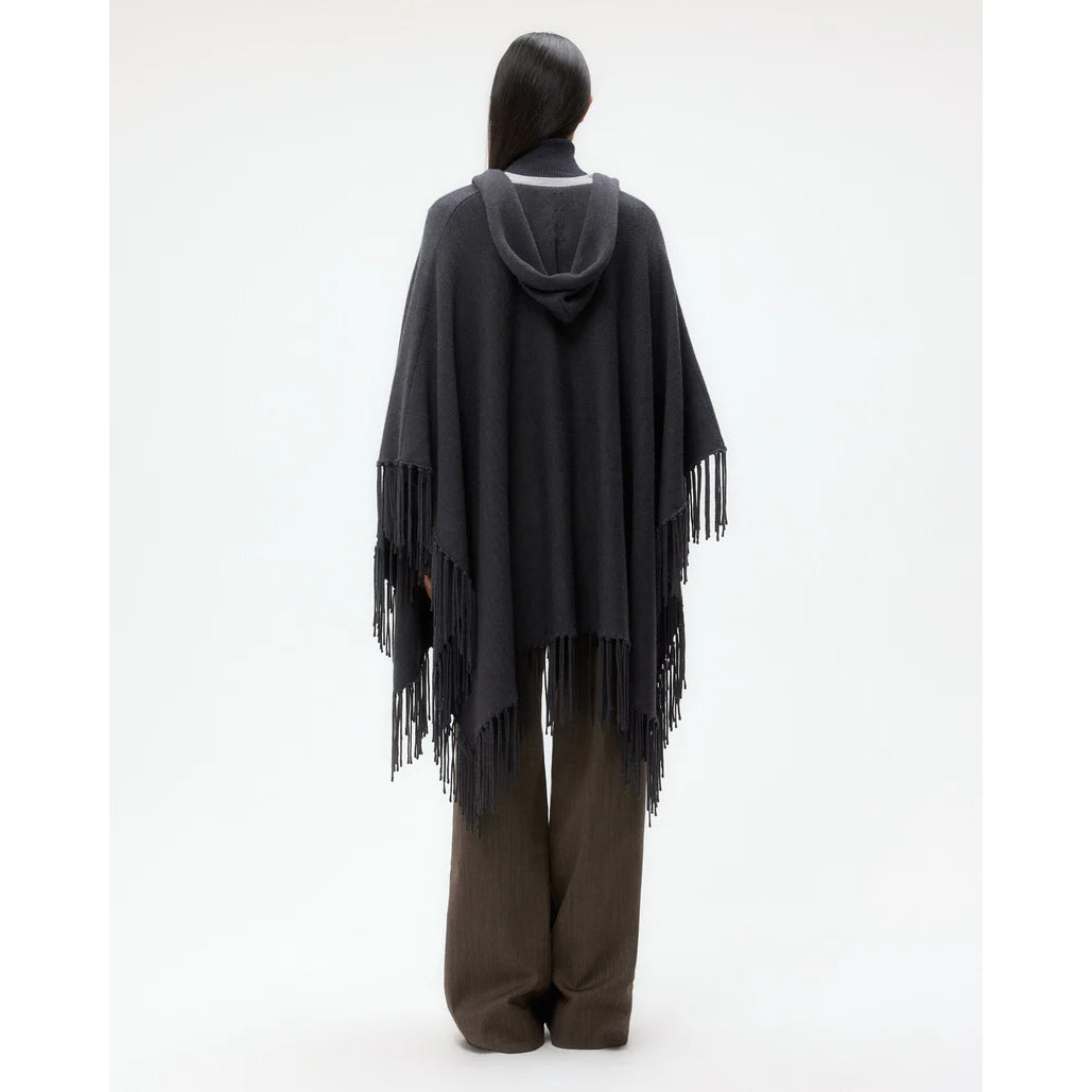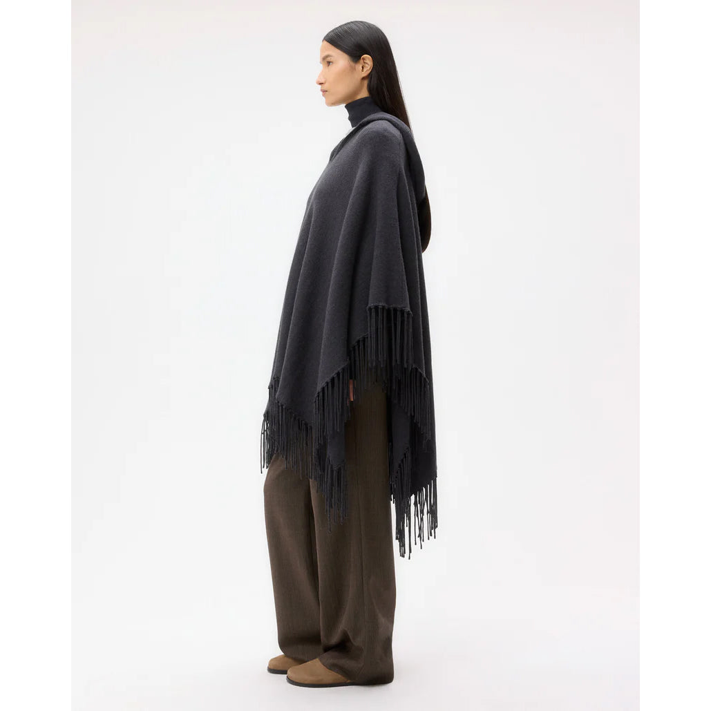 Oversized, V-neck poncho in merino wool. Take Me Home is an asymmetrical silhouette. Complete with a hood and tasselled hem.