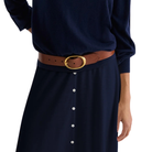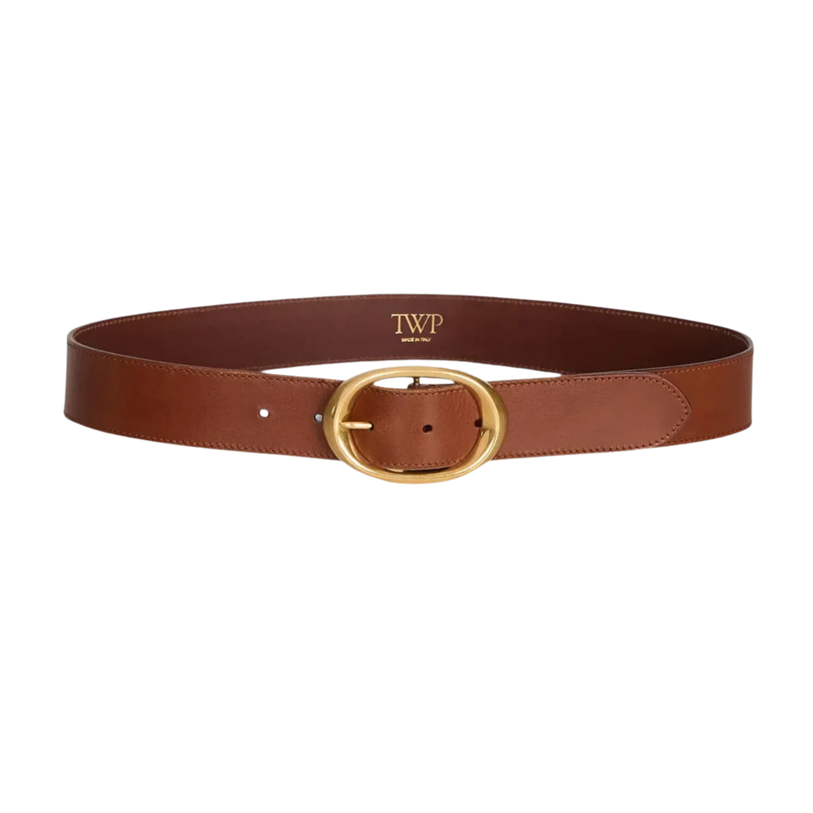 Wide belt in luxe Spanish cowhide leather that burnishes and softens over time. The Wide belt has a strap that will contour to the natural shape of your body with use. Accented with a custom molded brass buckle, coated with an antique gold finish. Made in Italy.