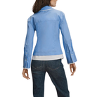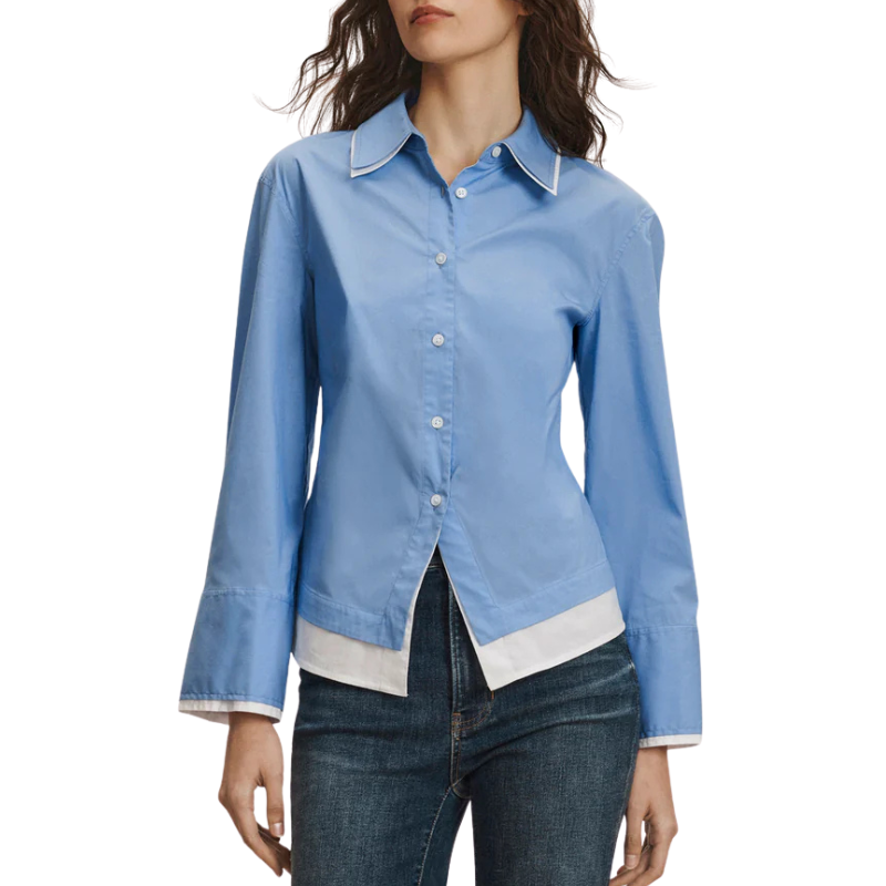A white underlay at the trim creates a built-in layered effect, while wide, cuffed sleeves complete the look.