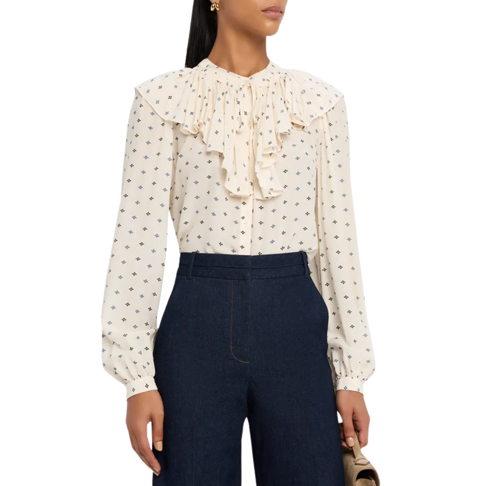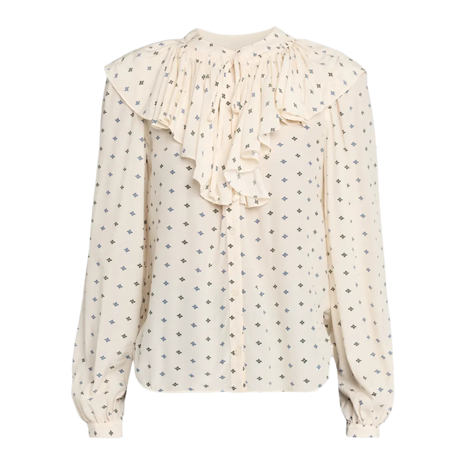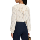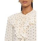 Veronica Beard "Gomez" printed blouse adorned with cascading ruffles that frame the yoke.