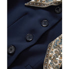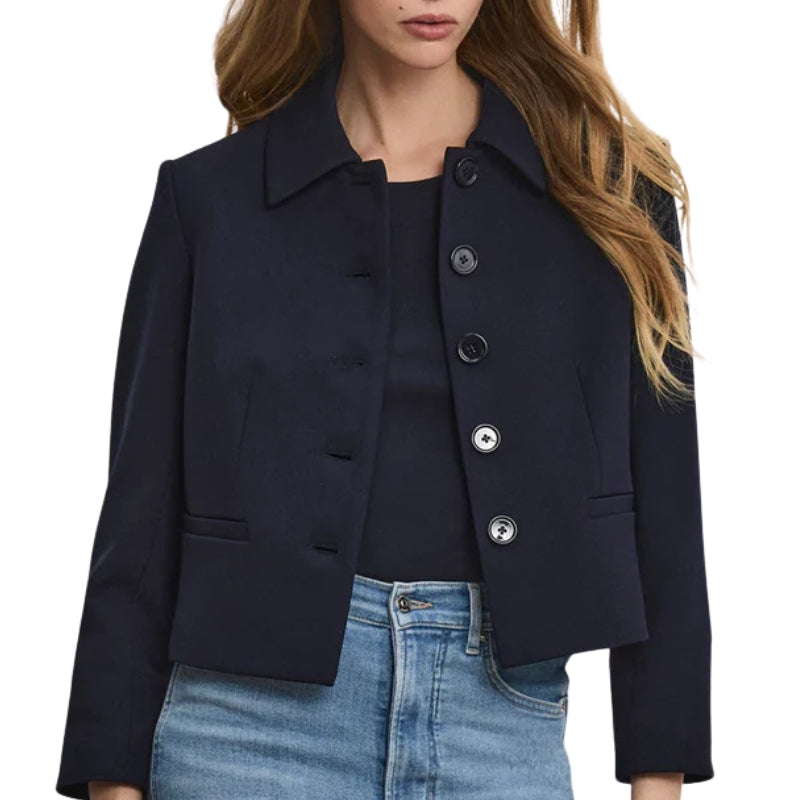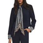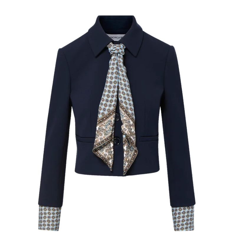 The Ismena navy jacket combines structure with comfortable stretch. Featuring a removable custom-printed foulard scarf tie and matching removable peekaboo cuffs, it offers versatile styling options. Designed with a cropped, single-breasted silhouette, it’s finished with a classic point collar and welt pockets. Easily dressed up or down, pair it with trousers or denim.