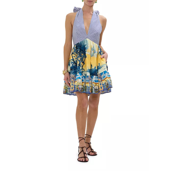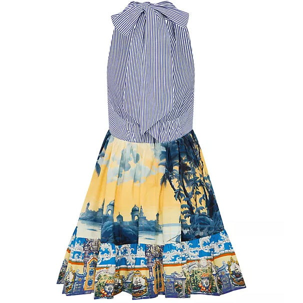 Crafted of cotton, this Camilla dress highlights a seersucker striped halterneck bodice and a full skirt adorned with an intricate Italian landscape scene.