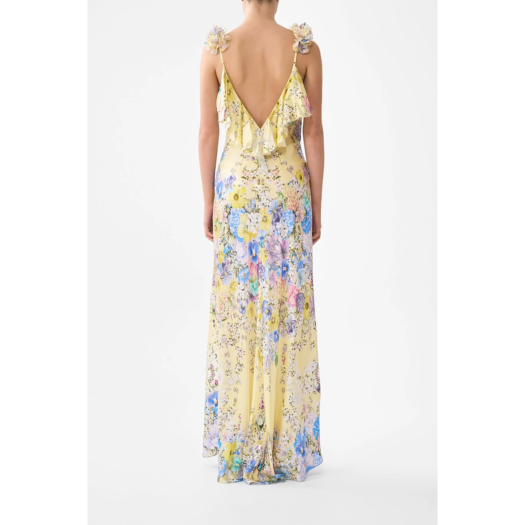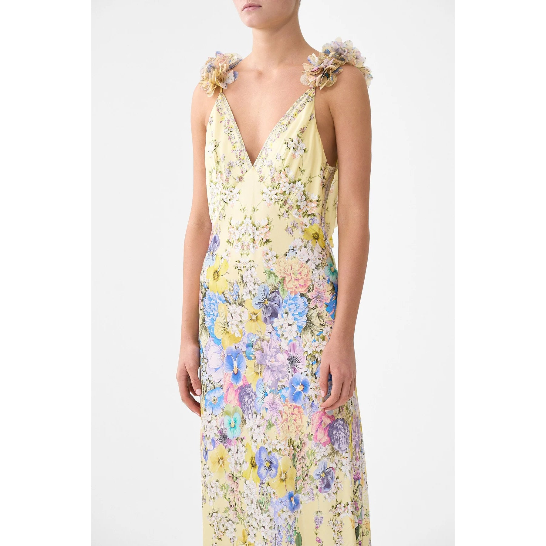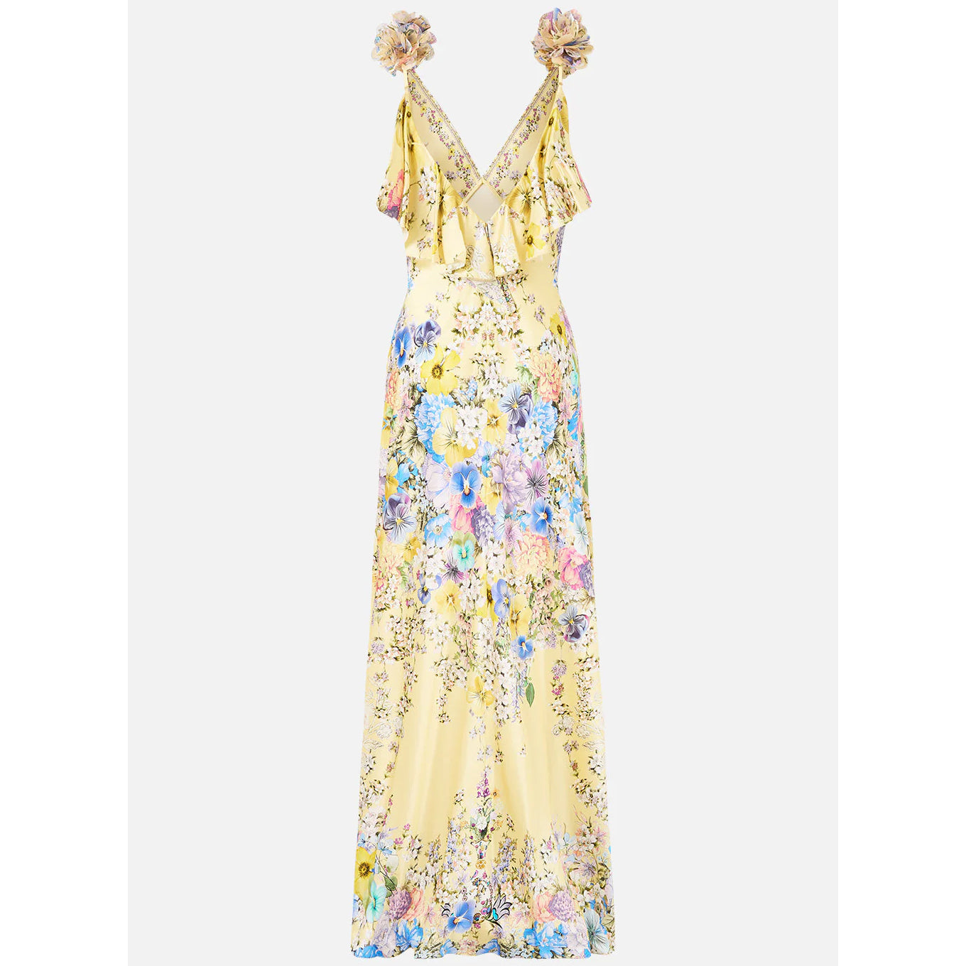 The Darling Buds V Neck Bias Slip Dress With Back Frill is a handcrafted silk silhouette designed by Camilla's in house artisans. Reimagined in an exclusive limited edition print, this sumptuous slip dress is cut on the bias to accentuate the natural curves of the feminine form. It features a V neckline and low back with ruffle detailing, while 3D silk flowers and intricately placed crystal embellishments add decadent accents to this opulent piece.
