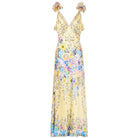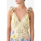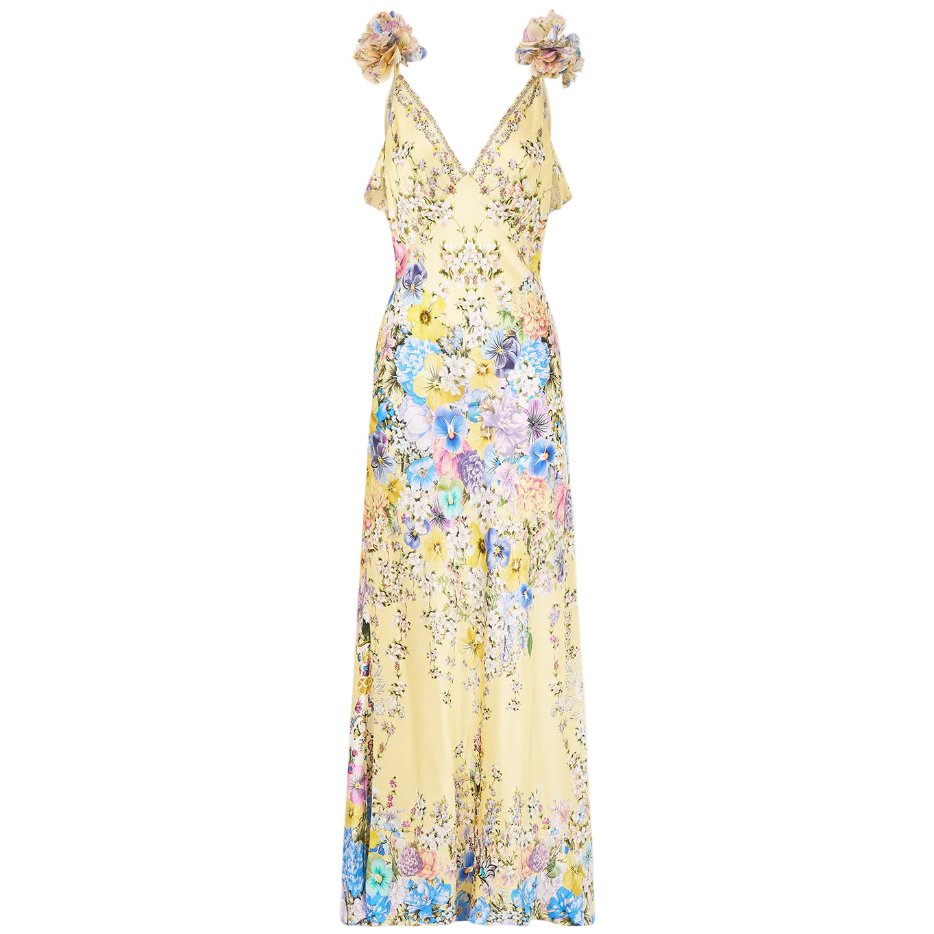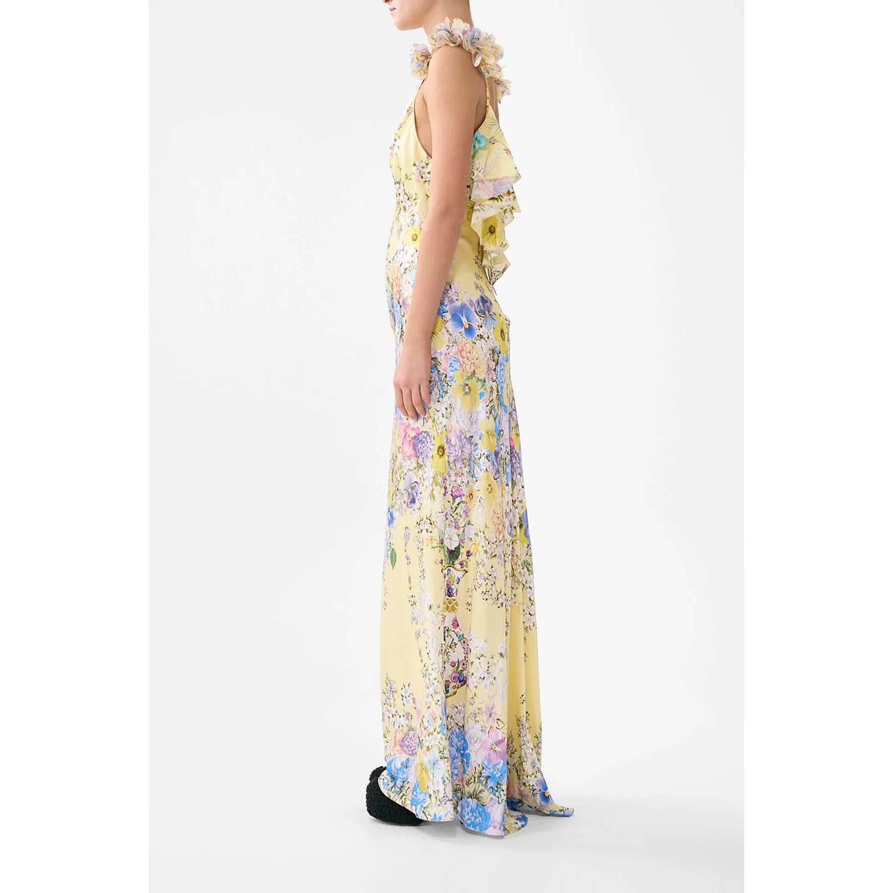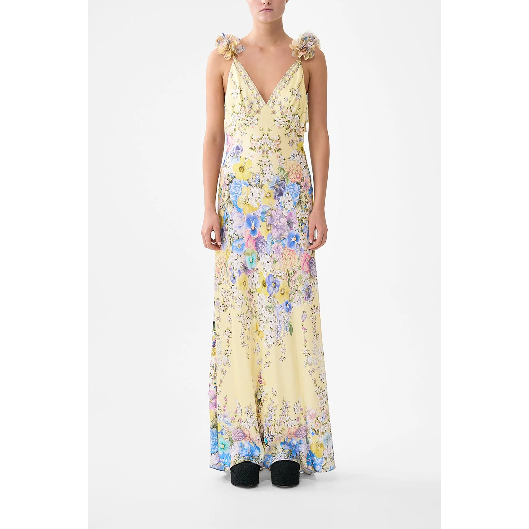 The Darling Buds V Neck Bias Slip Dress With Back Frill is a handcrafted silk silhouette designed by Camilla's in house artisans. Reimagined in an exclusive limited edition print, this sumptuous slip dress is cut on the bias to accentuate the natural curves of the feminine form. It features a V neckline and low back with ruffle detailing, while 3D silk flowers and intricately placed crystal embellishments add decadent accents to this opulent piece.