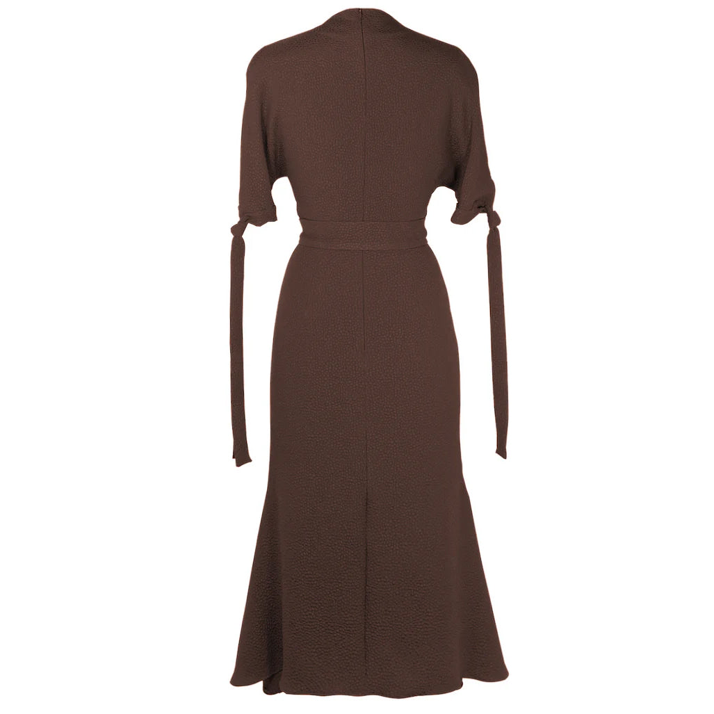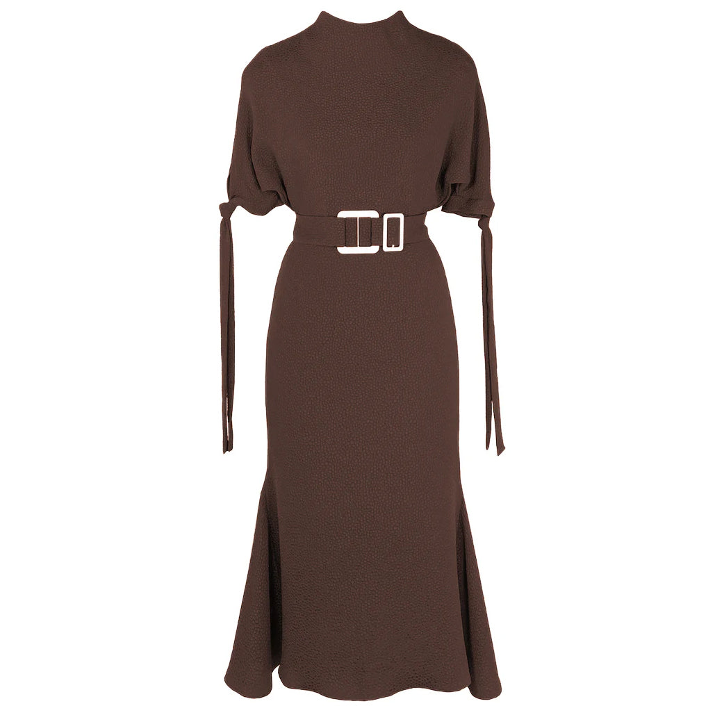 The Pedernal Dress has ease and elegance to its fit, with a loose fitting bodice, high neck, and an adjustable tie closure at the elbow. The skirt has a slim line that flares at the midi-length hem. Also features a removable self belt with snap closure and Italian hand-covered Ivory Georgette Champion buckle with gold hardware.