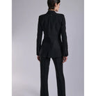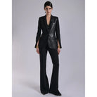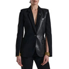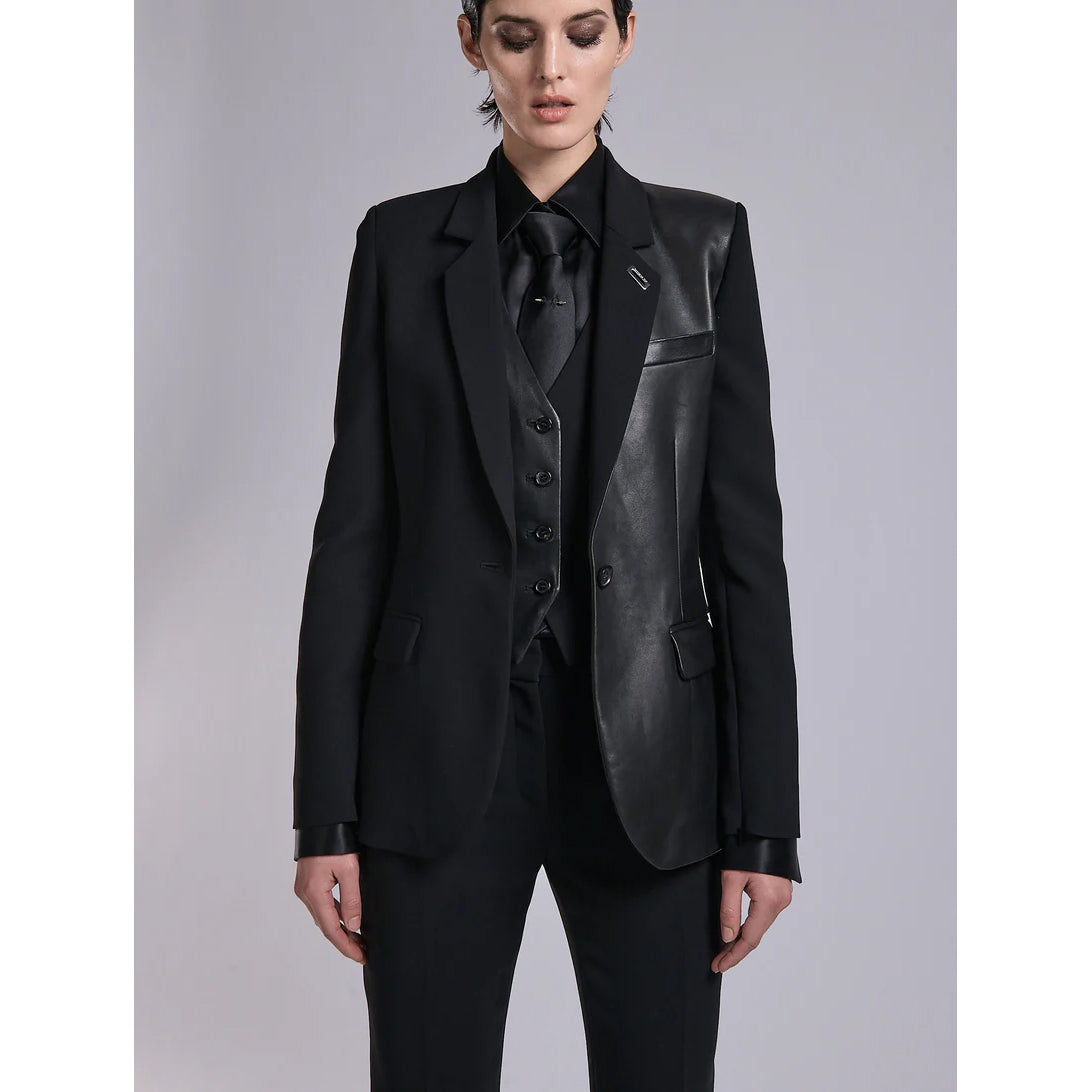 This tailored blazer plays with contrast in a bold duo of black crepe and smooth leather — a testament to our atelier’s tailoring expertise. Its “sharp and cut” fitted shape enhances the silhouette, while the mix of materials adds visual depth and a bold statement. Worn directly on the skin or over the matching waistcoat, this fitted blazer embodies sharp and daring femininity. Its zipped cuffs, punctuated with discreet buttonholes, allow total freedom of wear. The signature piercing detail and a Milanese loop in silver metal complete this singular piece, emblematic of the house’s liberated and rock-inspired wardrobe.