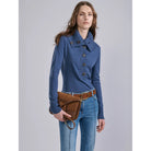 This merino knit sweater, with its chunky winter sweater-inspired volume, offers a lighter reinterpretation with a ribbed collar and placket for an elegant textural effect. This versatile model, buttoned from the chest to the top of the collar, can be worn as a turtleneck or with its collar open thanks to its two buttons. Refined laddering on the front and back adds to the femininity of this women's sweater, available in black or denim blue merino wool.