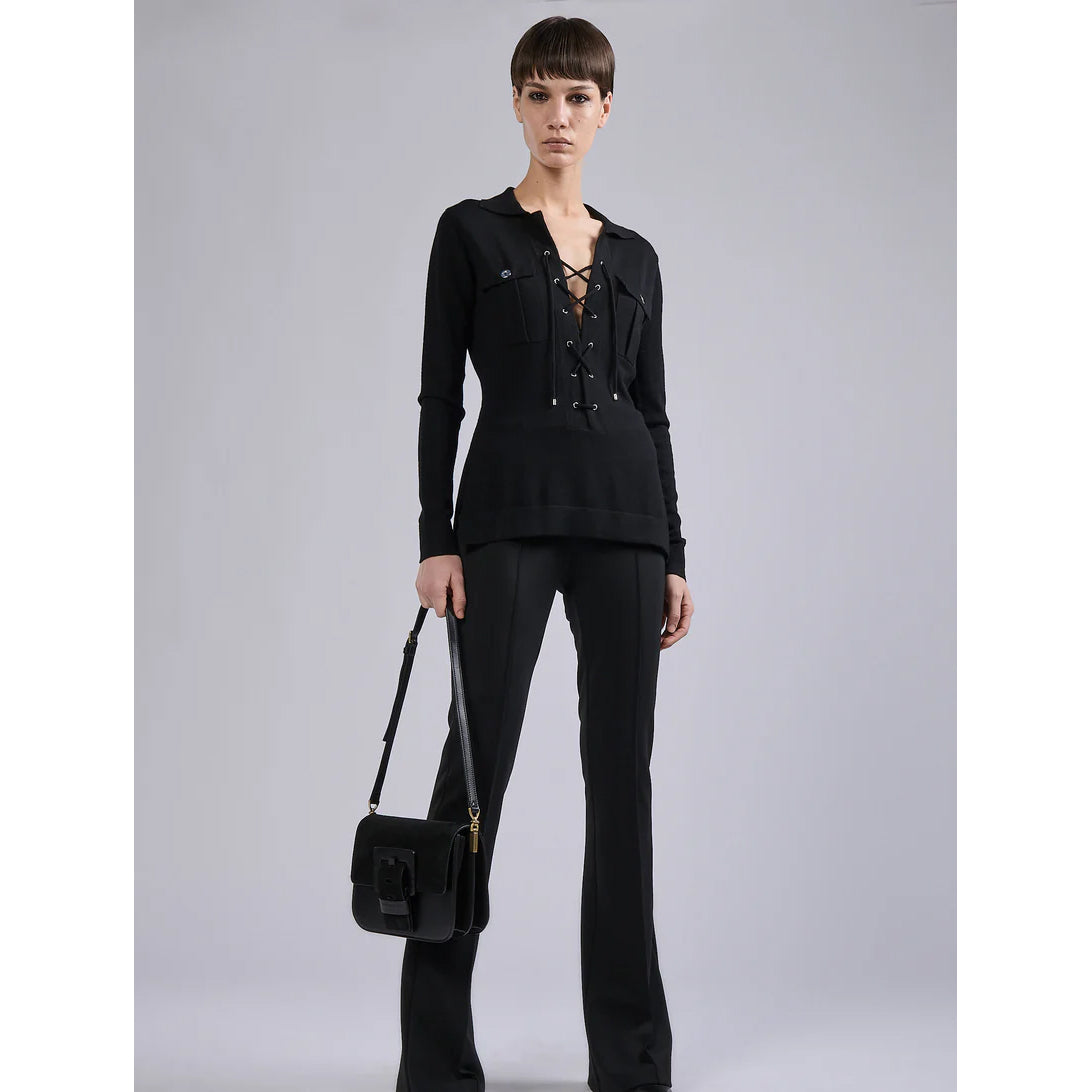 The saharienne, a women's wardrobe icon usually reserved for warm weather, is reinvented in a luxurious merino knit version for warm, comfortable wear. This saharienne sweater features lacing that can be worn more or less half-open thanks to its drawstrings, and two patch pockets closed by elegant buttons. With its slim fit and adjustable neckline, this saharienne sweater is a feminine asset for everyday wear, paired with jeans or bootleg shorts in milano for a sculptural silhouette.