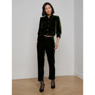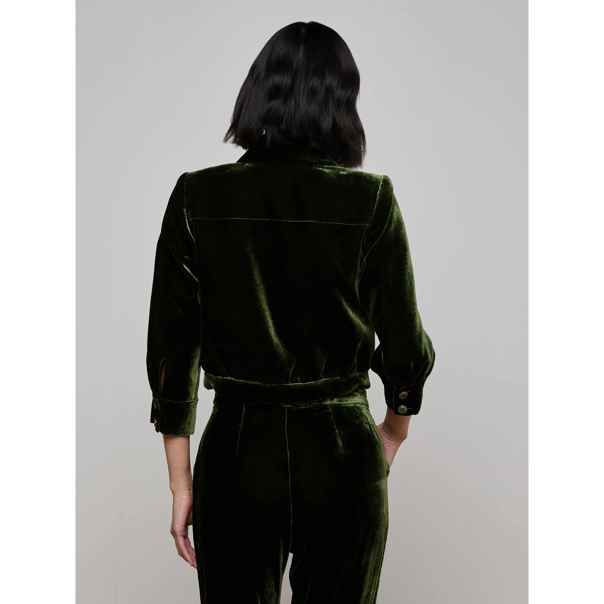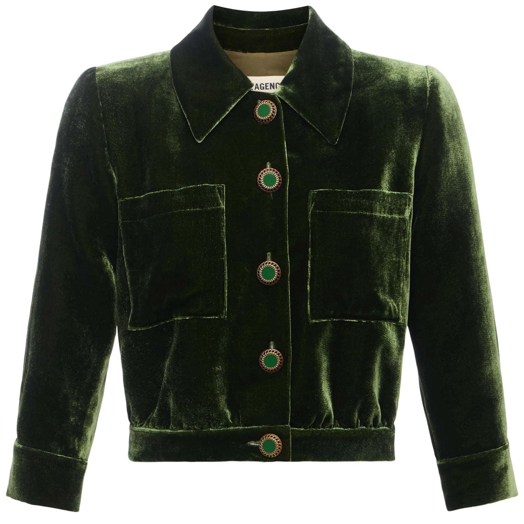 A ladylike, three-quarter sleeve jacket crafted from plush olive green velvet and finished in a chic, cropped length. Wear the Jia as a top or second layer.